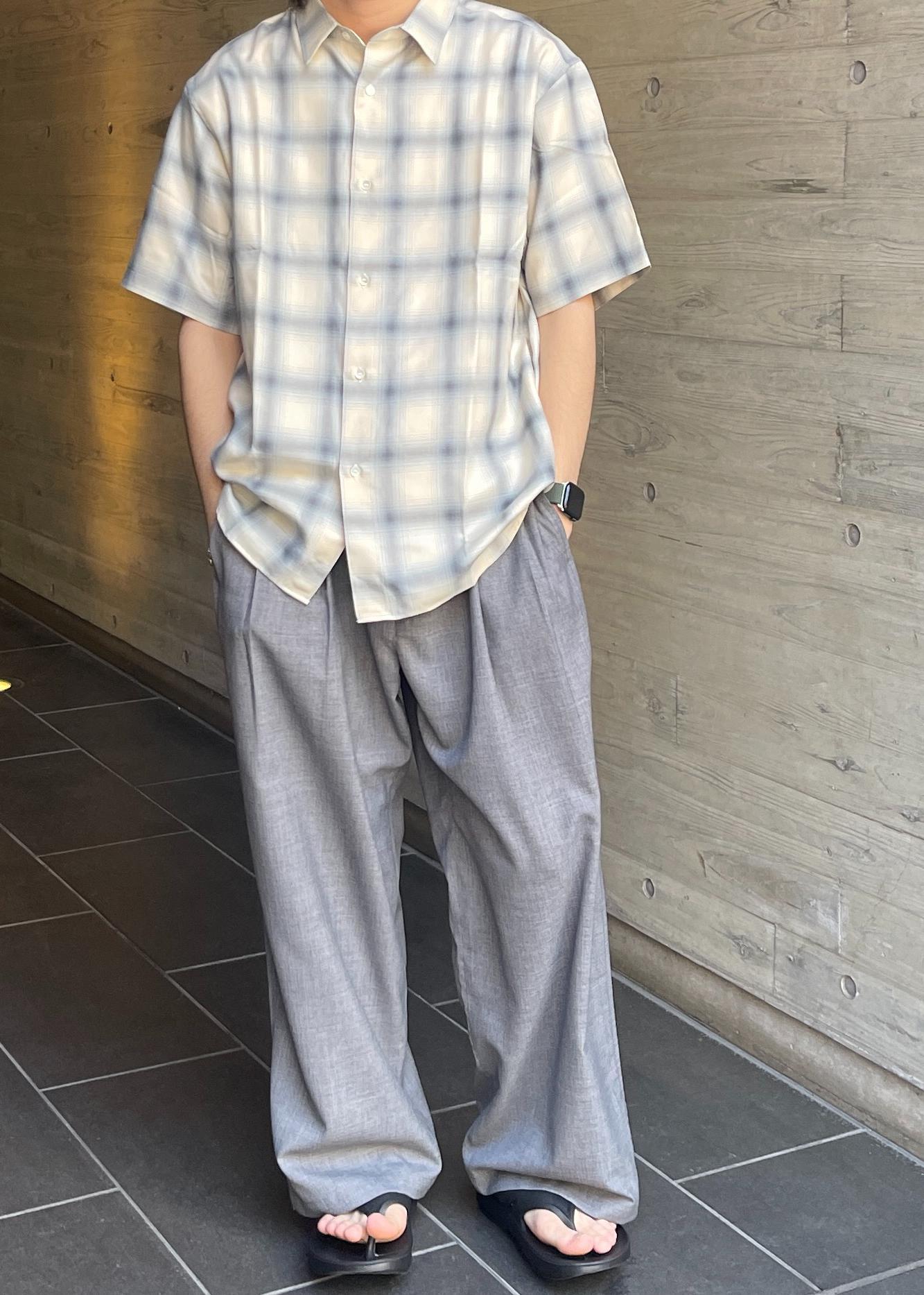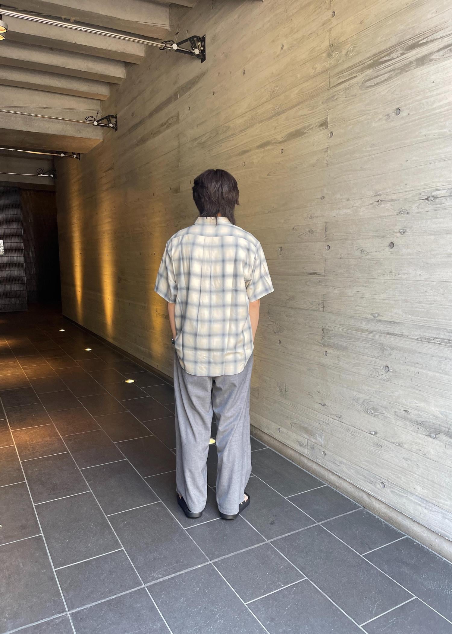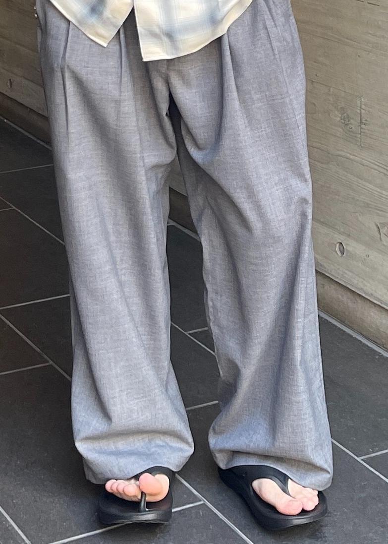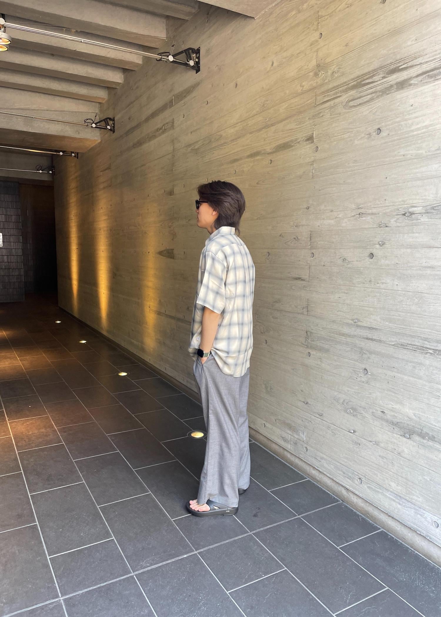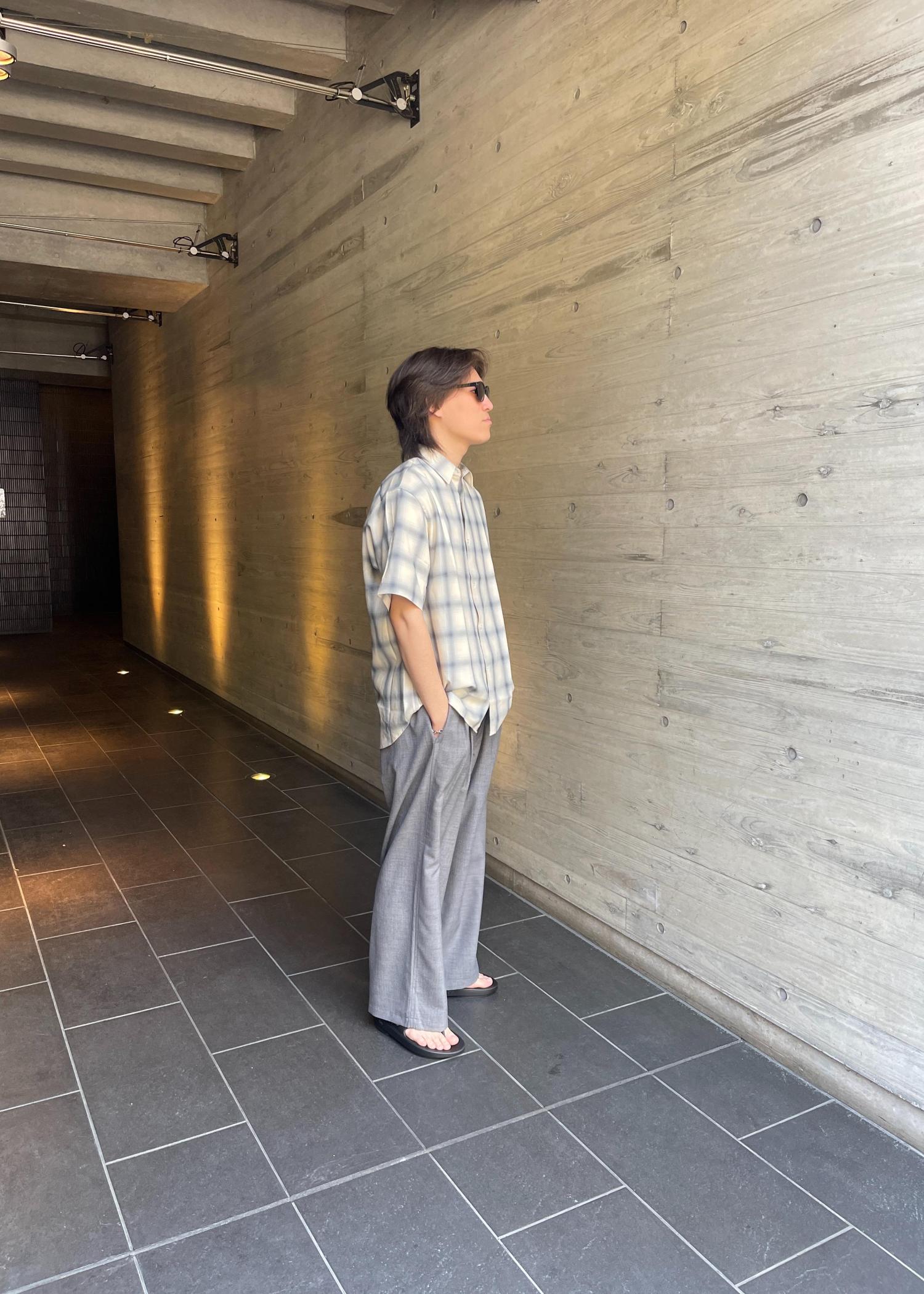 以前紹介したスラックスは今回グレー使ってみました!流行りのワイドシルエットで足元溜まるのがオススメ!