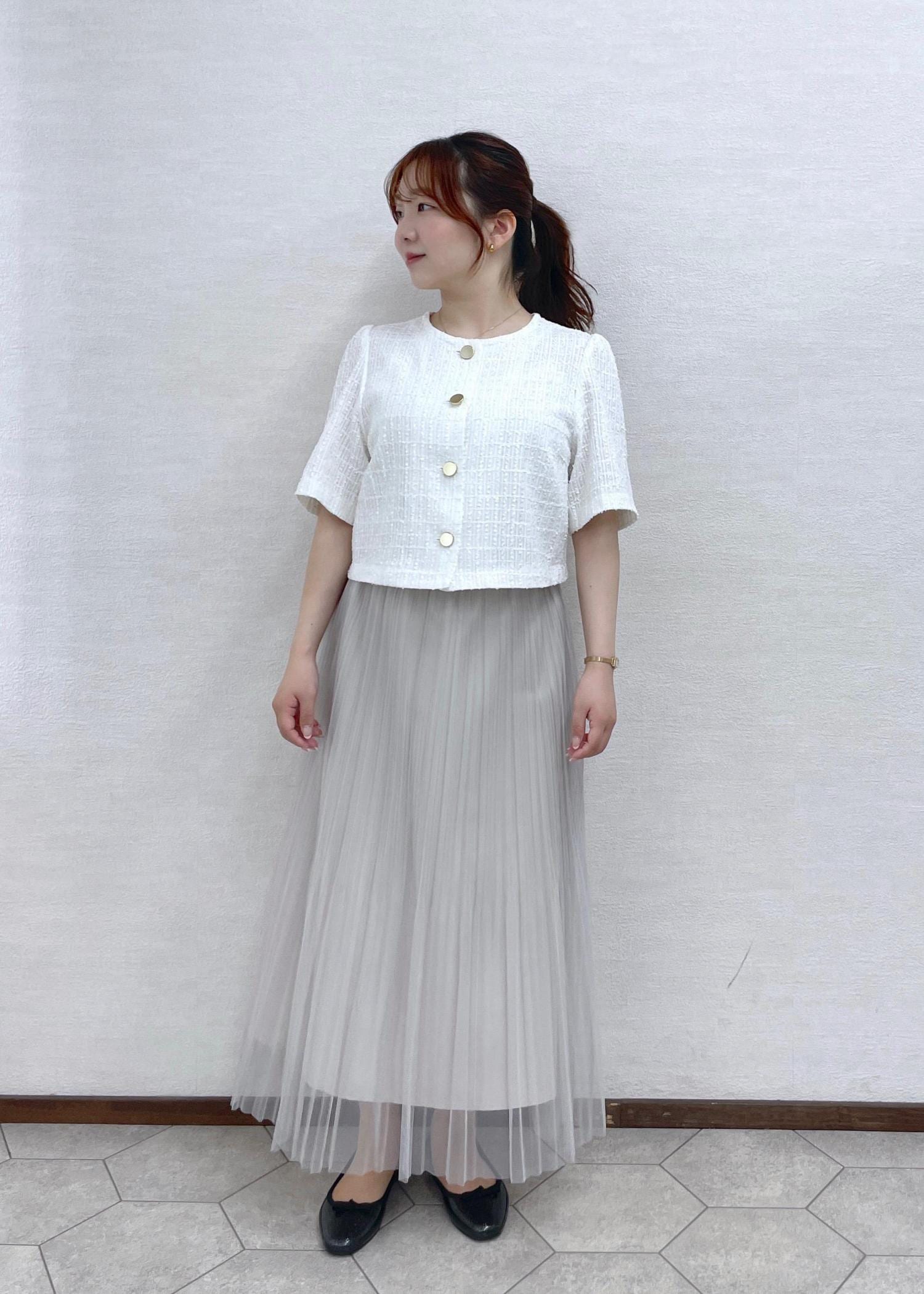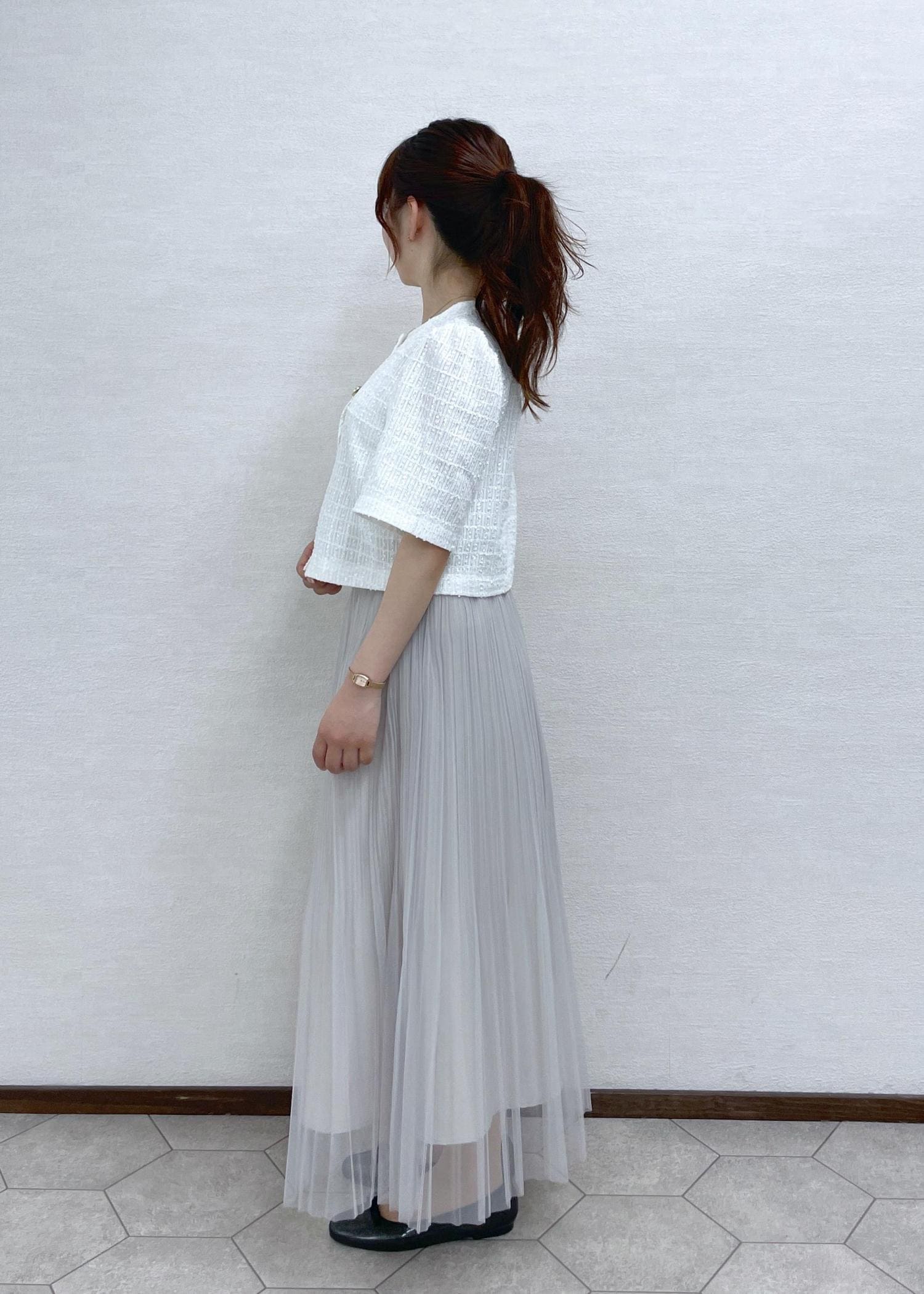 ホワイトやグレーで全体をワントーンでまとめることで、落ち着いた雰囲気になるので、幅広いシーンで着ていただけます♪