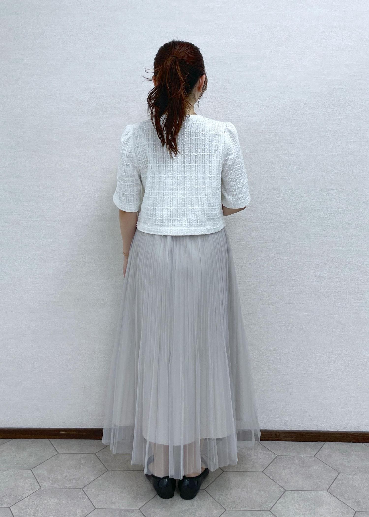 可愛いツイードトップスにグレーのフレアスカートを合わせて上品なコーデにしました!