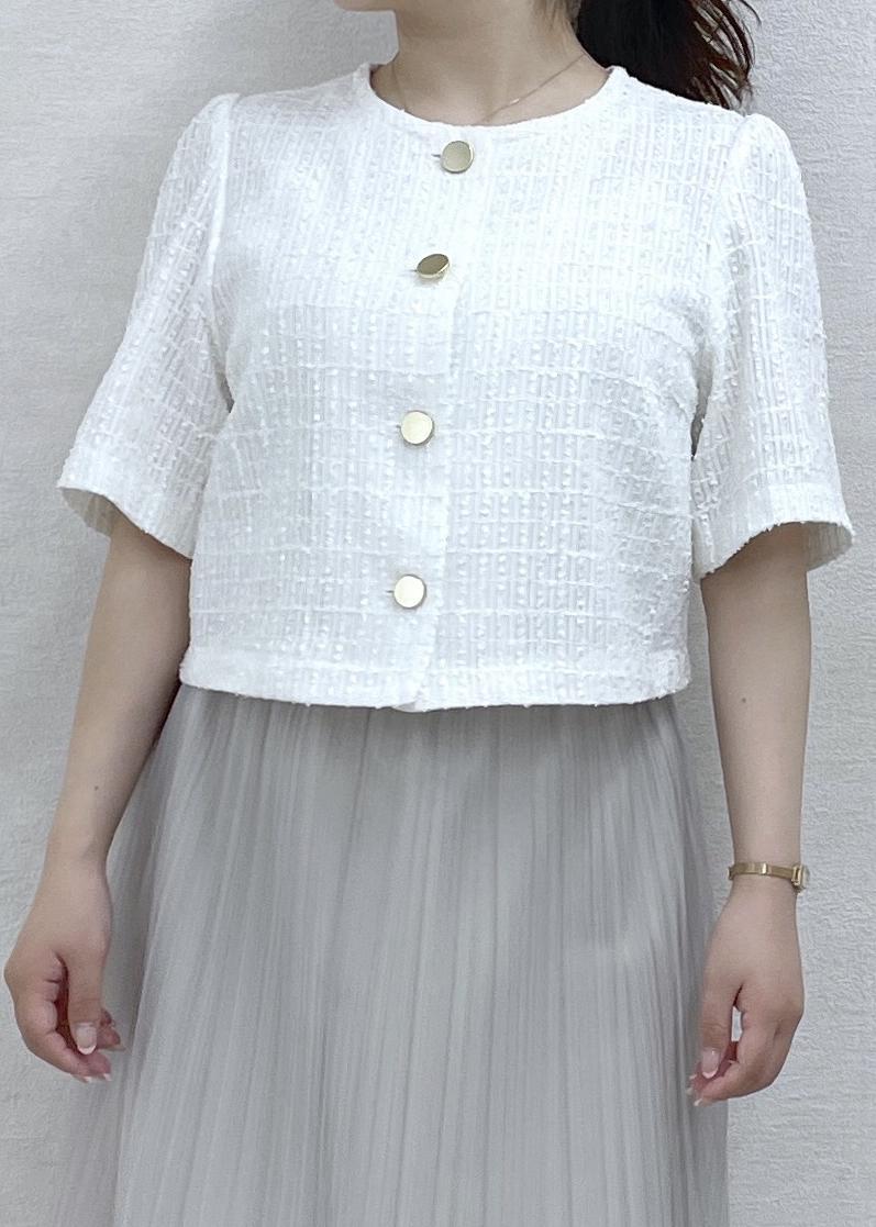 夏でも涼しく着られるツイード素材で、前を開けてジャケットとしても、1枚でトップスとしても楽しめます!きちんと感がありつつ、肩にギャザーが入っていてふんわりとした袖なので可愛らい印象にもなります♪短めの丈でスタイルアップも叶います✨ -
