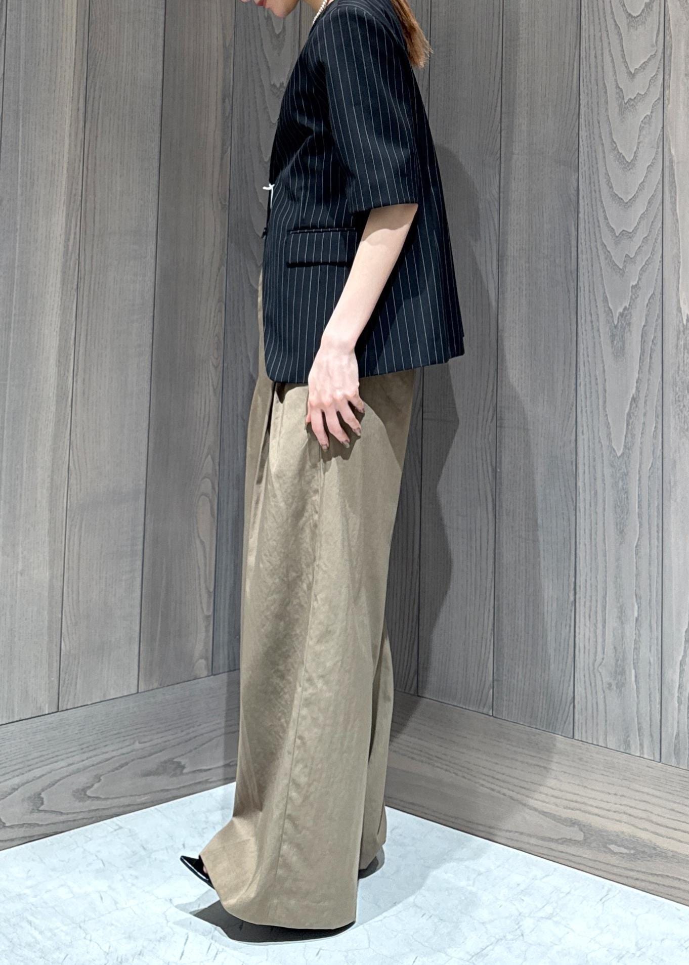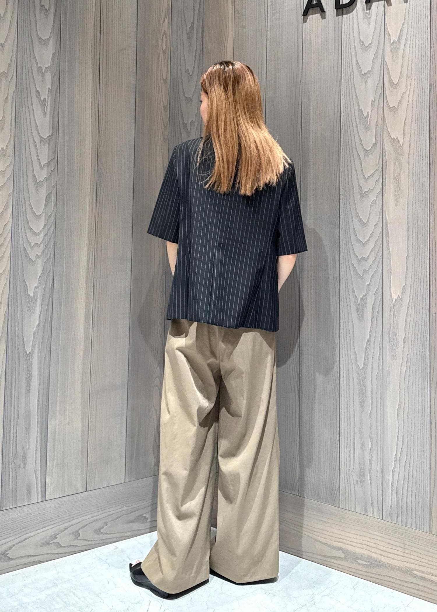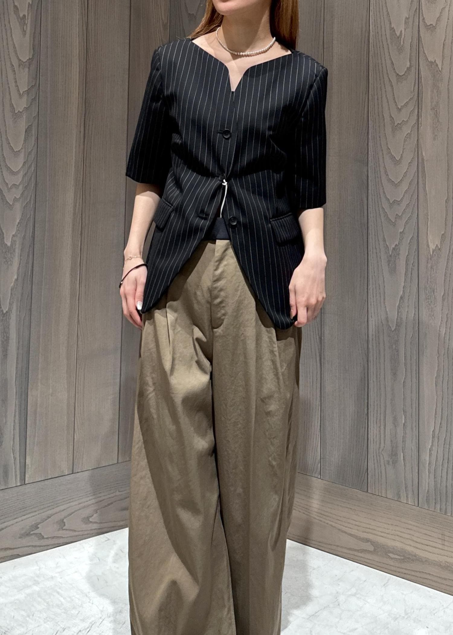首元のデザインが素敵なハーフスリーブジャケットとドレスパンツを合わせたコーデです!