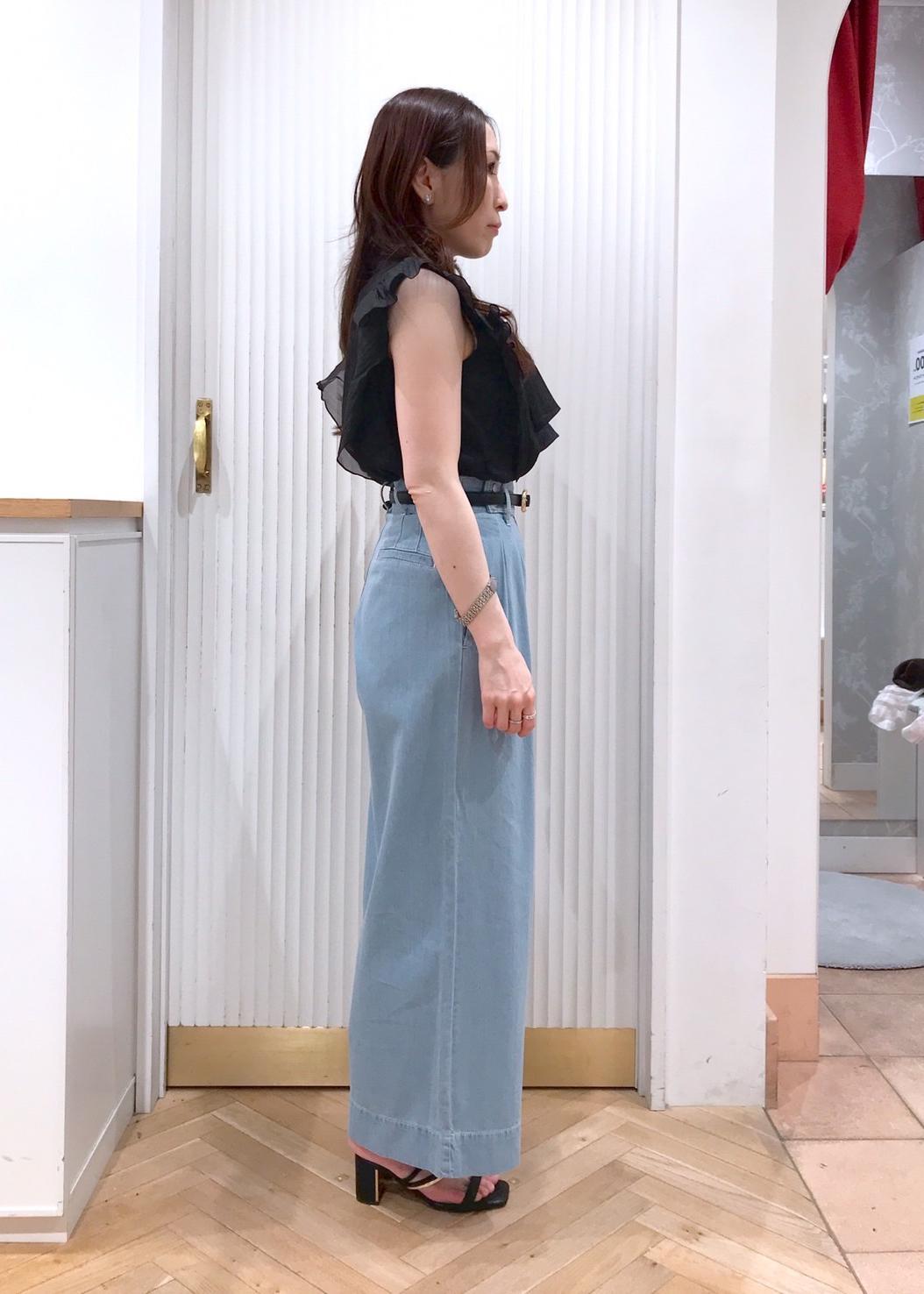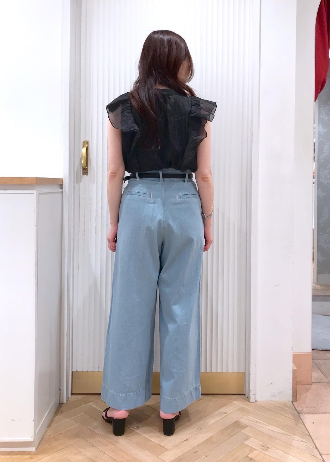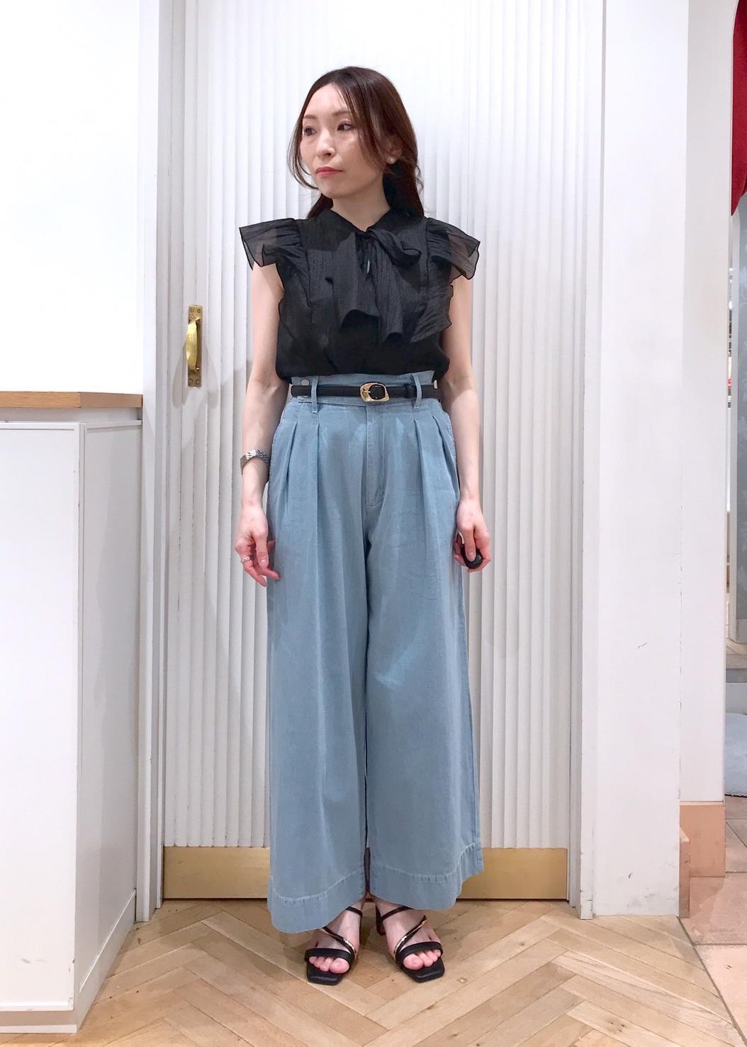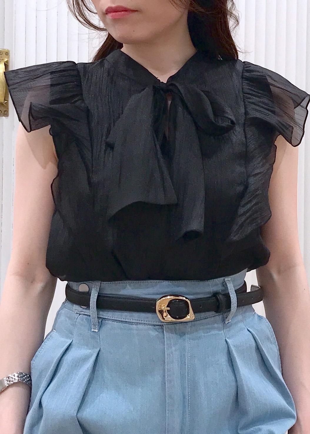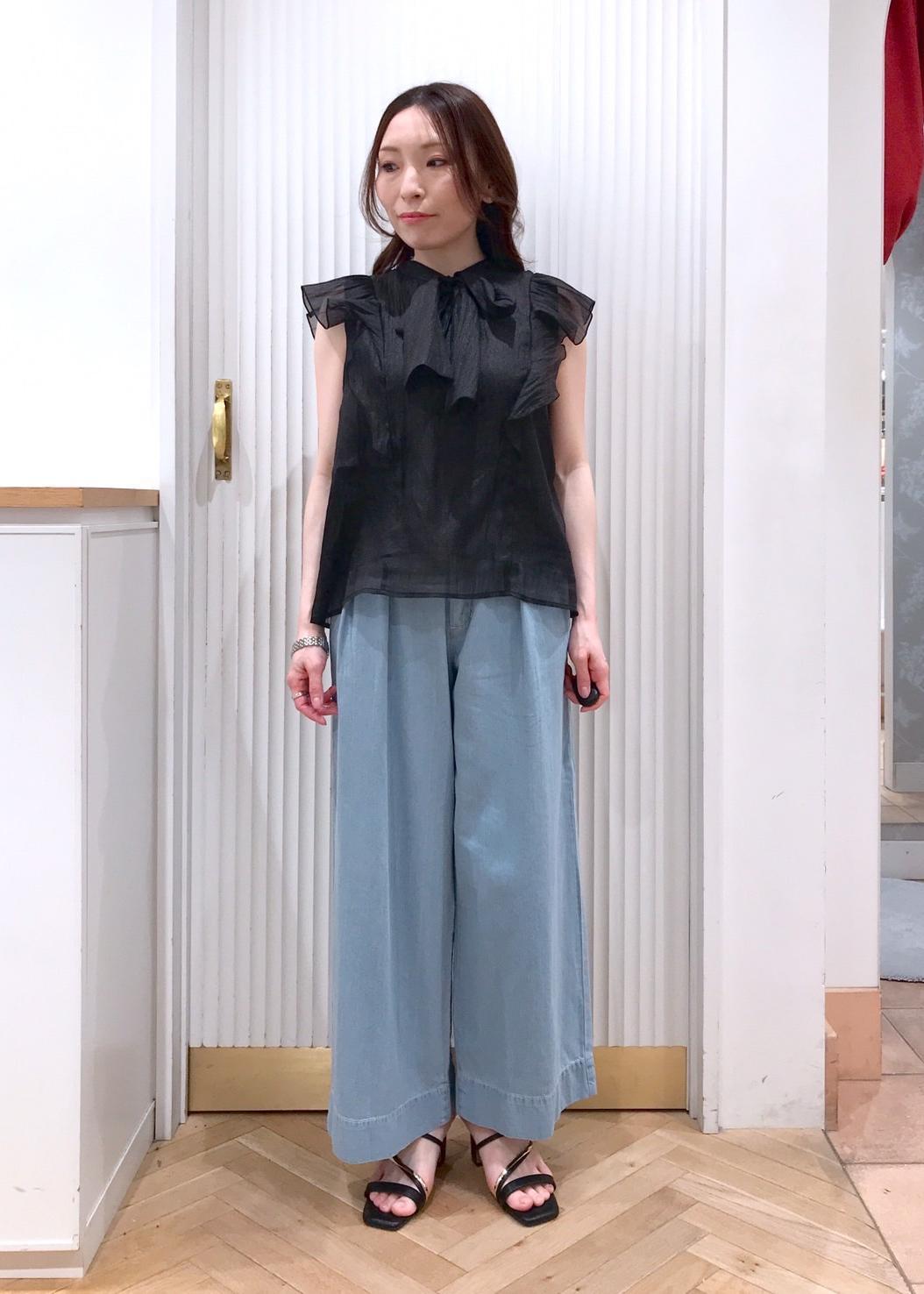 ボウタイやオーガンジー素材が可愛いブラウスをワイドデニムに合わせて甘さ控えめに。