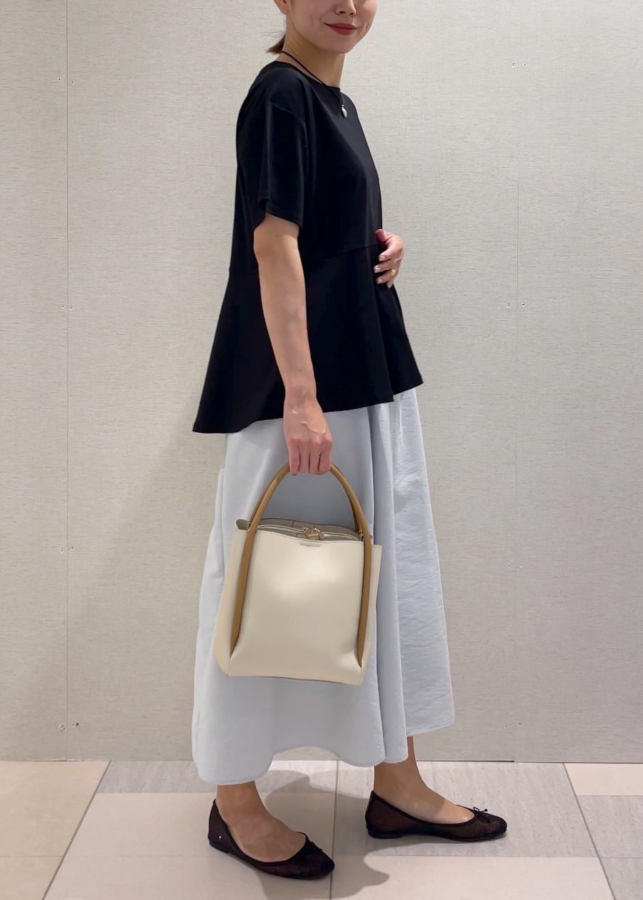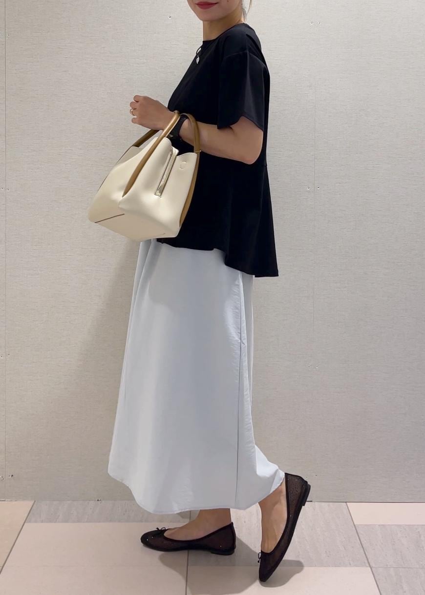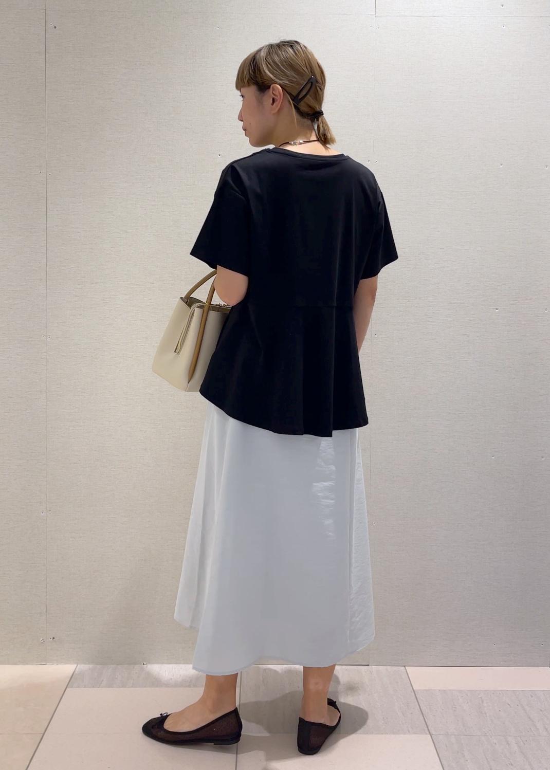 シンプルでありつつもシルエットが印象的なTシャツとスカートを合わせて綺麗めに仕上げてみました✴︎