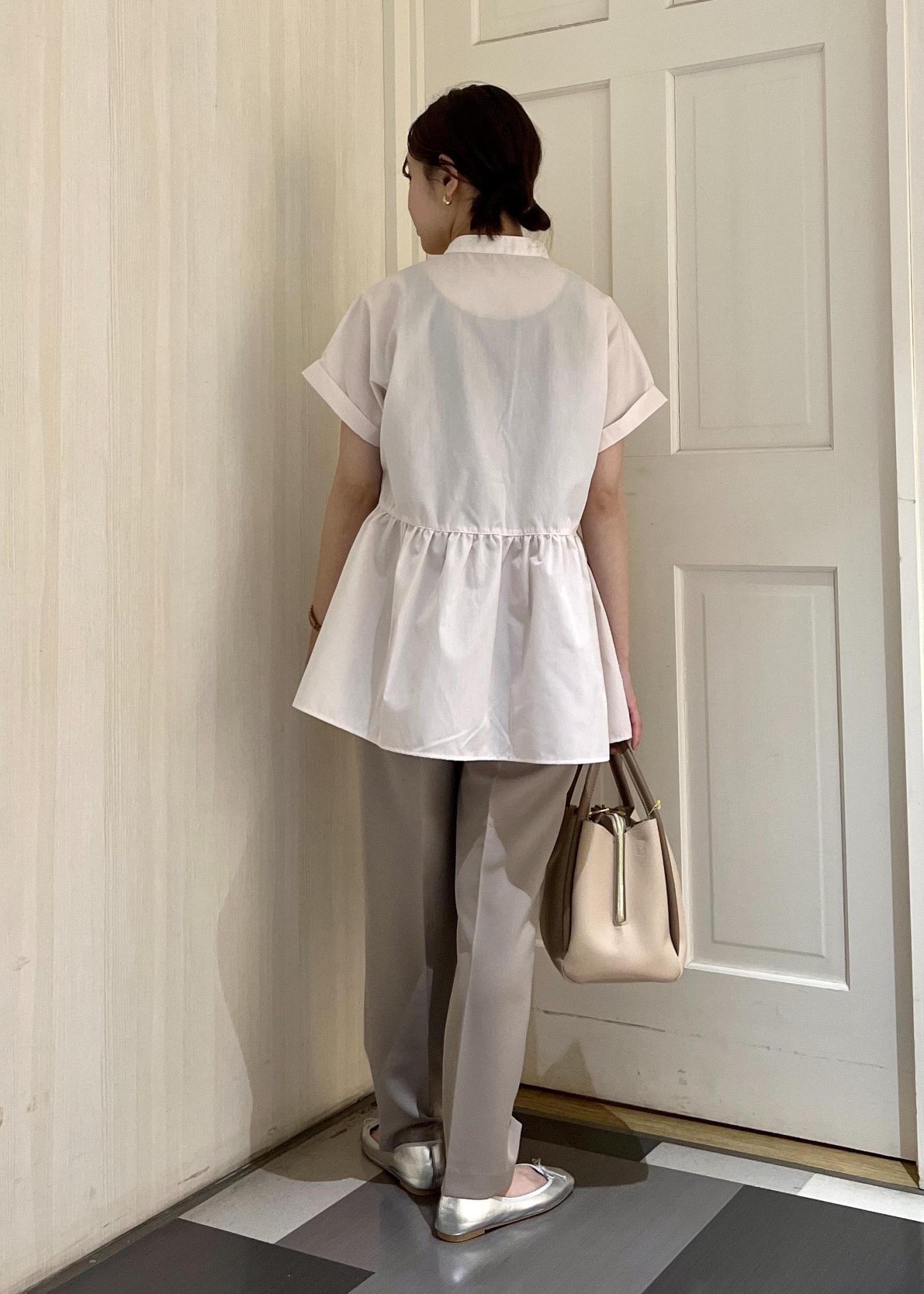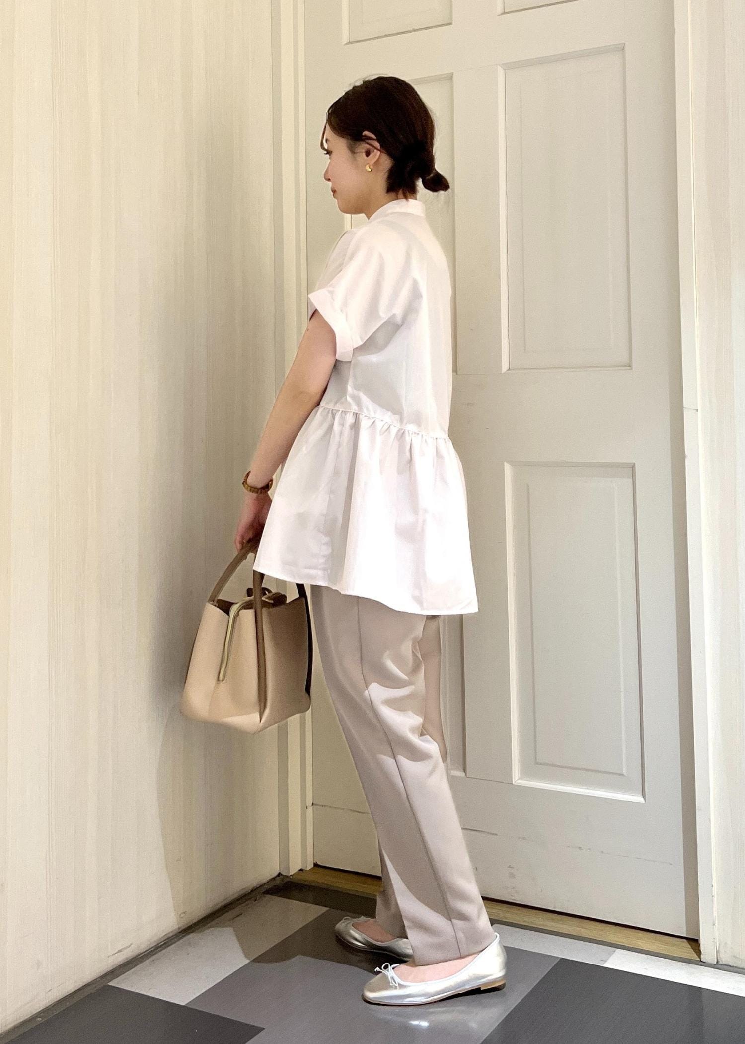 ペプラムブラウスにテーパードパンツを合わせたきれいめコーデです。