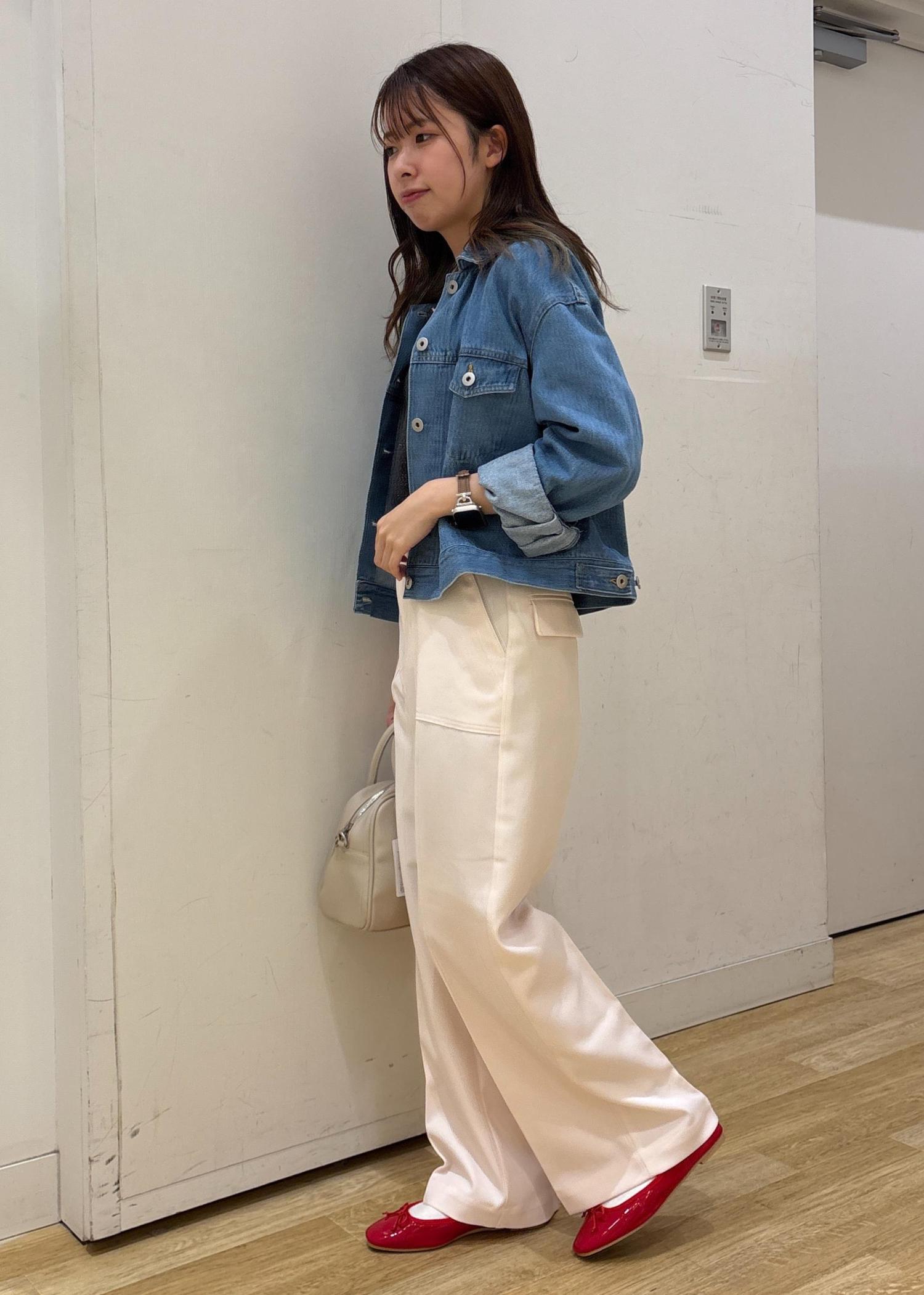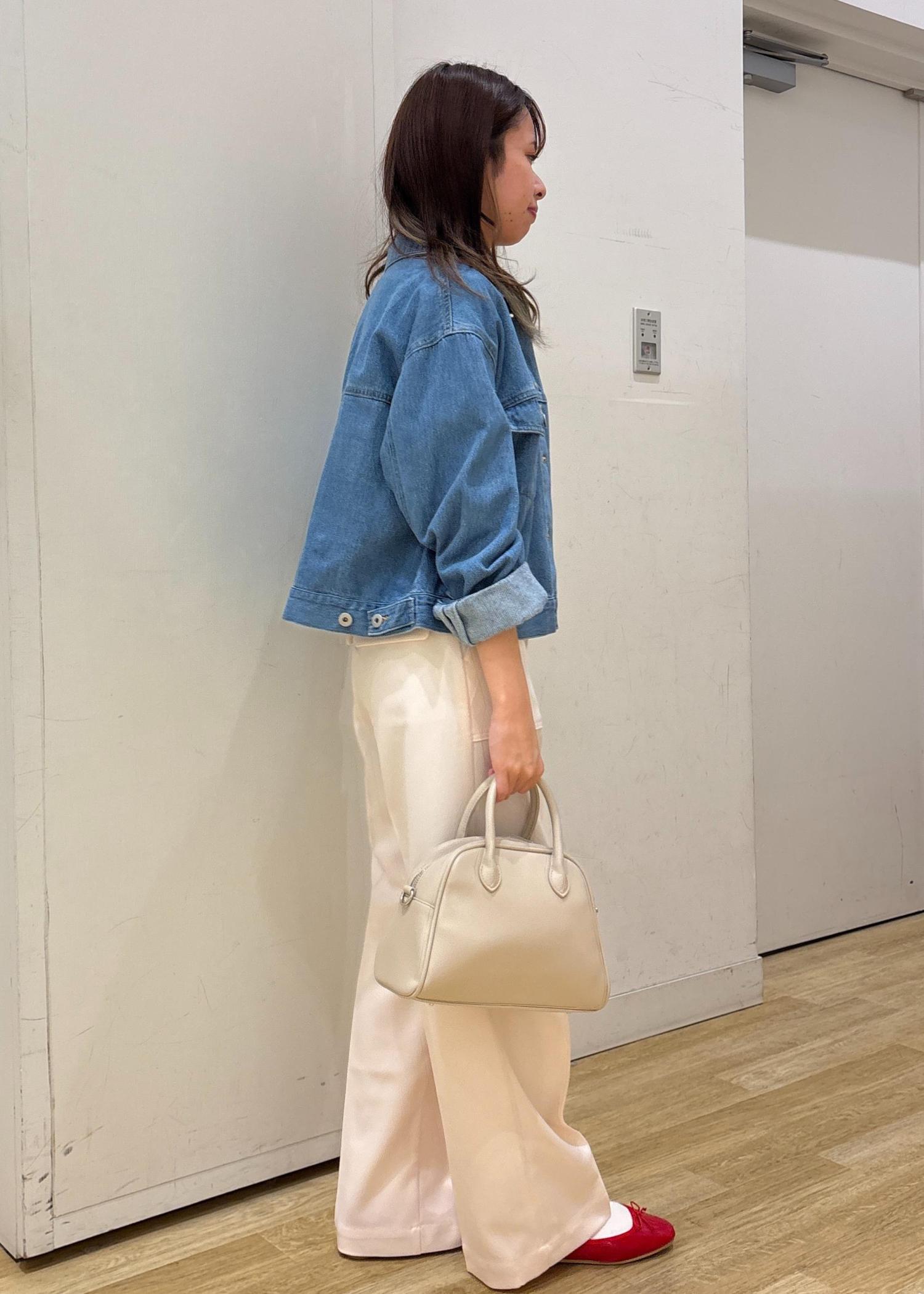 ピンクのカラーパンツに、デニムジャケットを合わせて大人カジュアルなコーデにしました!