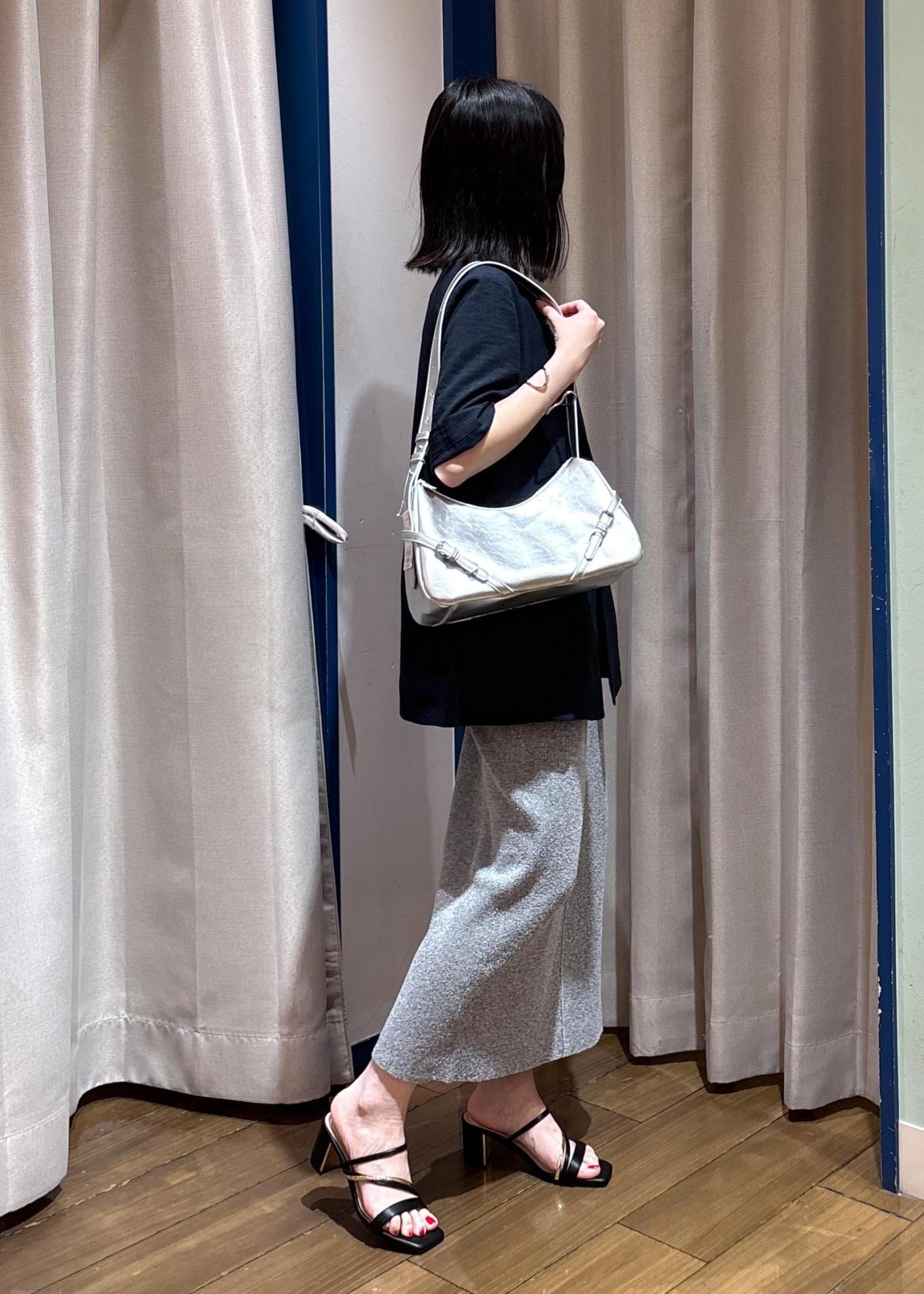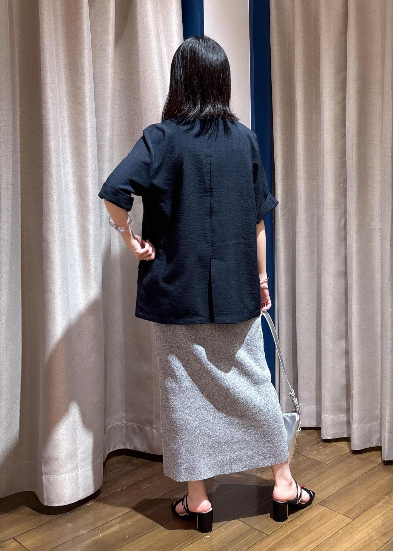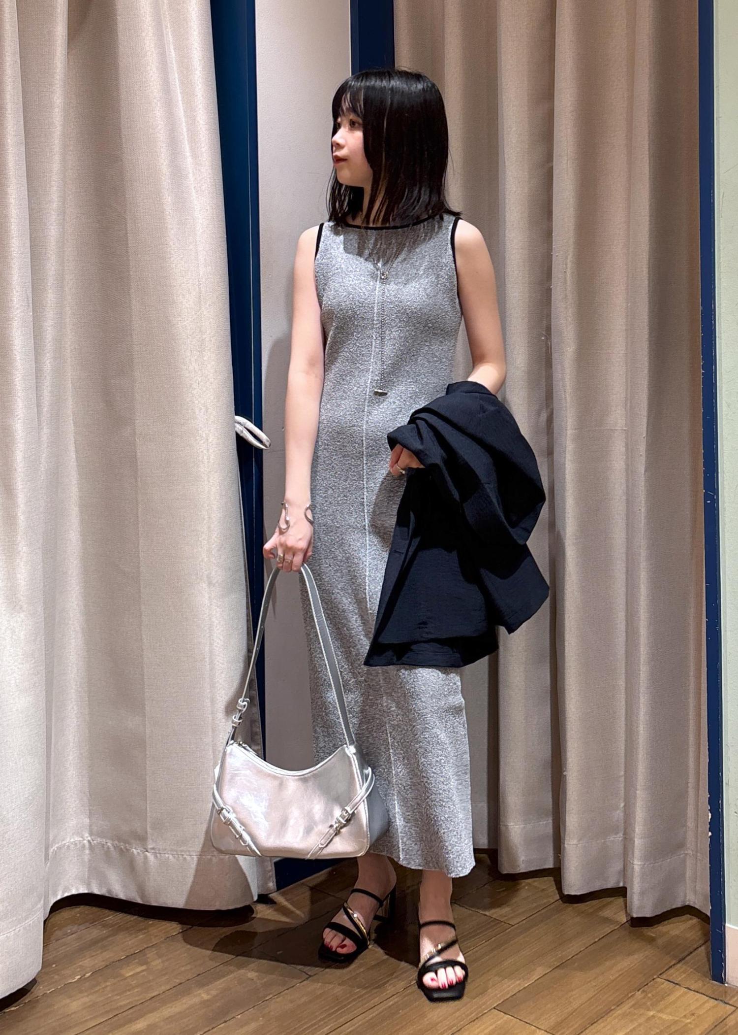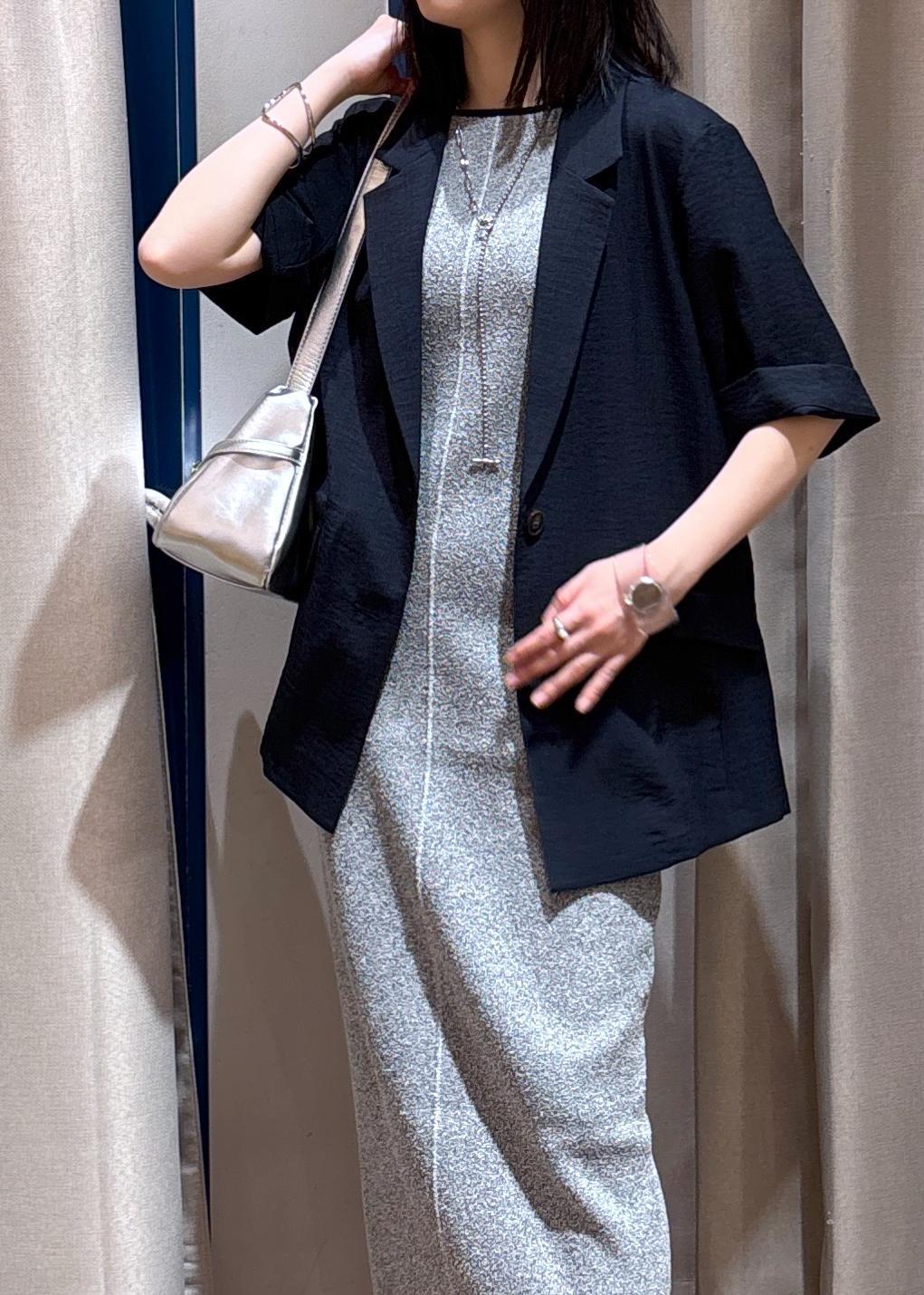 フィット感のあるニットワンピースですが、オーバーシルエットのジャケットサラッと羽織るとカバーできて、こなれ感も出ました◎