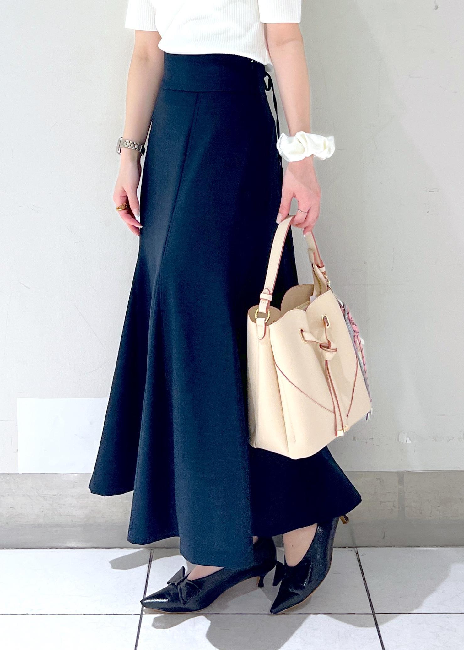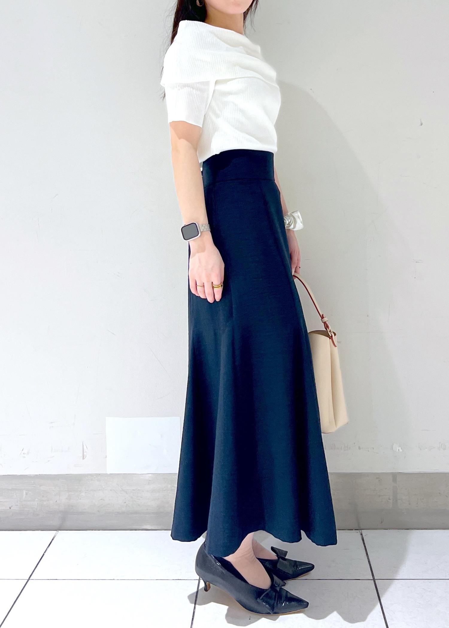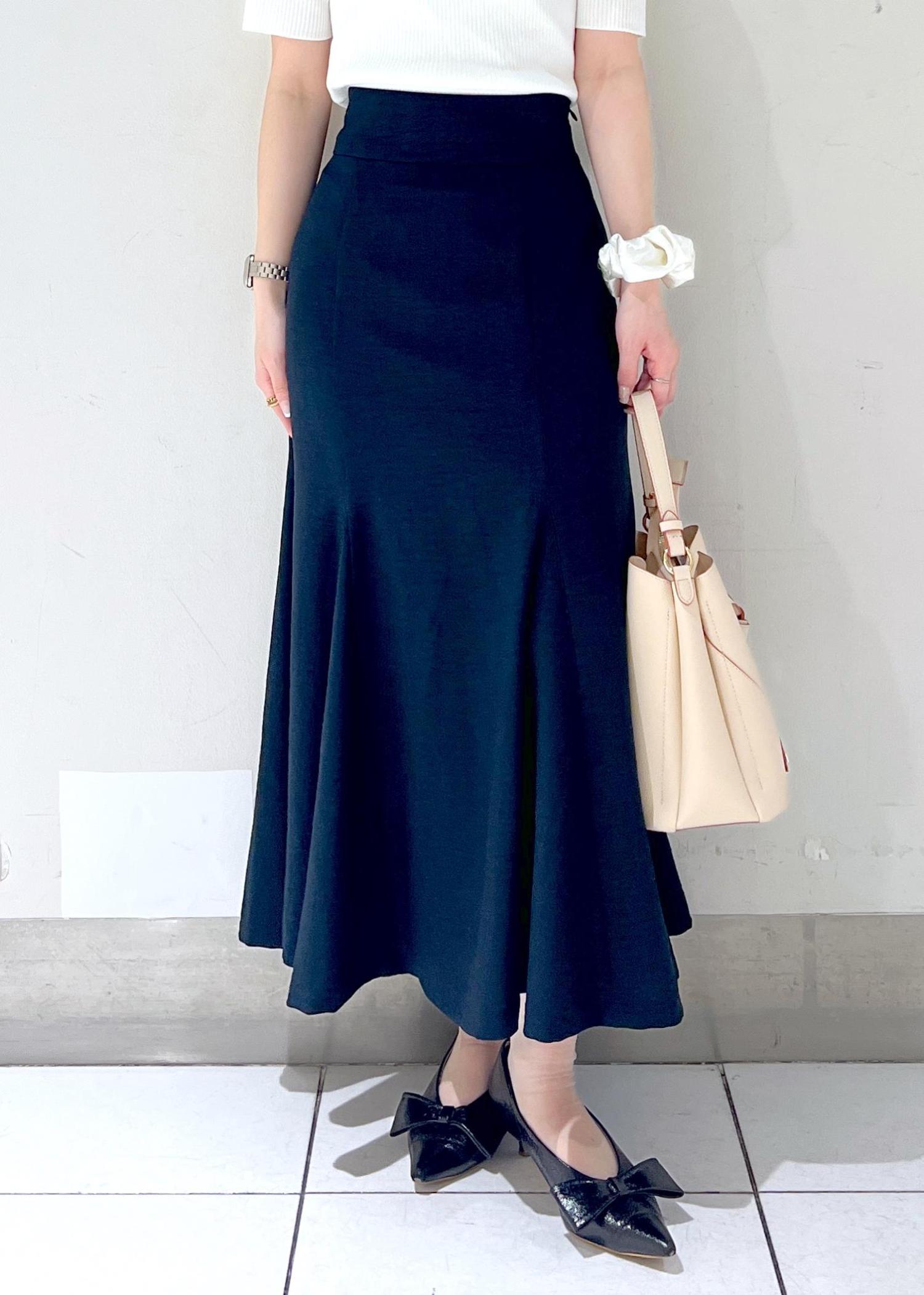 同じシリーズの『リネンライクワンタックワイドスラックスパンツ』(BVS35100)はSS〜Sサイズを着用しているのですが、私は骨格ウェーブで腰の張りが気になるのでマーメイドスカートはSサイズにしました! -
