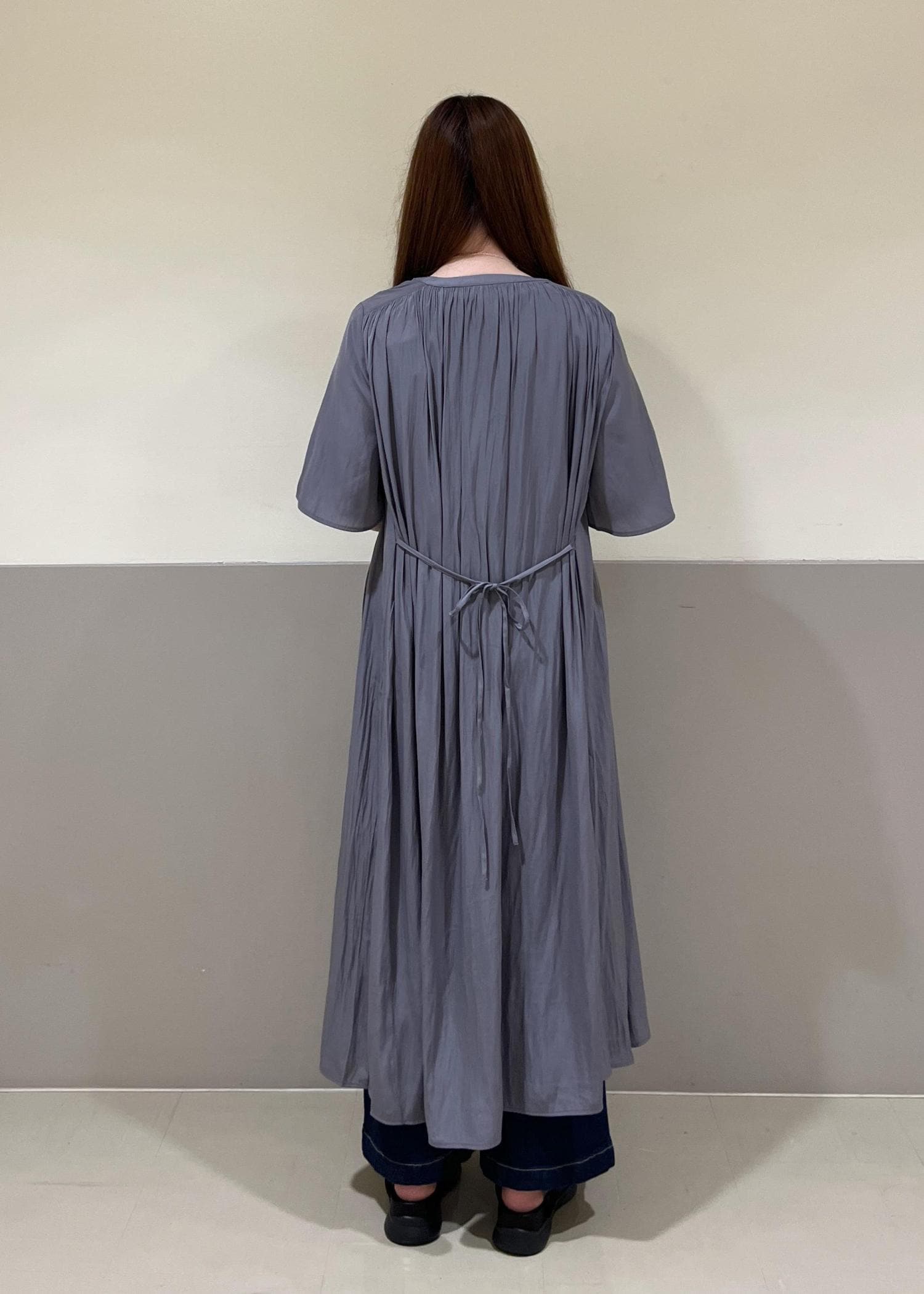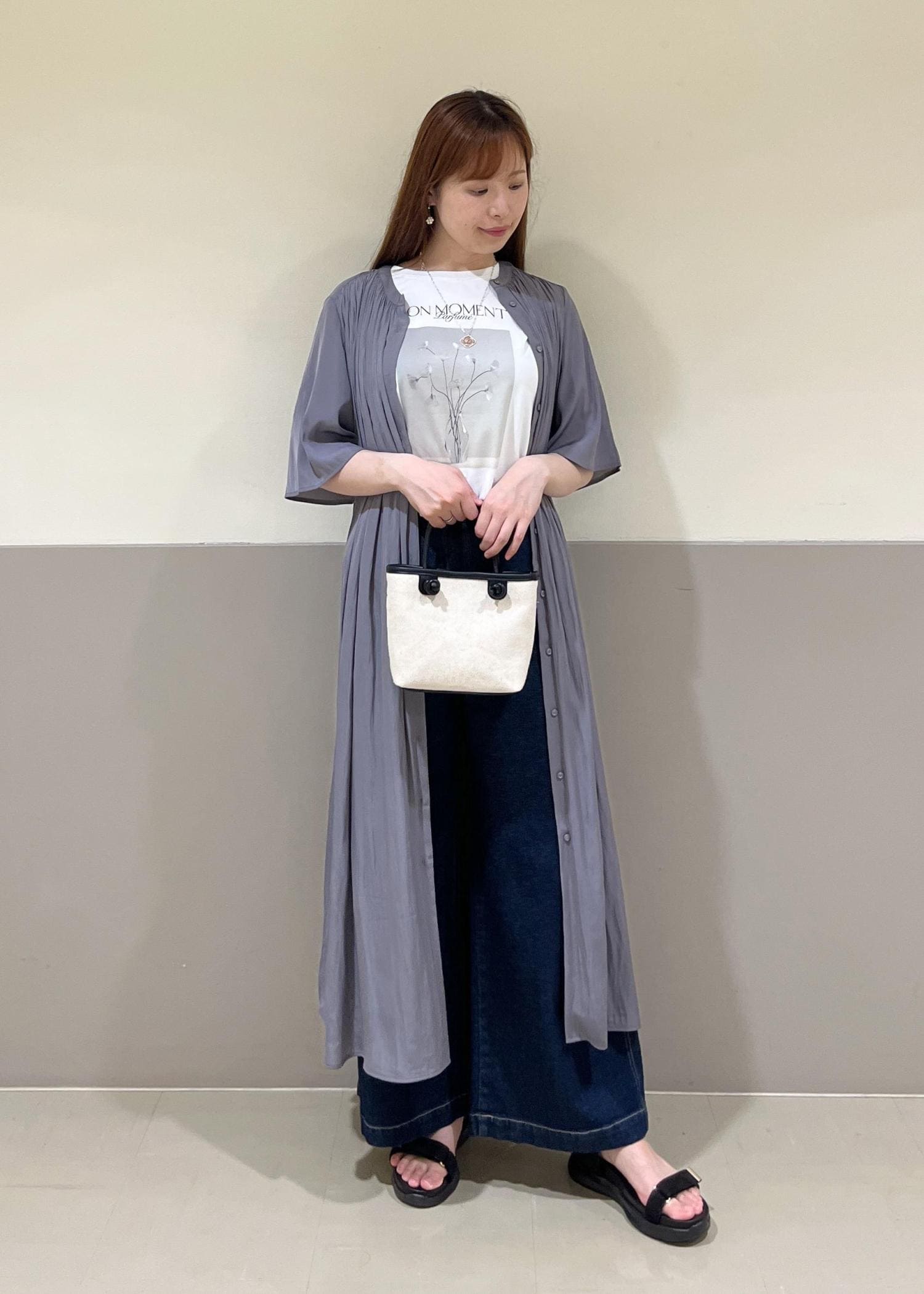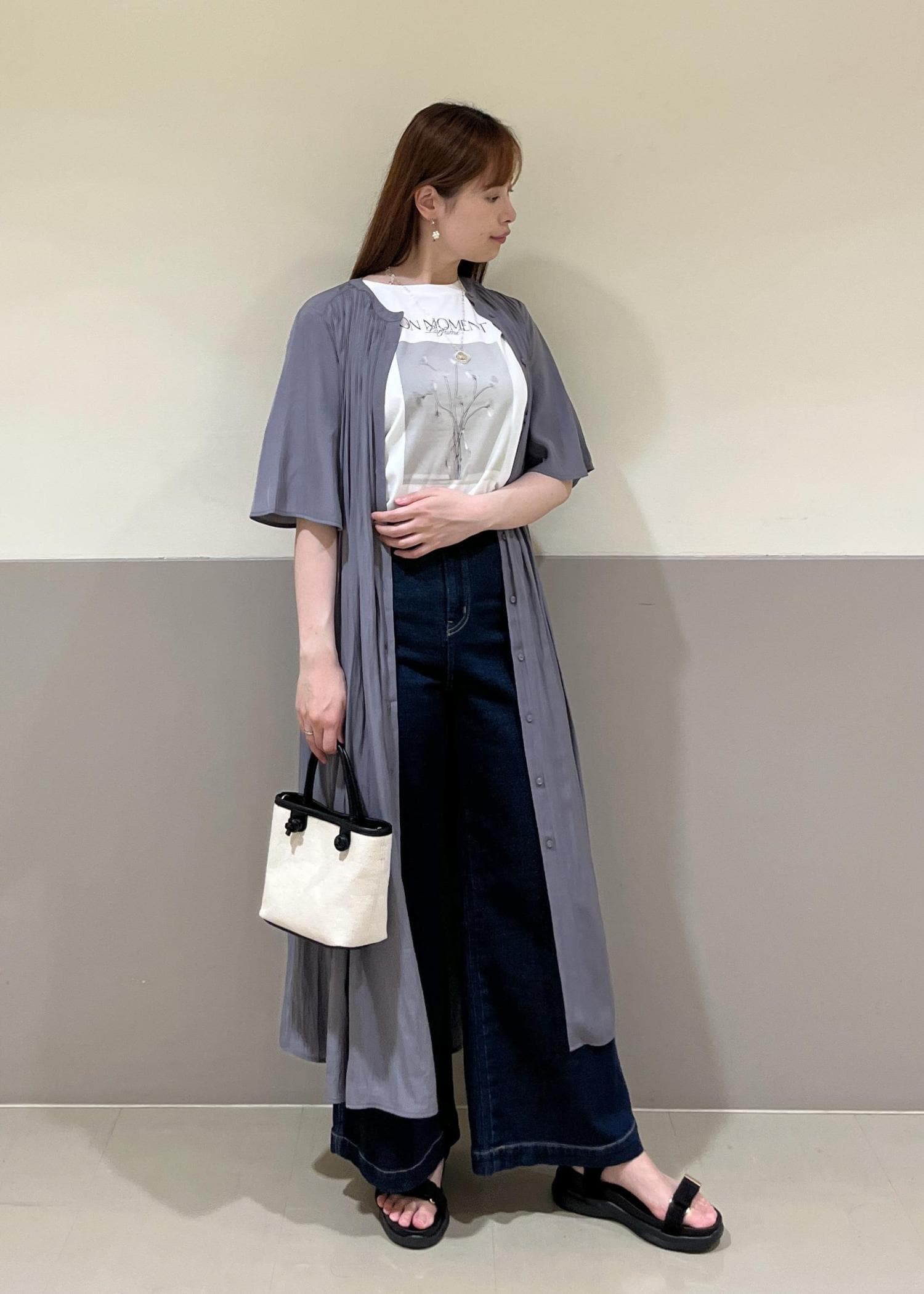 さらっとしたワンピース×ワイドデニムを合わせたカジュアルコーデ。着丈が選べ、羽織にもワンピースにもなる便利アイテムを使ってコーディネートしてみました!