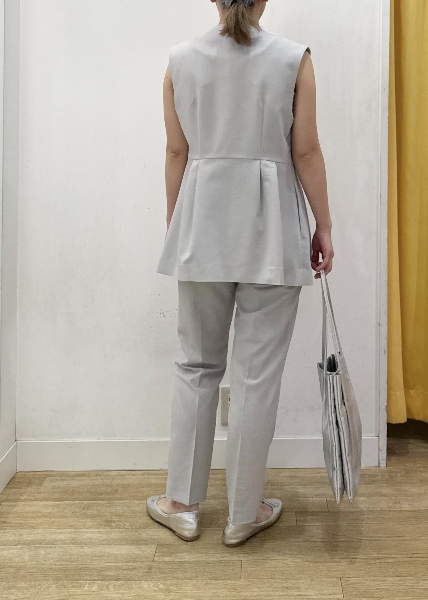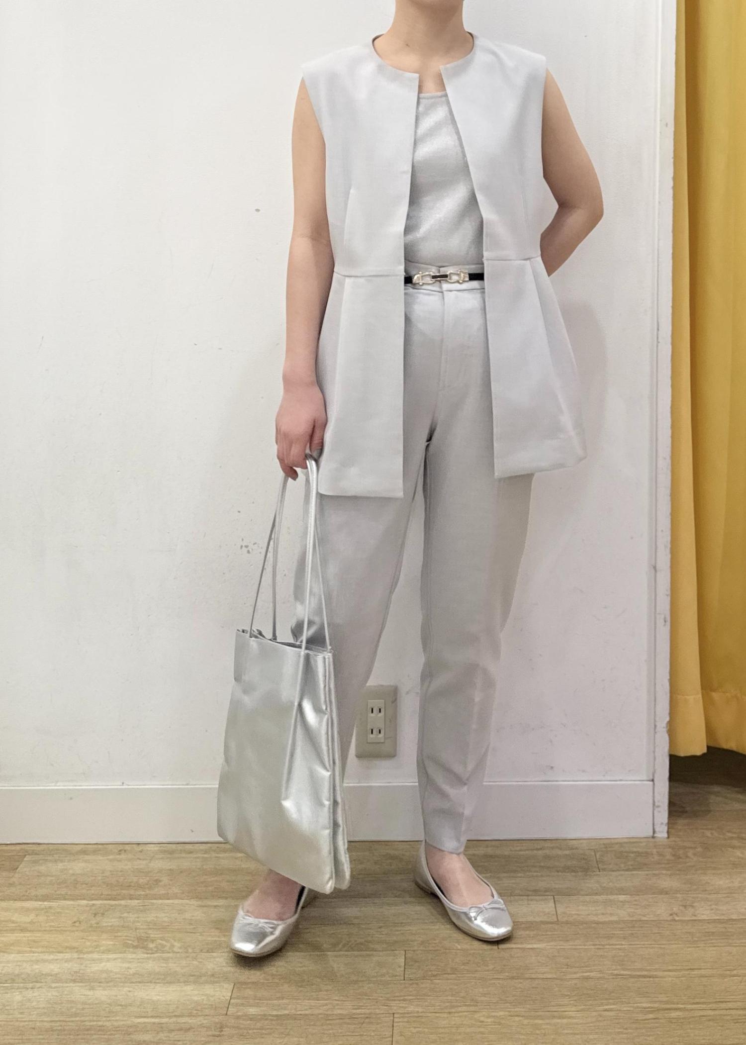 サラッと薄手の素材とスッキリとしたラインのテーパードパンツは夏のお仕事着にもオススメです。