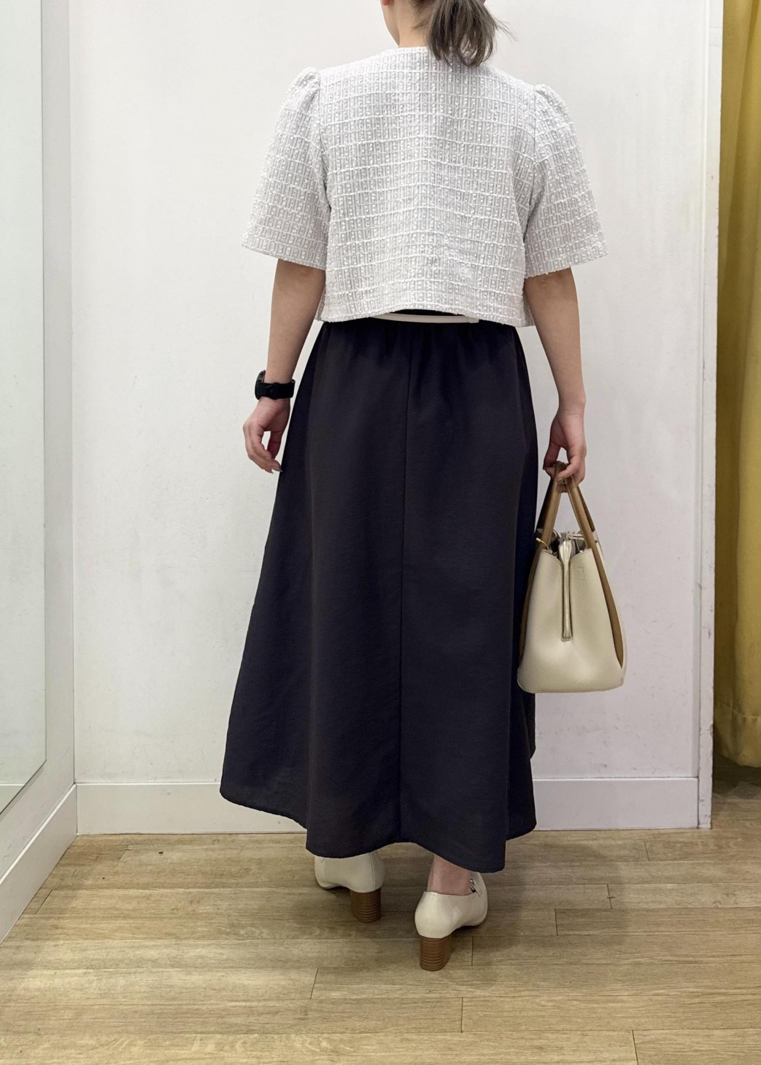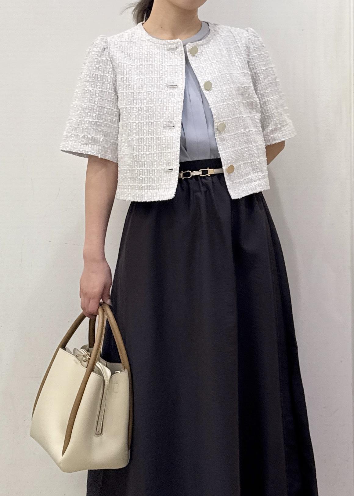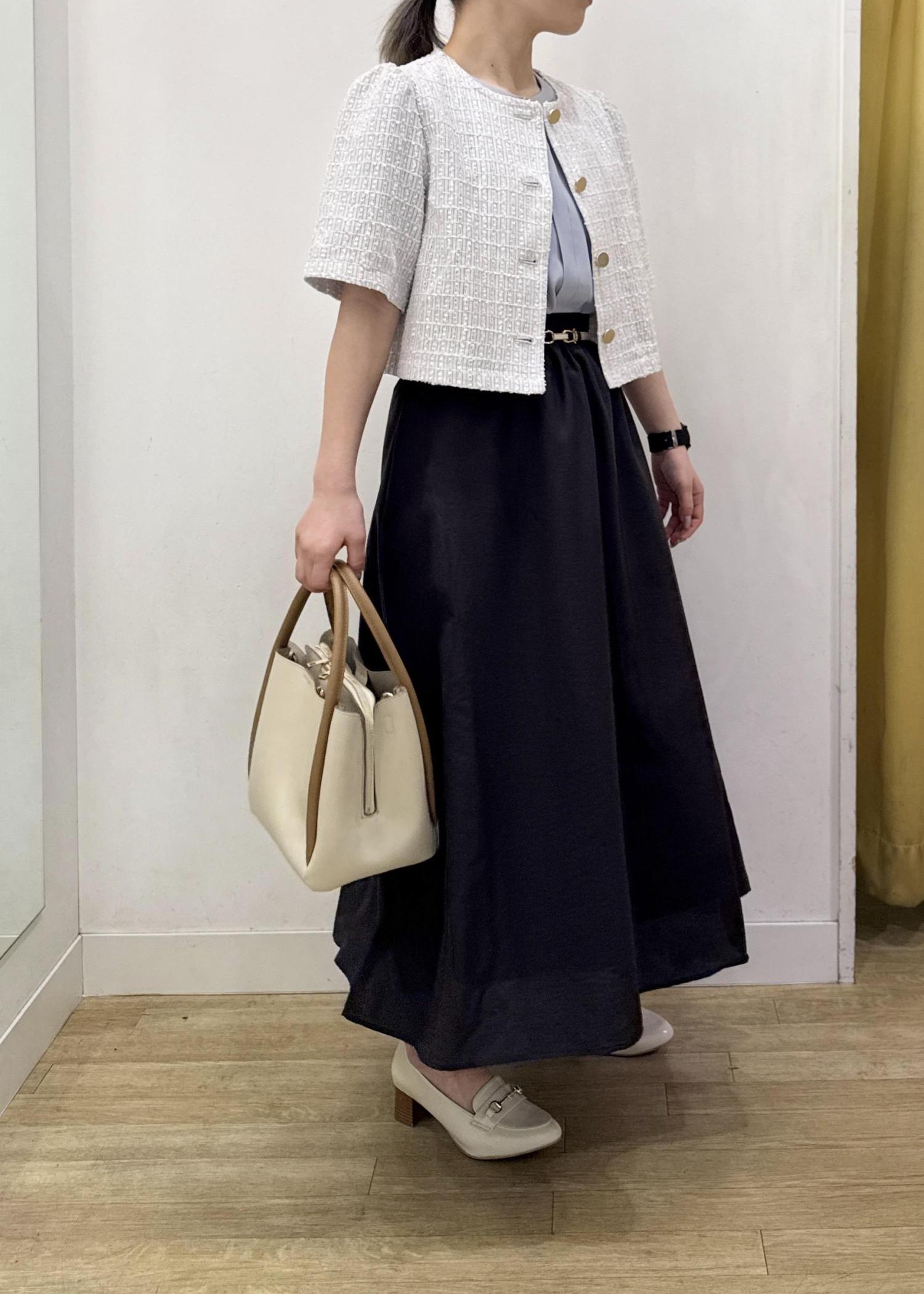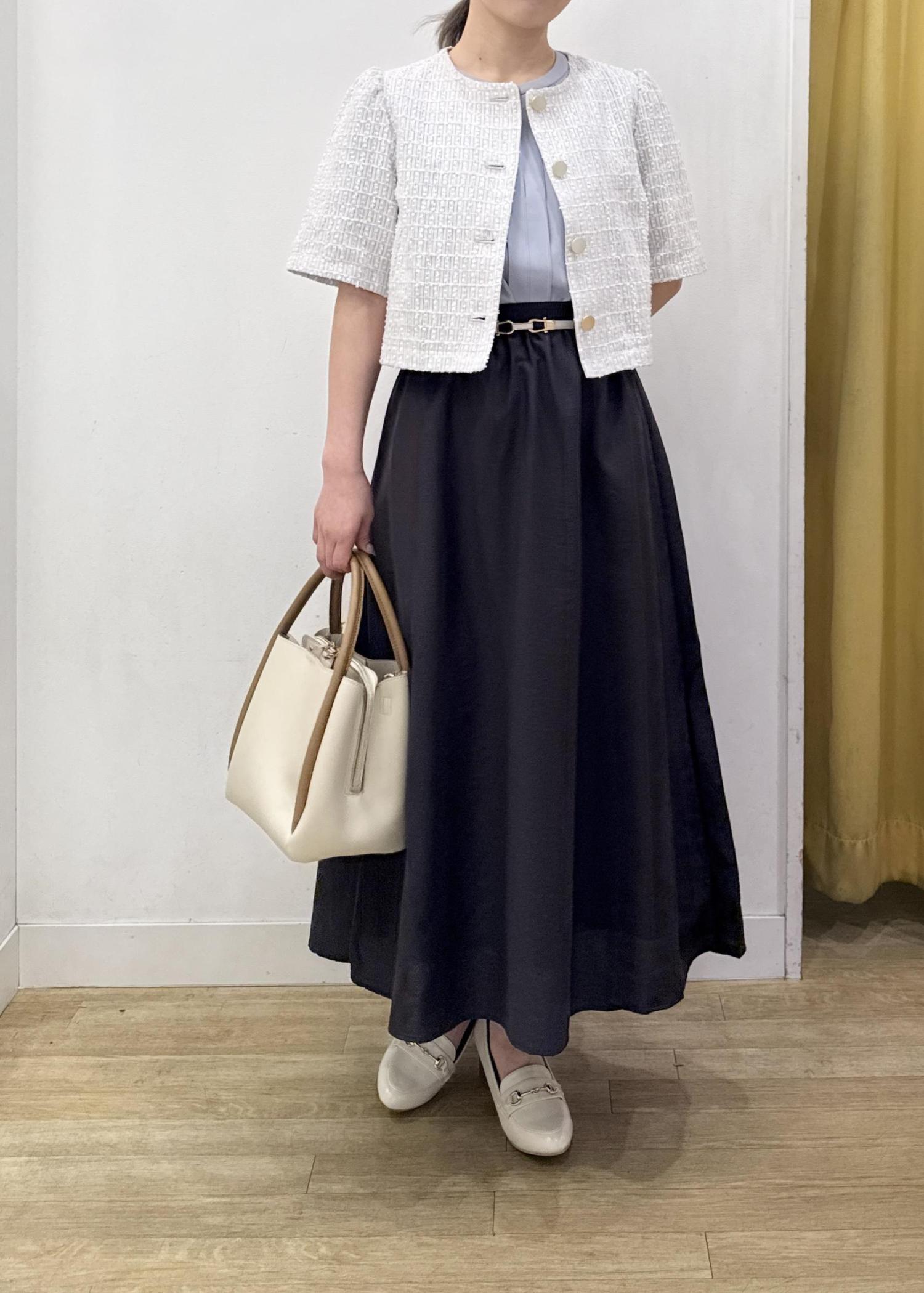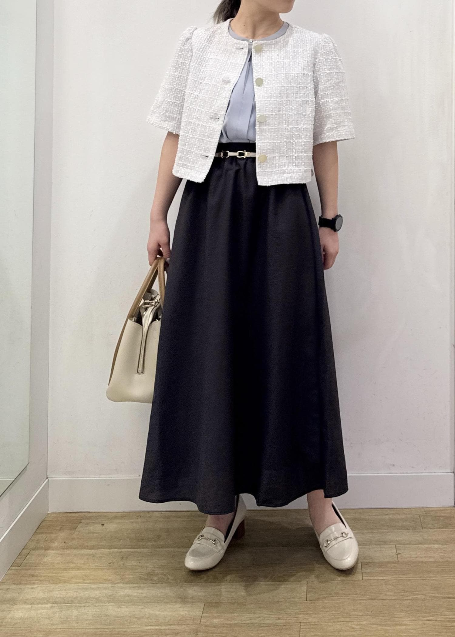 ショート丈のカーディジャケットに、フレアシルエットがステキなスカートを合わせればスタイルアップにも☺︎