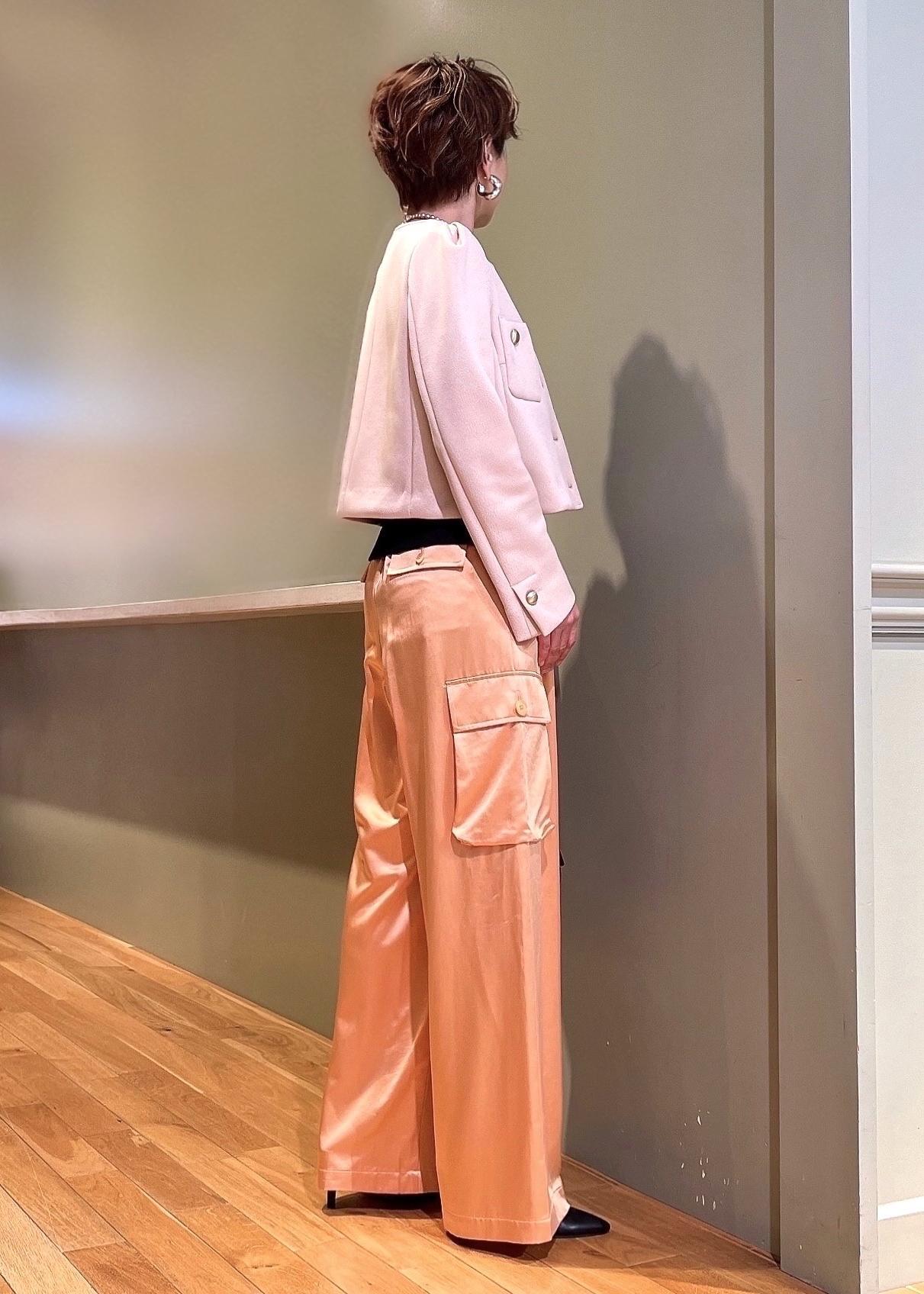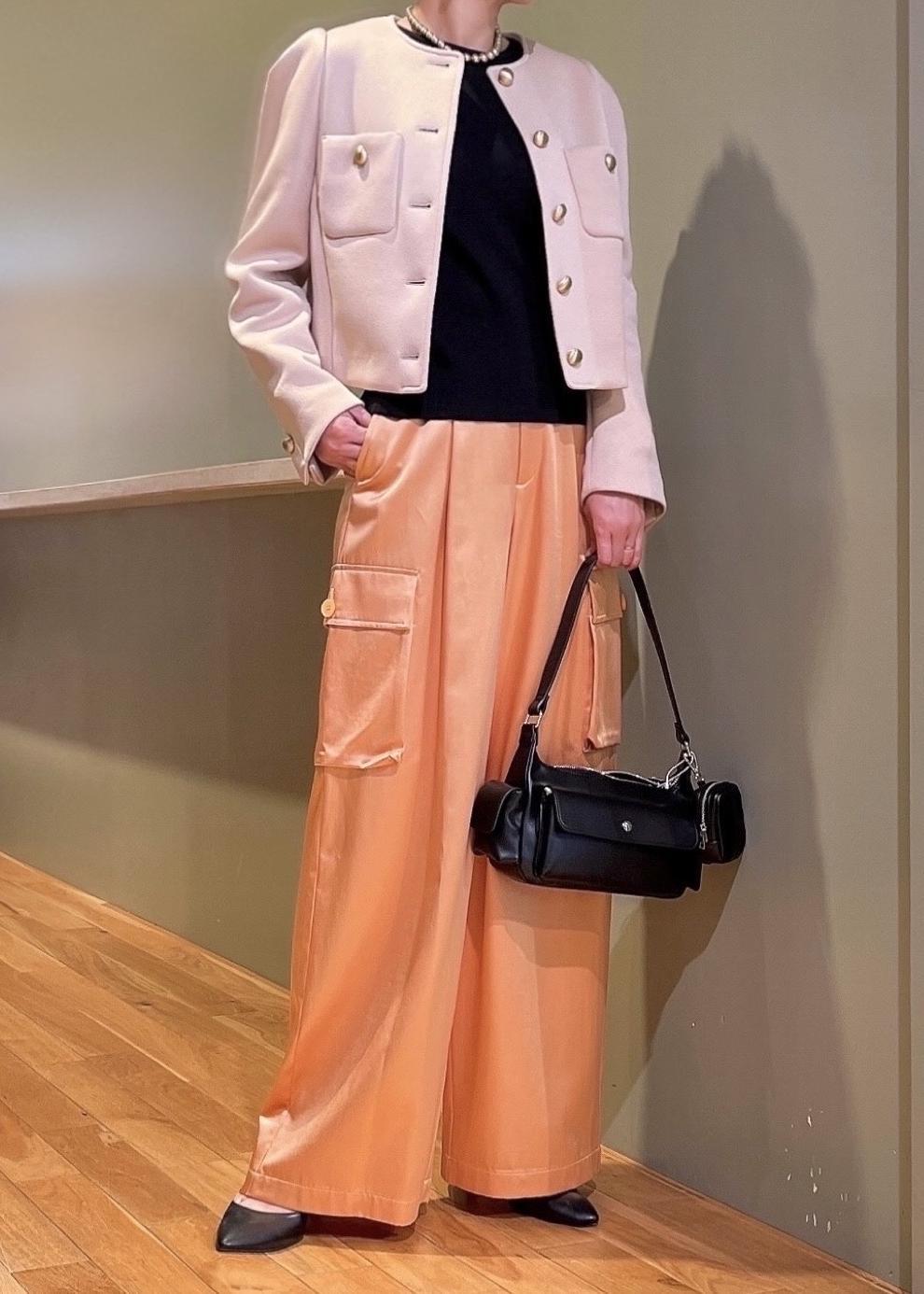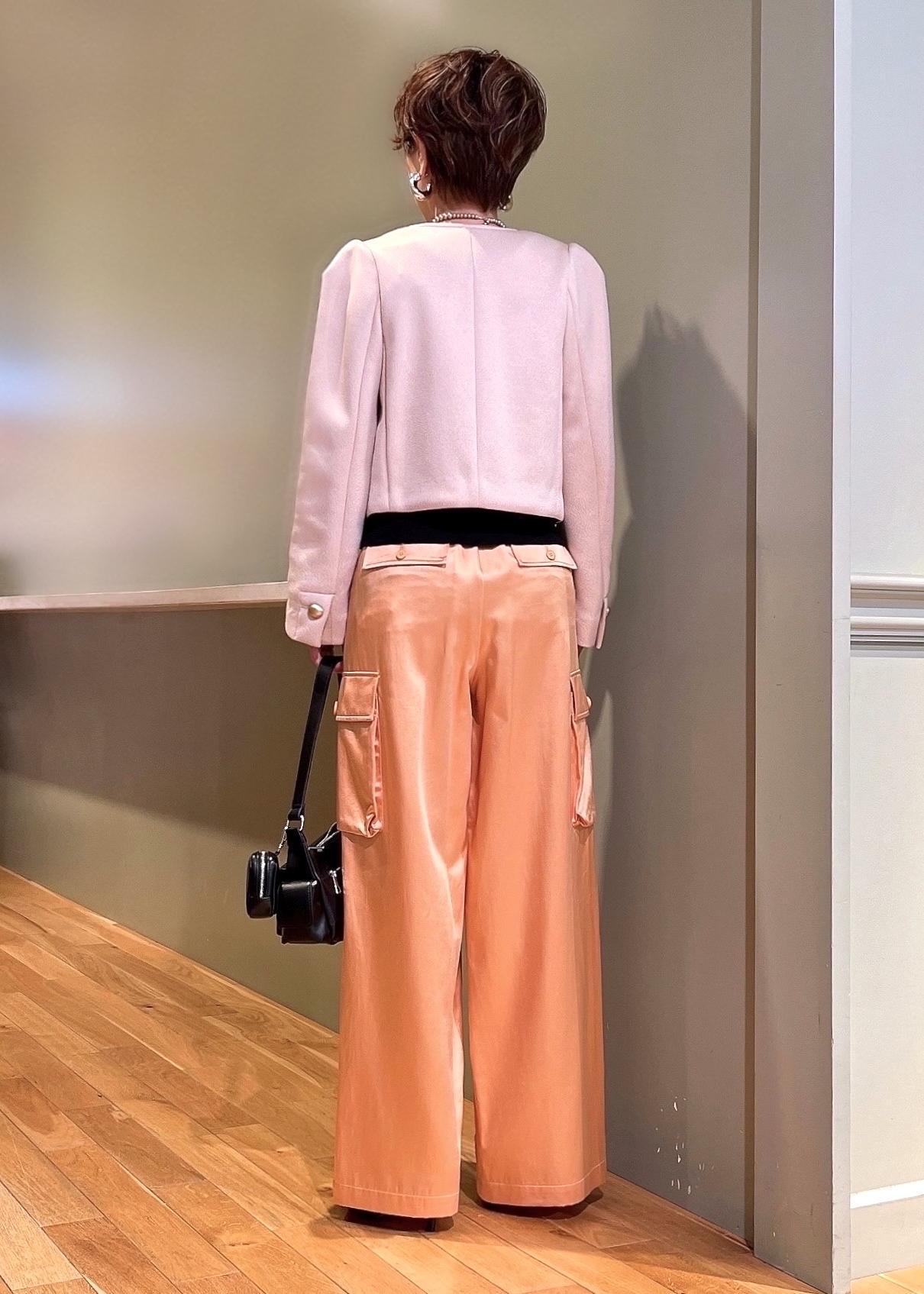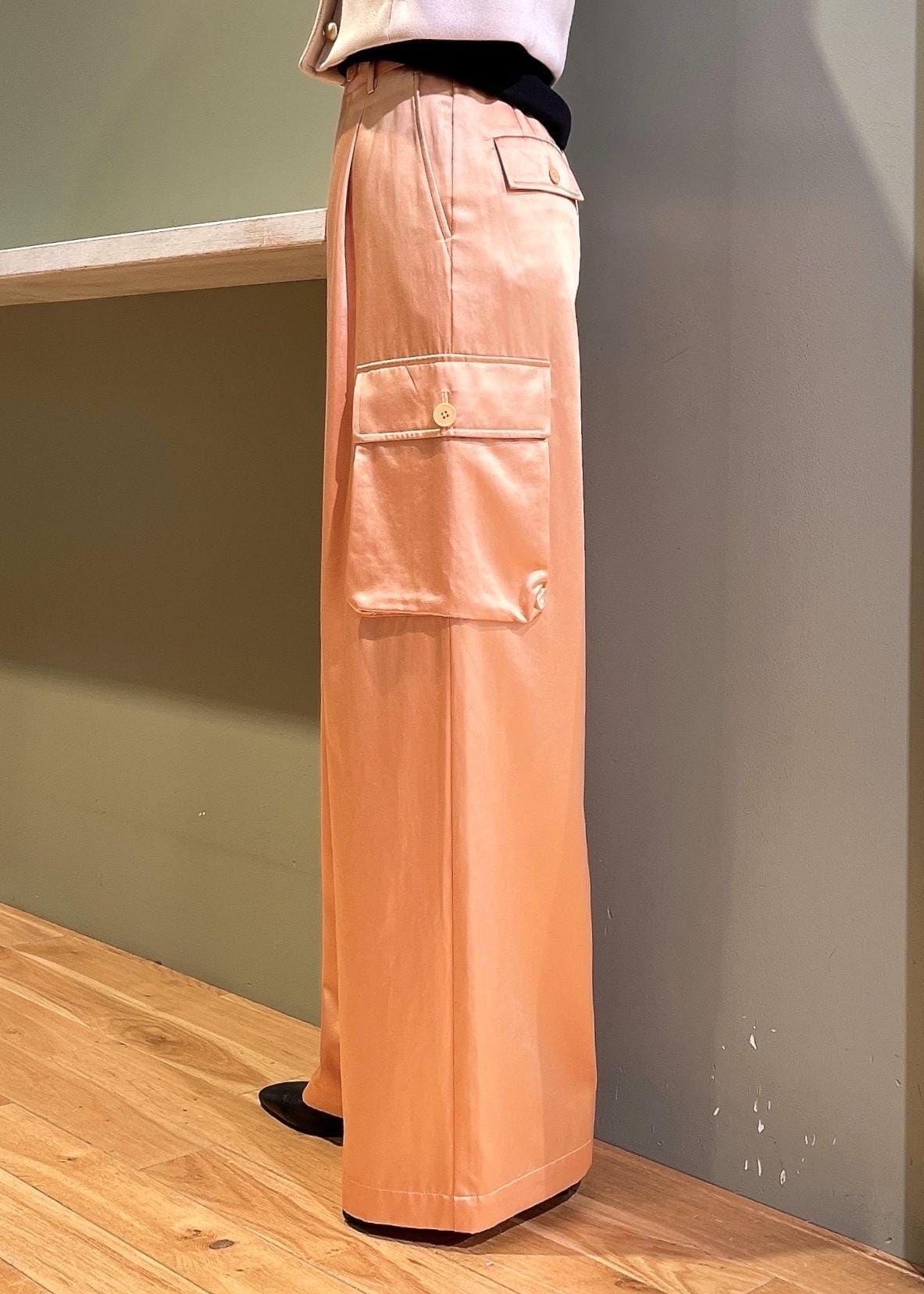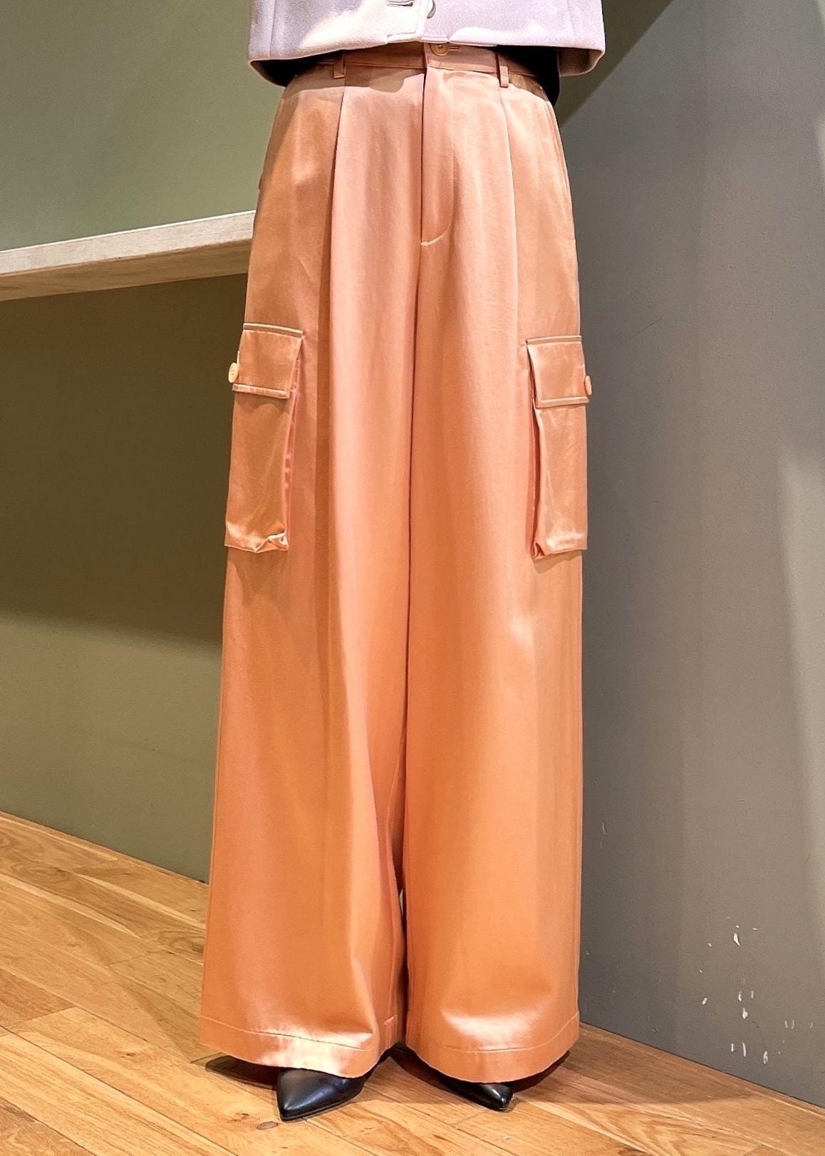 一見、カーゴパンツはカジュアル過ぎるイメージですが、艶感のあるサテン生地で大人な印象◎落ち感のある素材とシワになりにくいのも嬉しいポイントです!