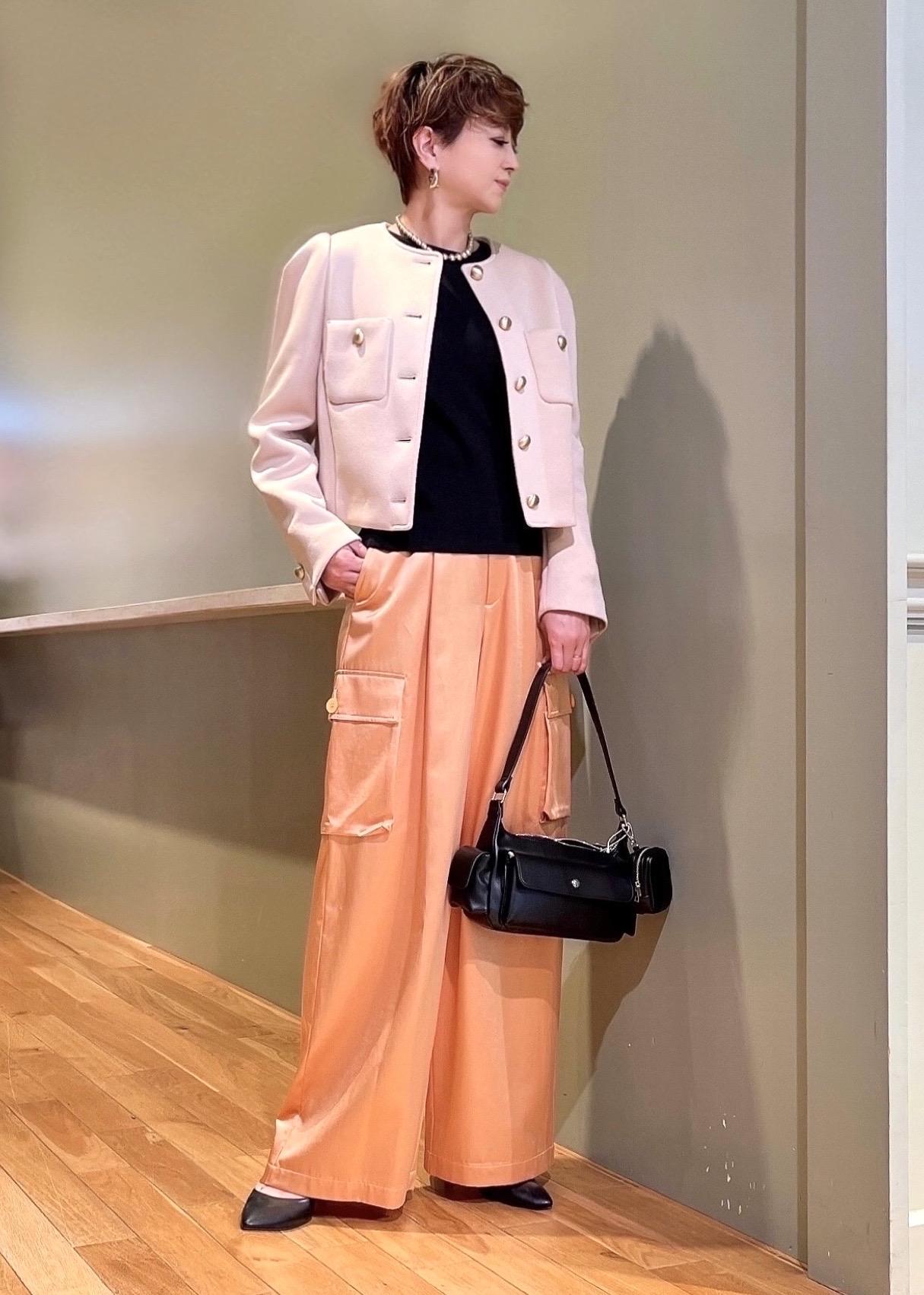 肩幅は少し狭めで、全体的にコンパクトなシルエットですので、ハイウエスト、ボリュームあるボトムとの相性が良さそうです! -