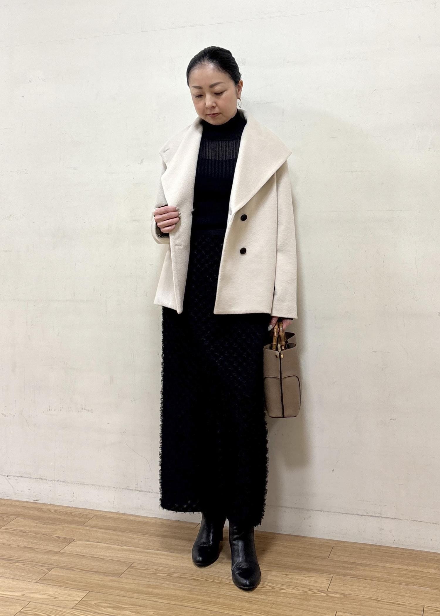 ボートネックとアームレットのデザインがカジュアルになりすぎず、オンオフどちらにも着回せるアイテムです。