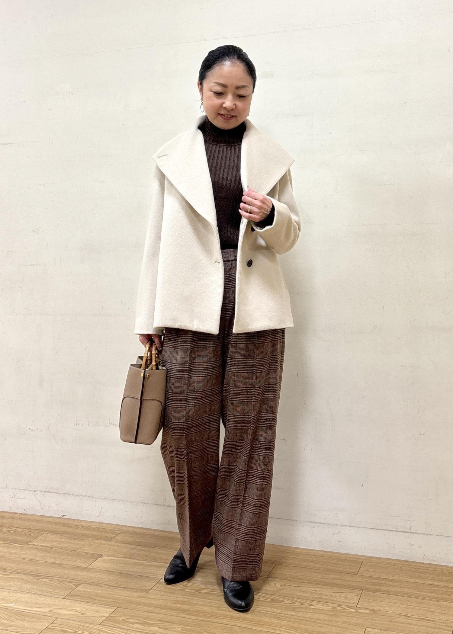 デザインが目を引くCOOHEMのニットパンツに同系色のジレを合わせた大人のキレイめスタイル。