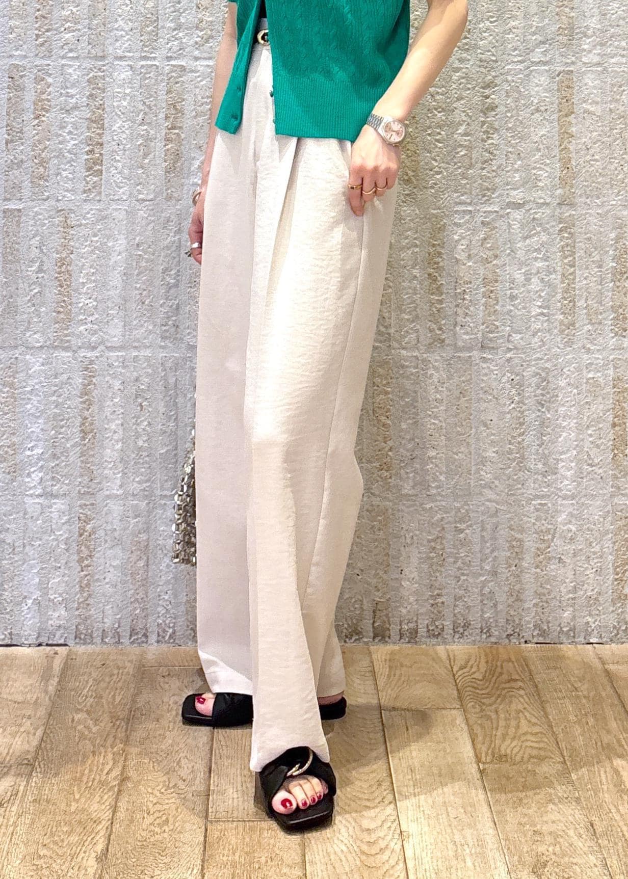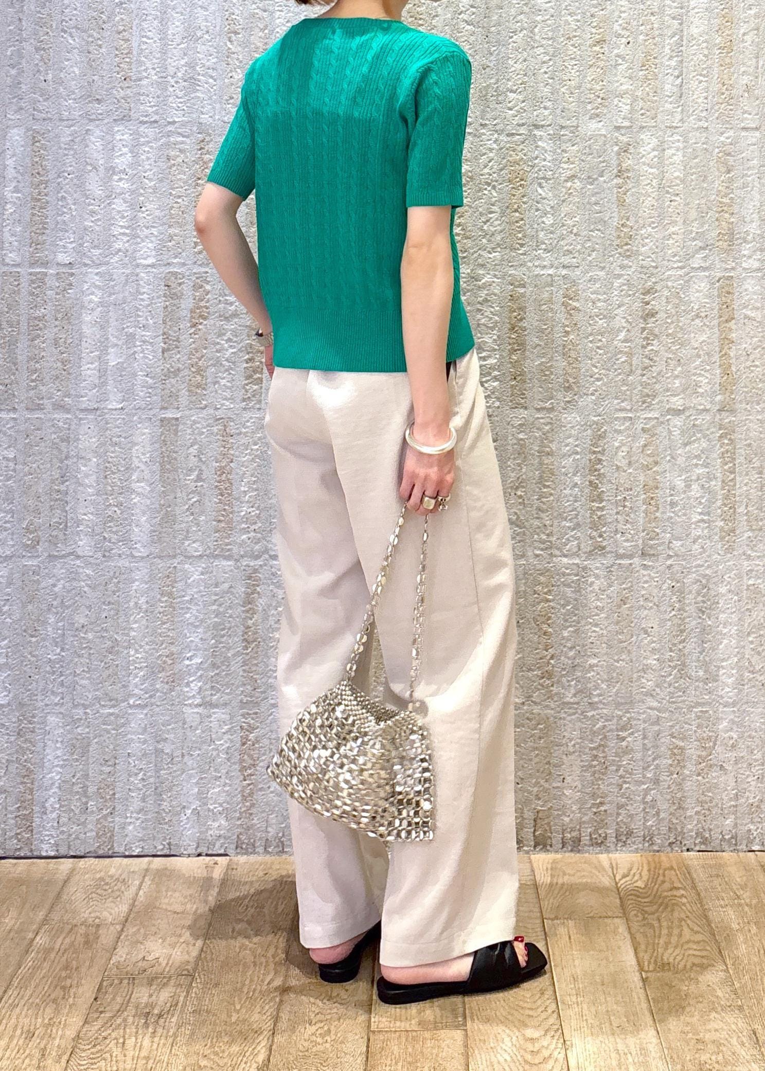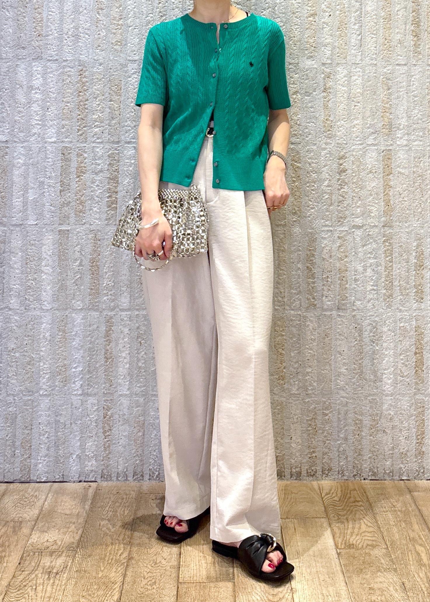 鮮やかなグリーンが目を惹く印象で、柔らかなワイドパンツでスタイルup見えするようまとめました◎