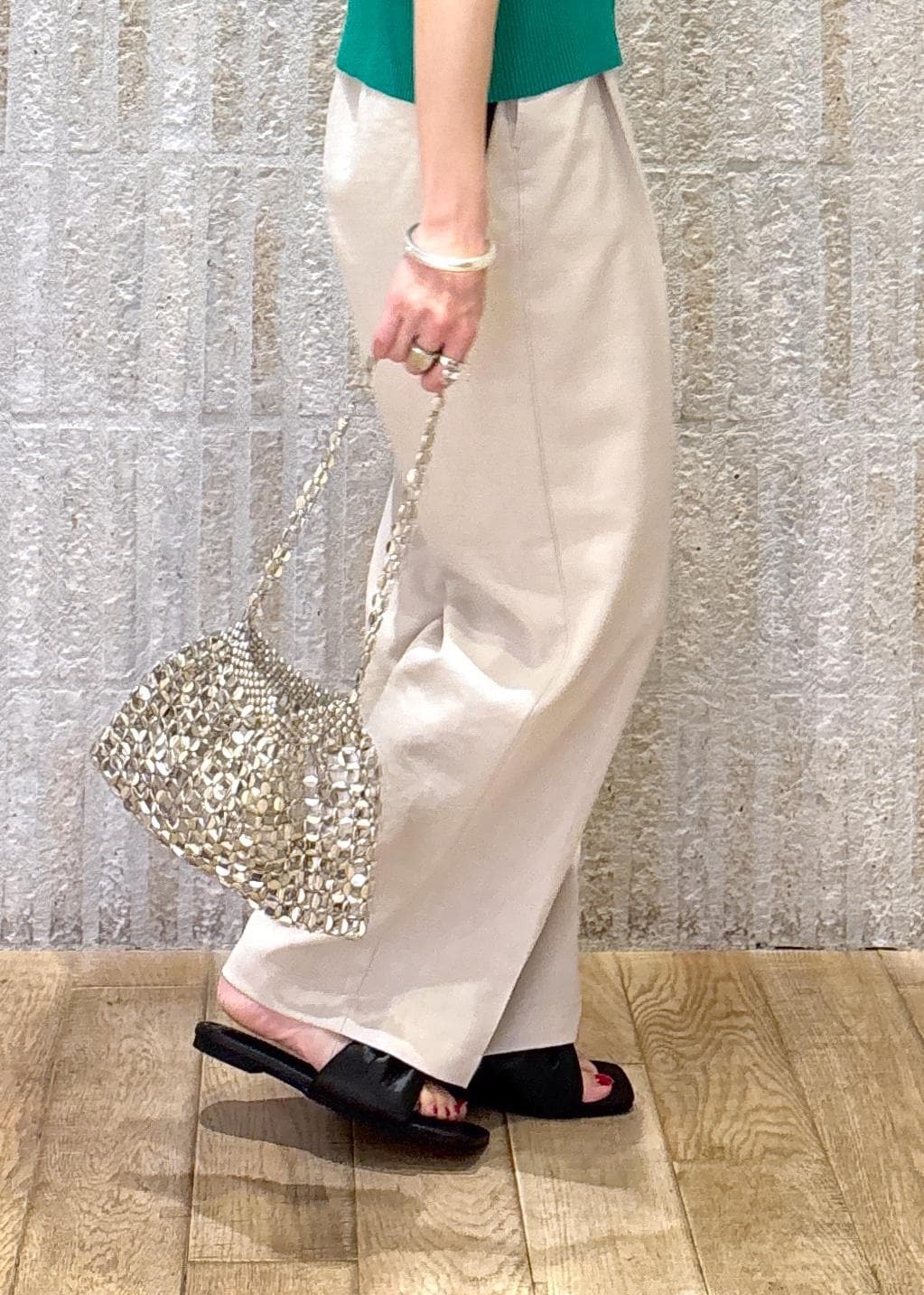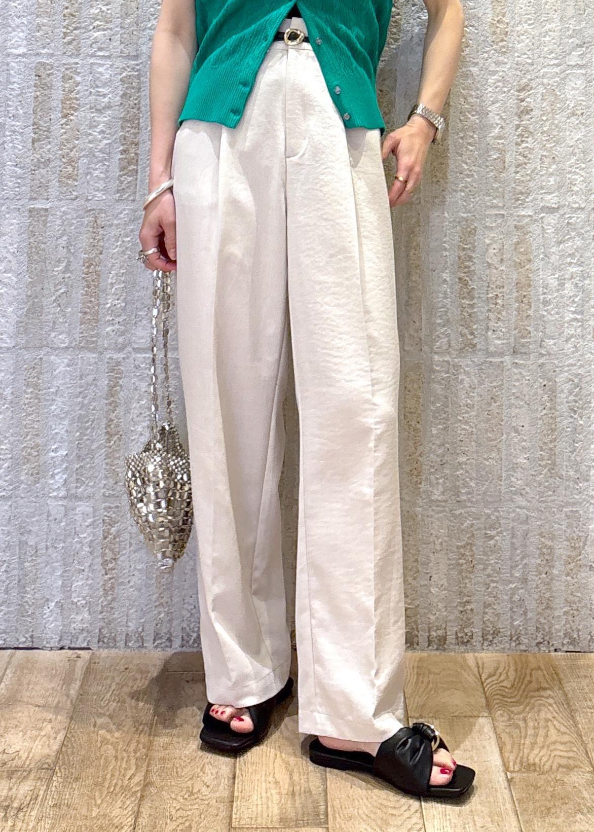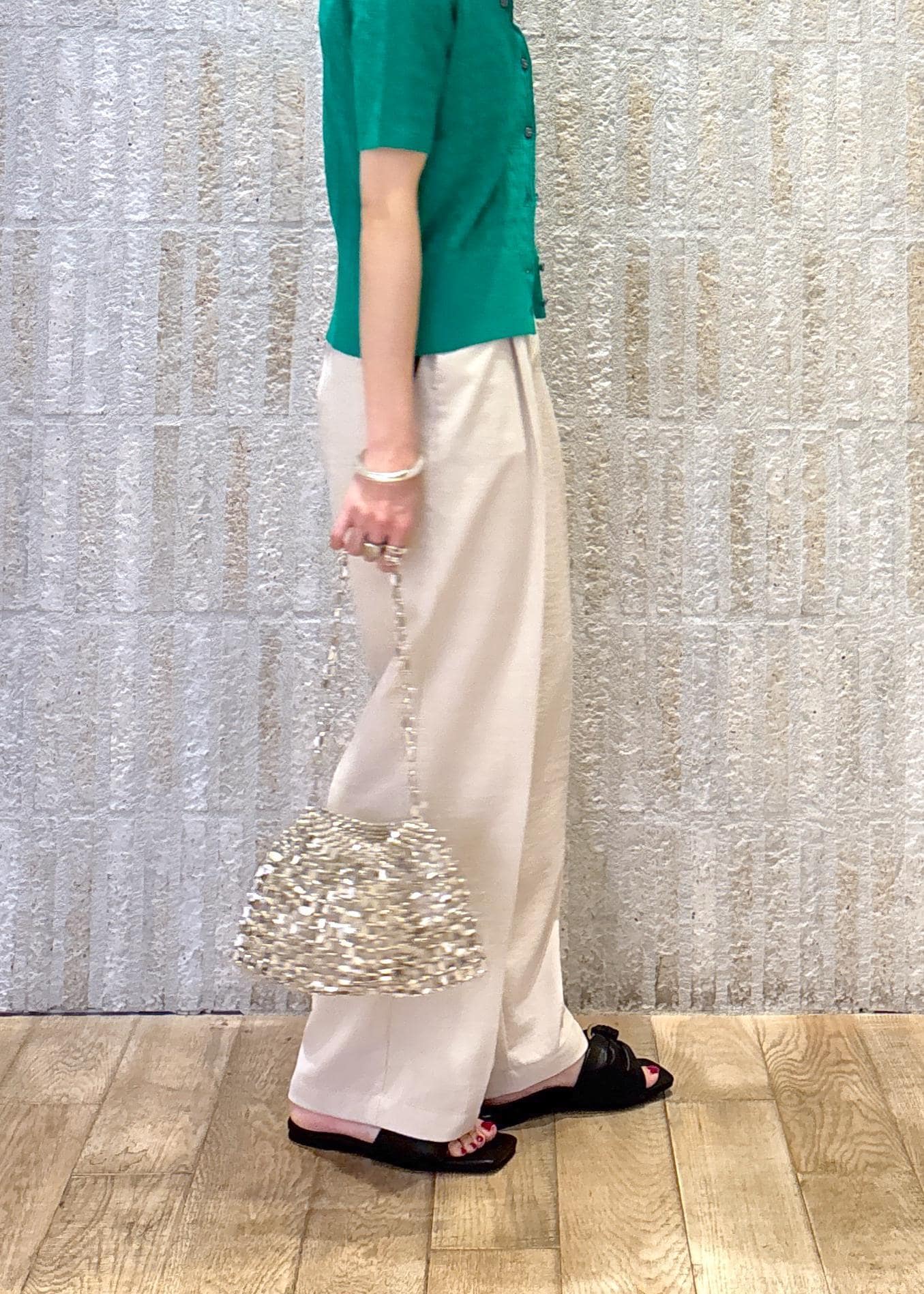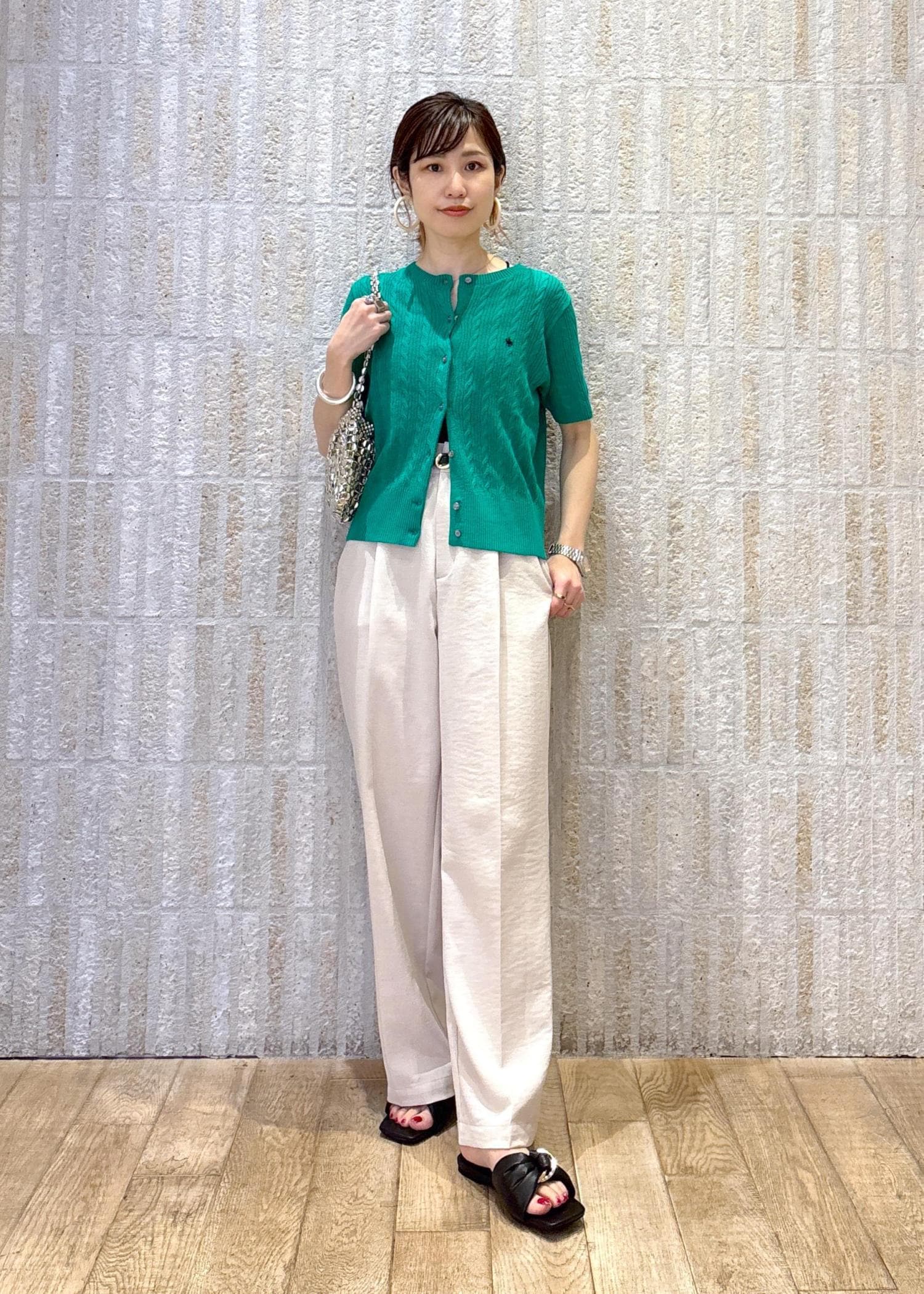 鮮やかなグリーンが目を惹く印象で、柔らかなワイドパンツでスタイルup見えするようまとめました◎