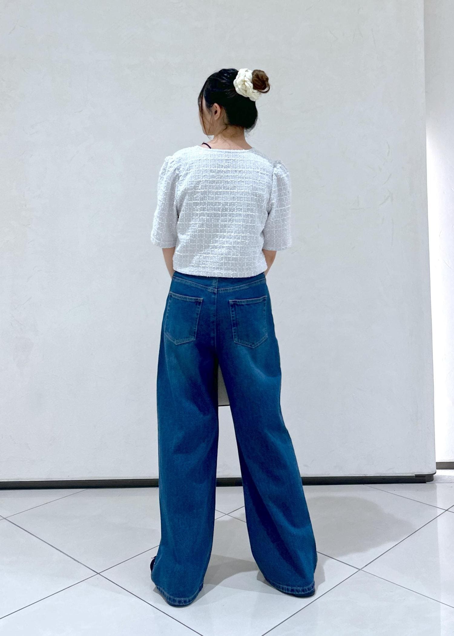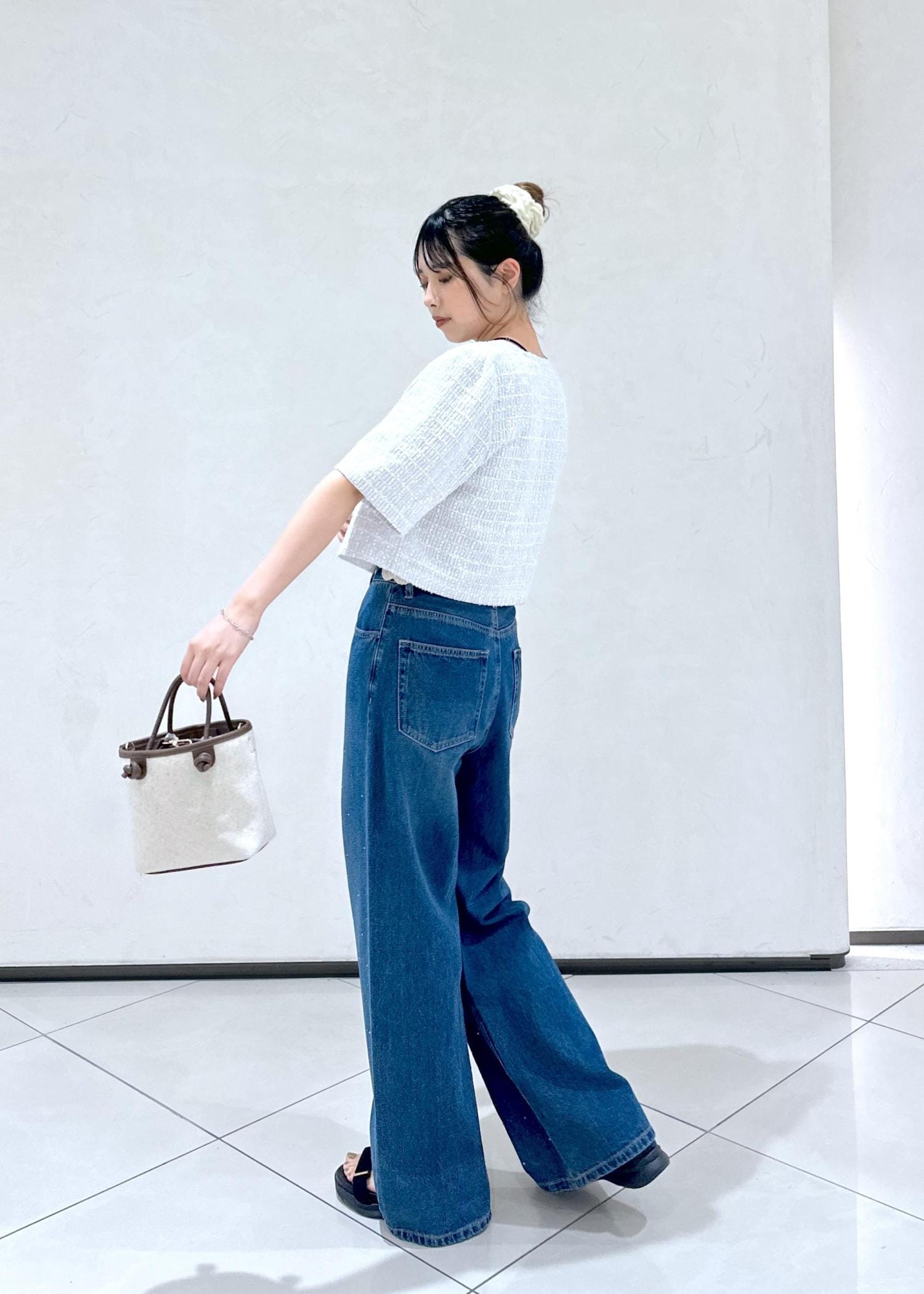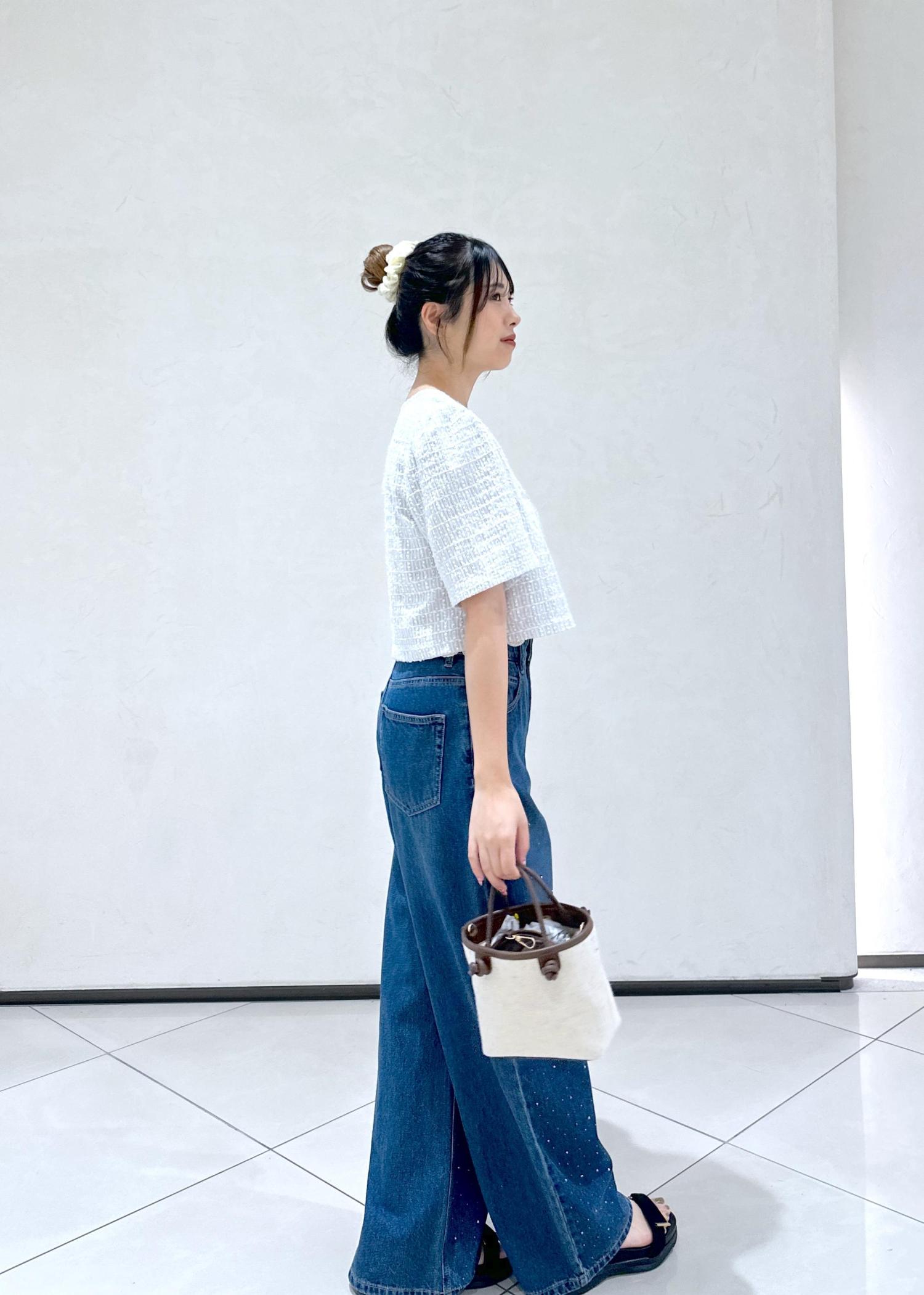 キレイめなツイードジャケットにトレンドのビジューデニムを合わせた今っぽいキレイめカジュアルコーデです♪