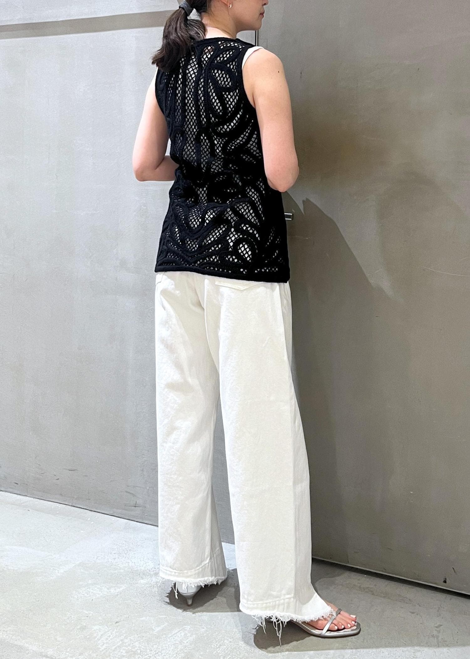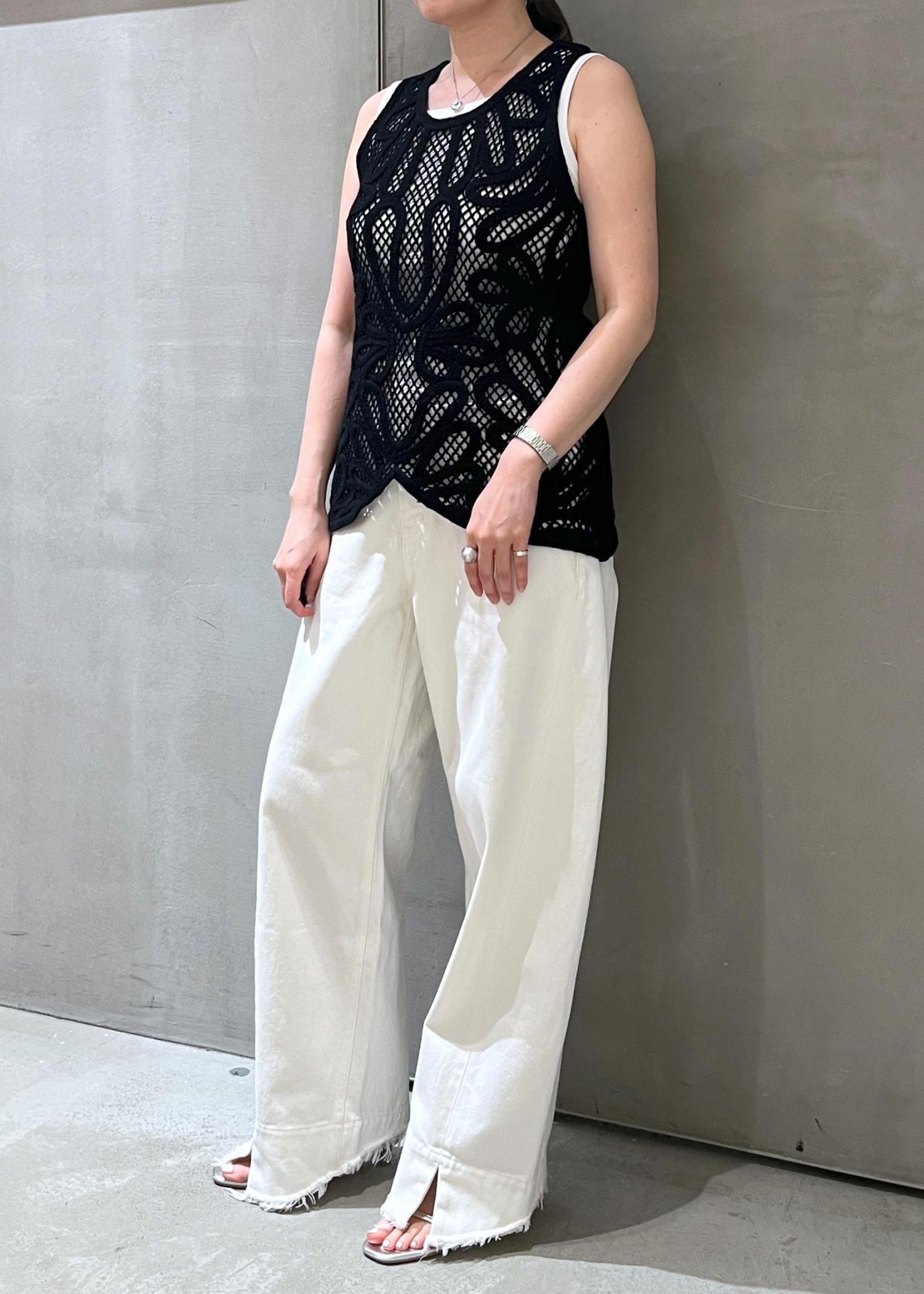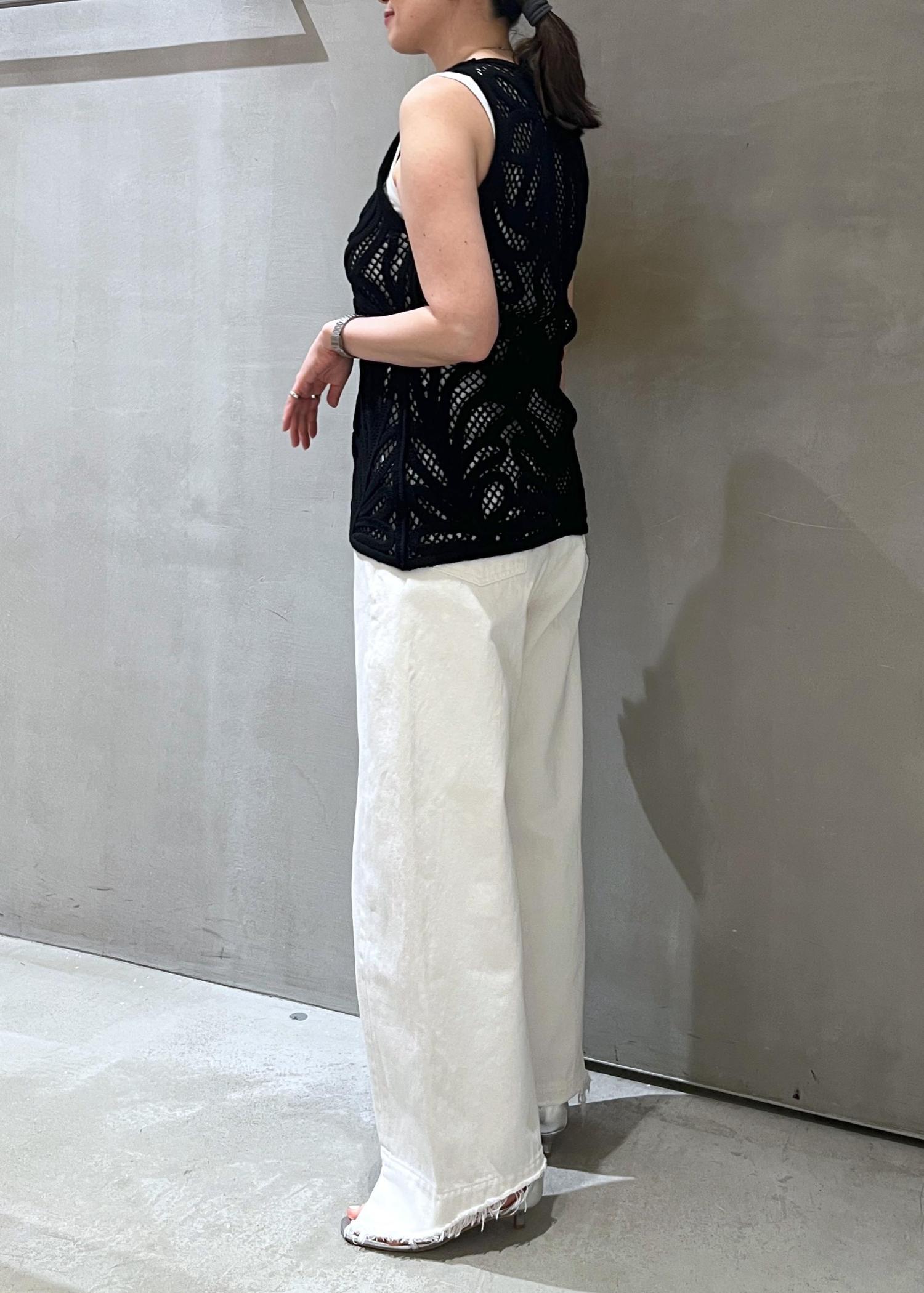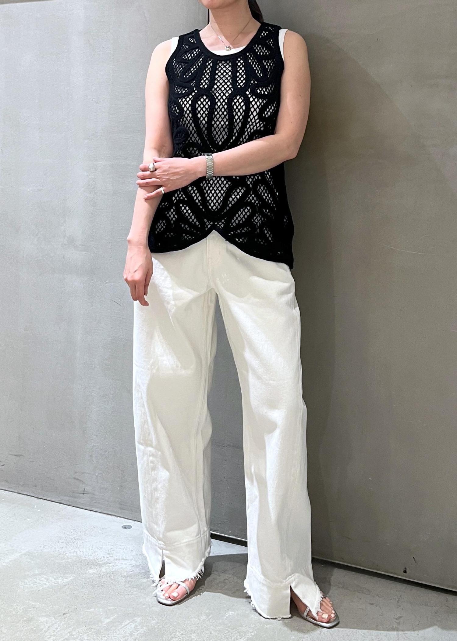 裾の特徴的なデザインが目を惹くデニムなので、シンプルなトップスでもサマになるアイテム。モードなトップスなどとも相性抜群です。