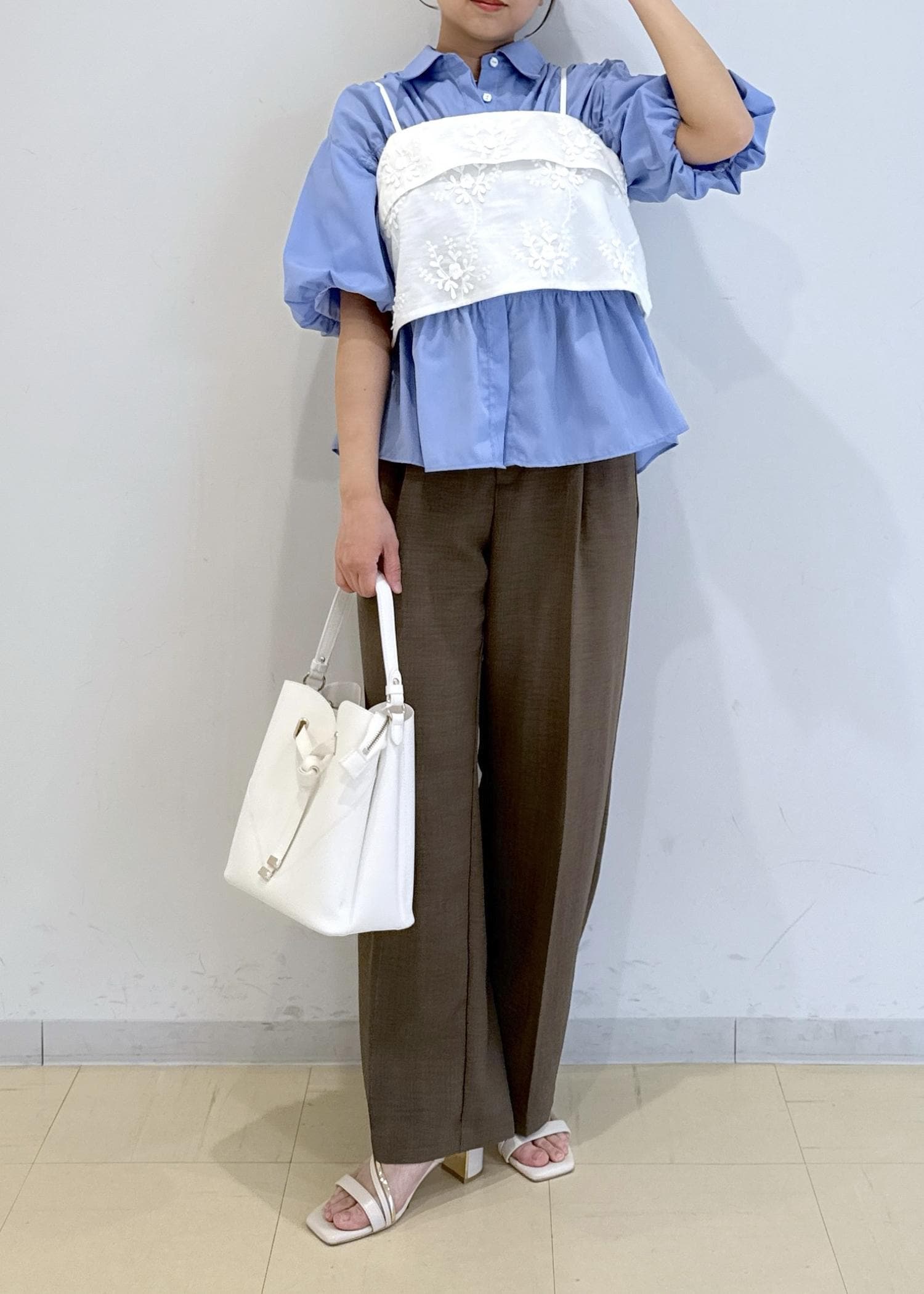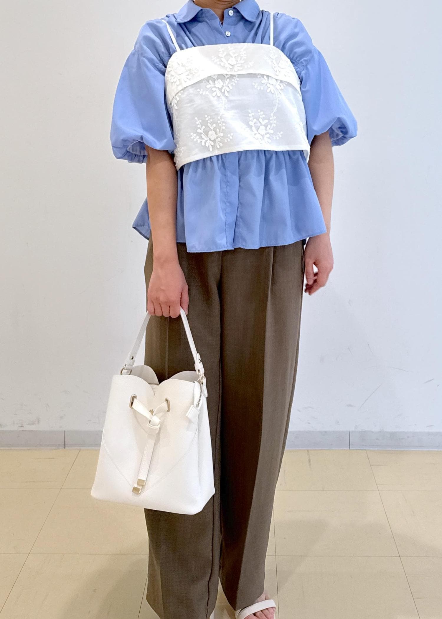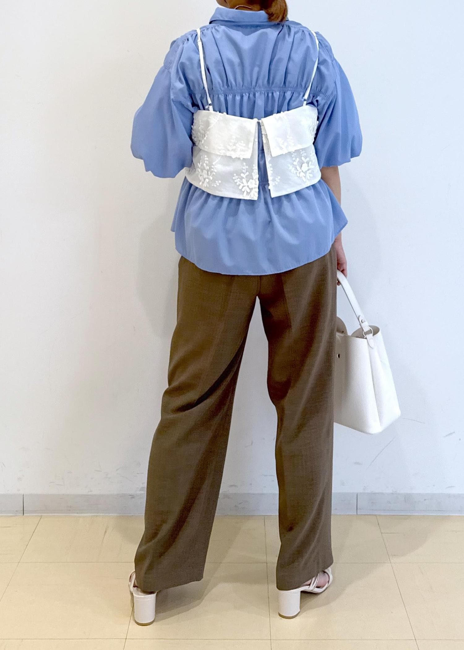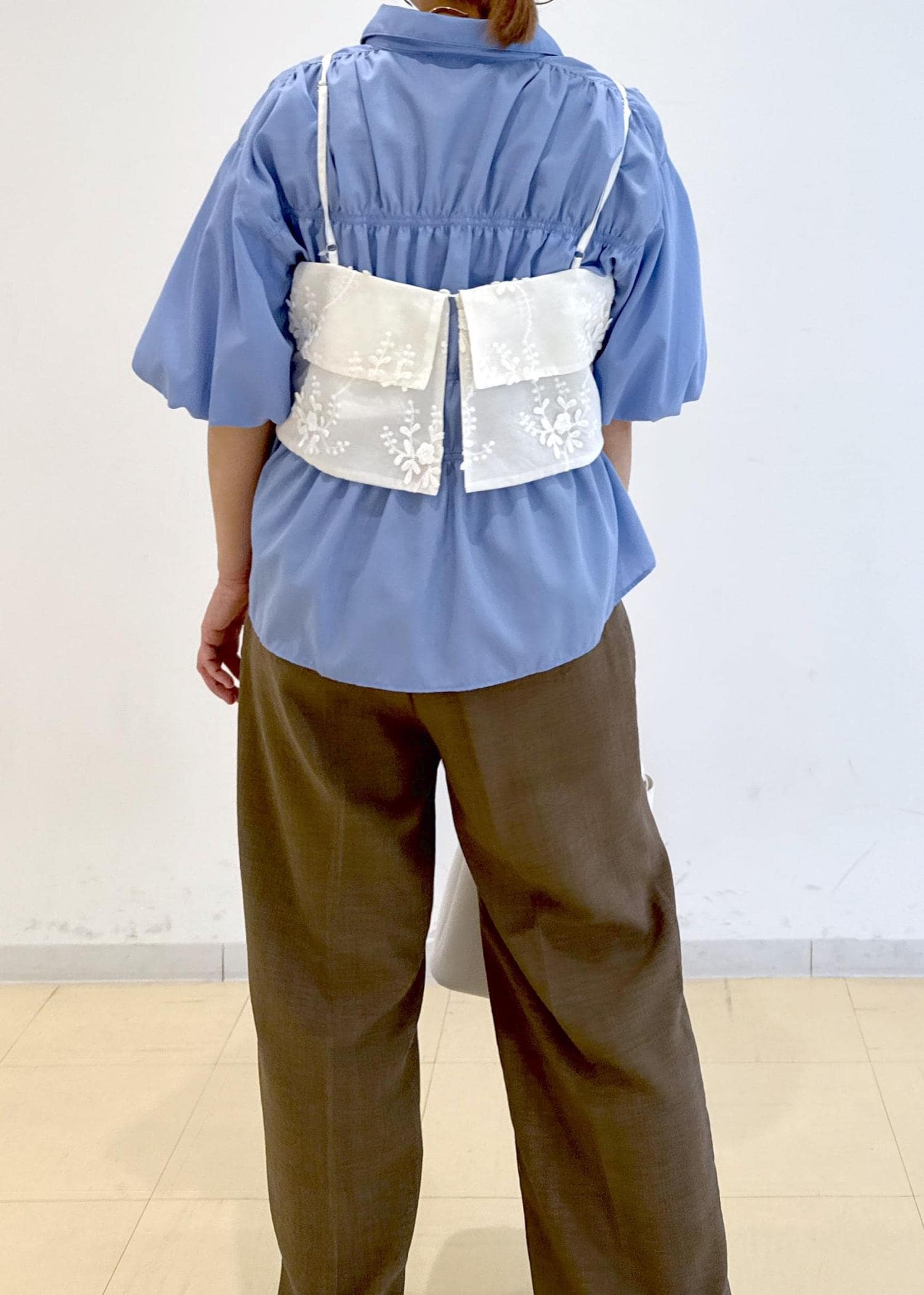 シャーリングのシャツにゆったりとしたビスチェを合わせたレイヤードコーデです!