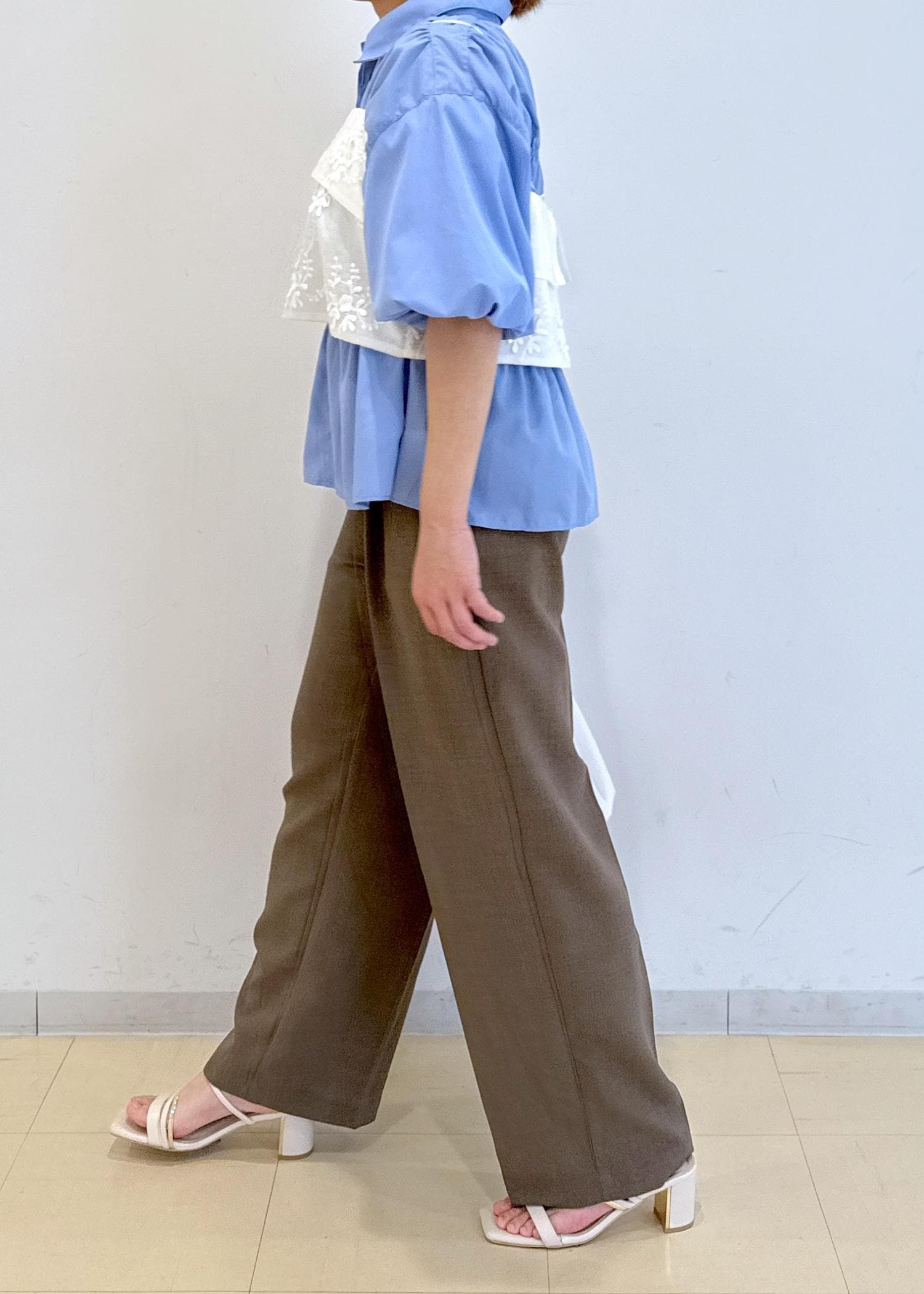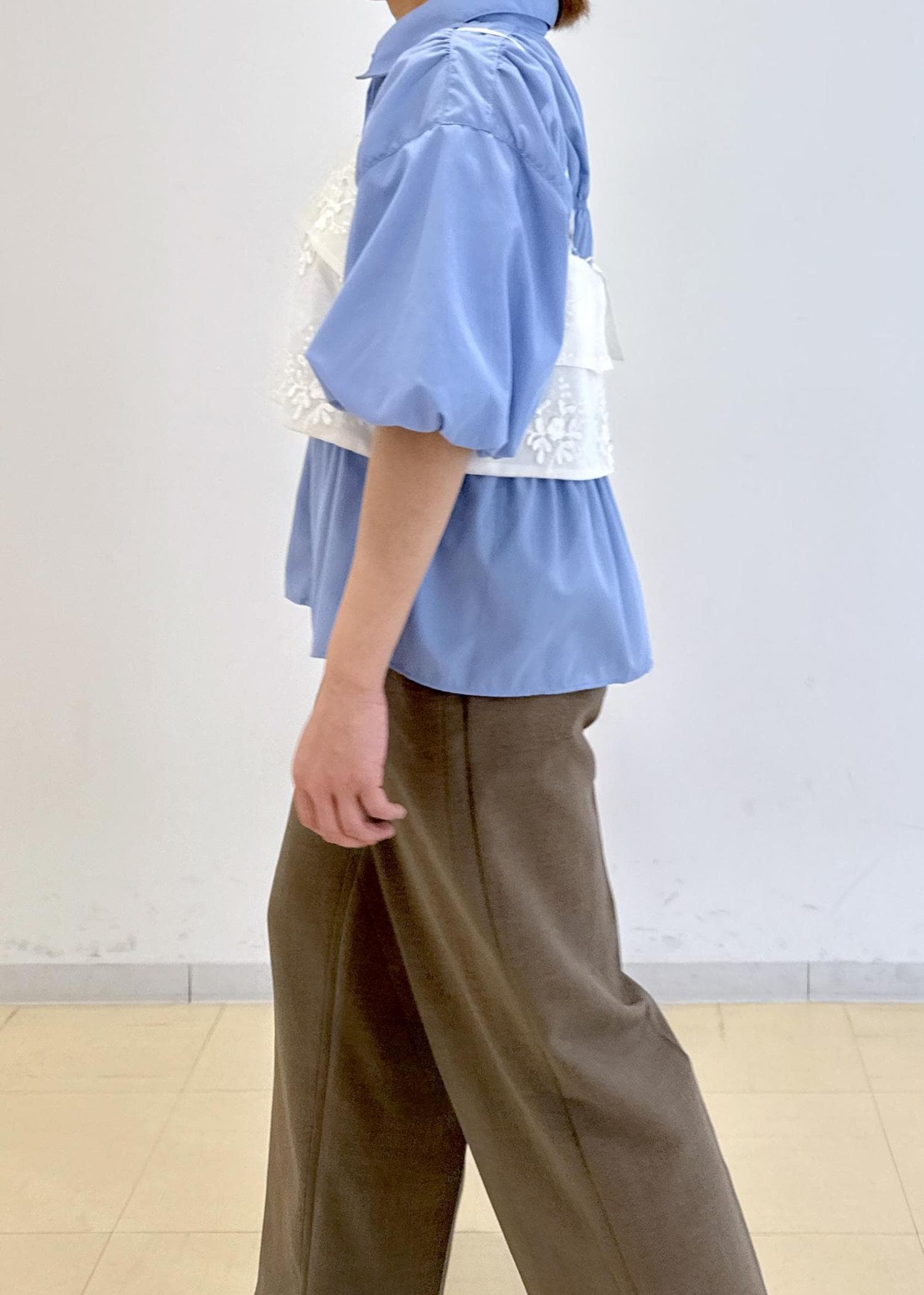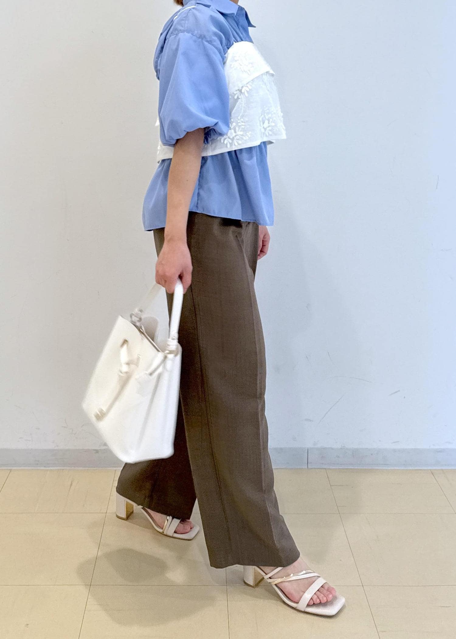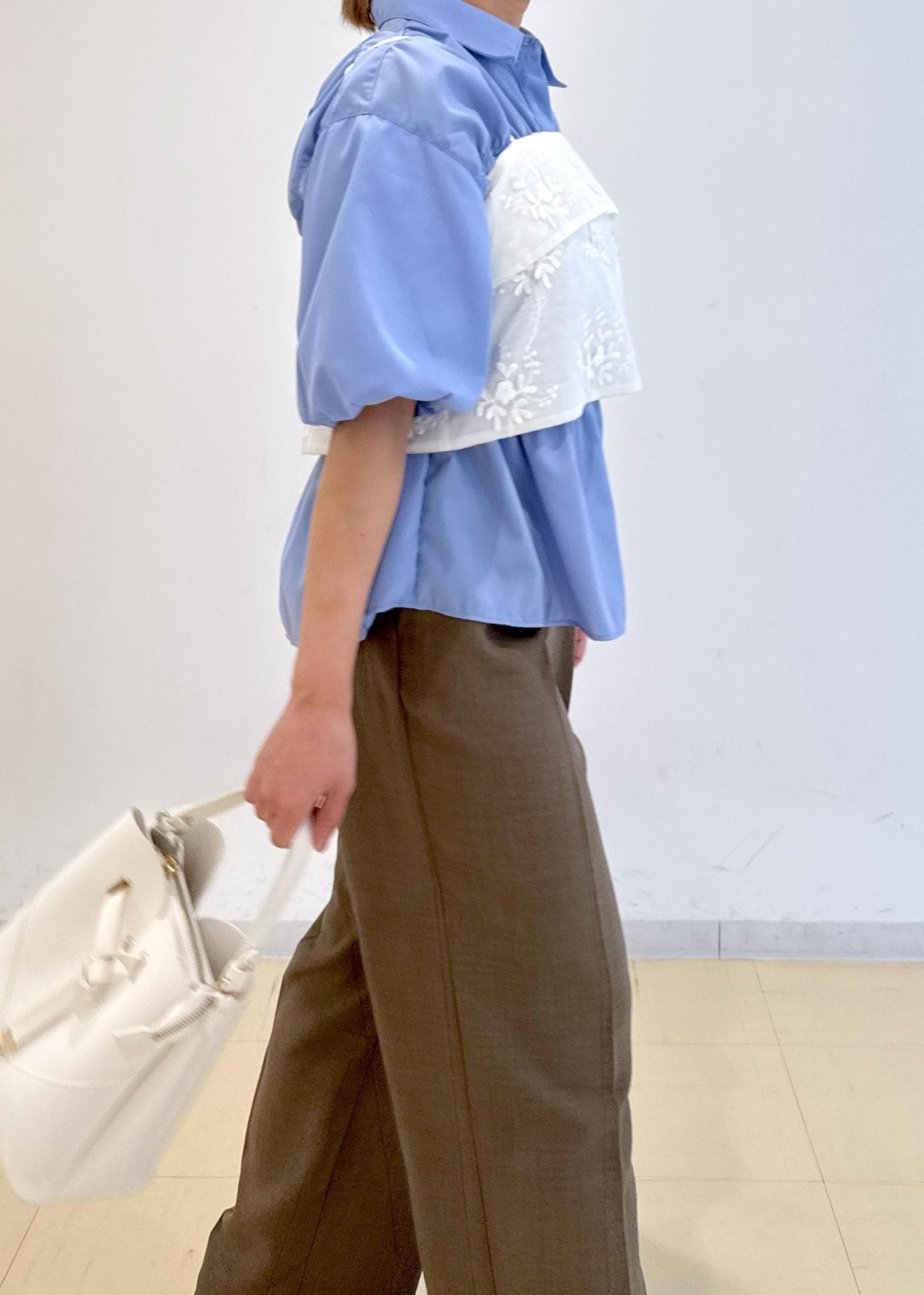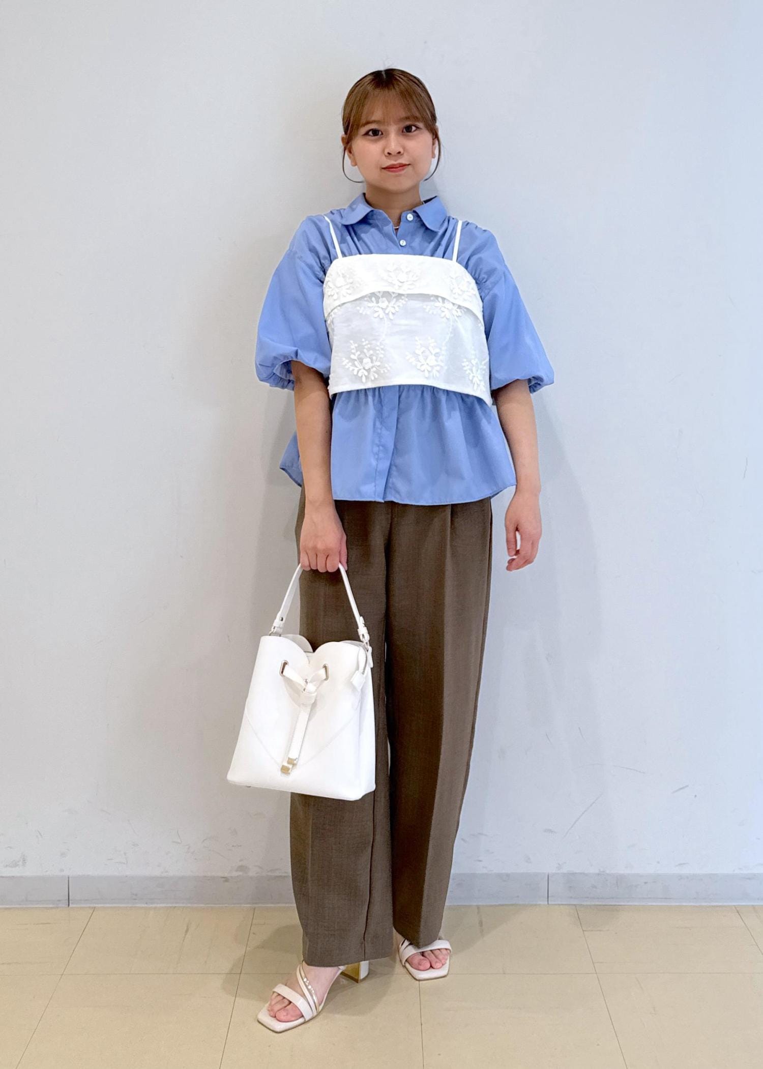 シャーリングのシャツにゆったりとしたビスチェを合わせたレイヤードコーデです!
