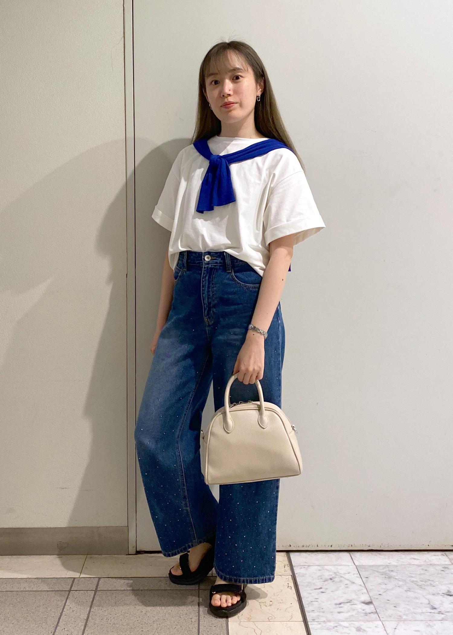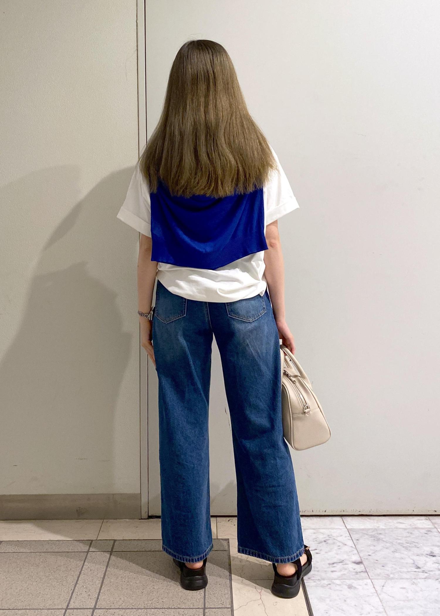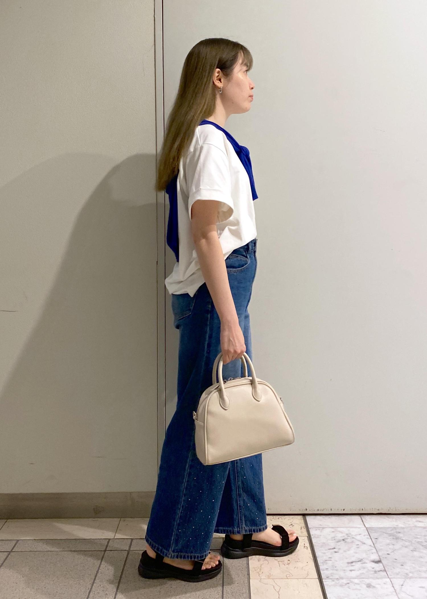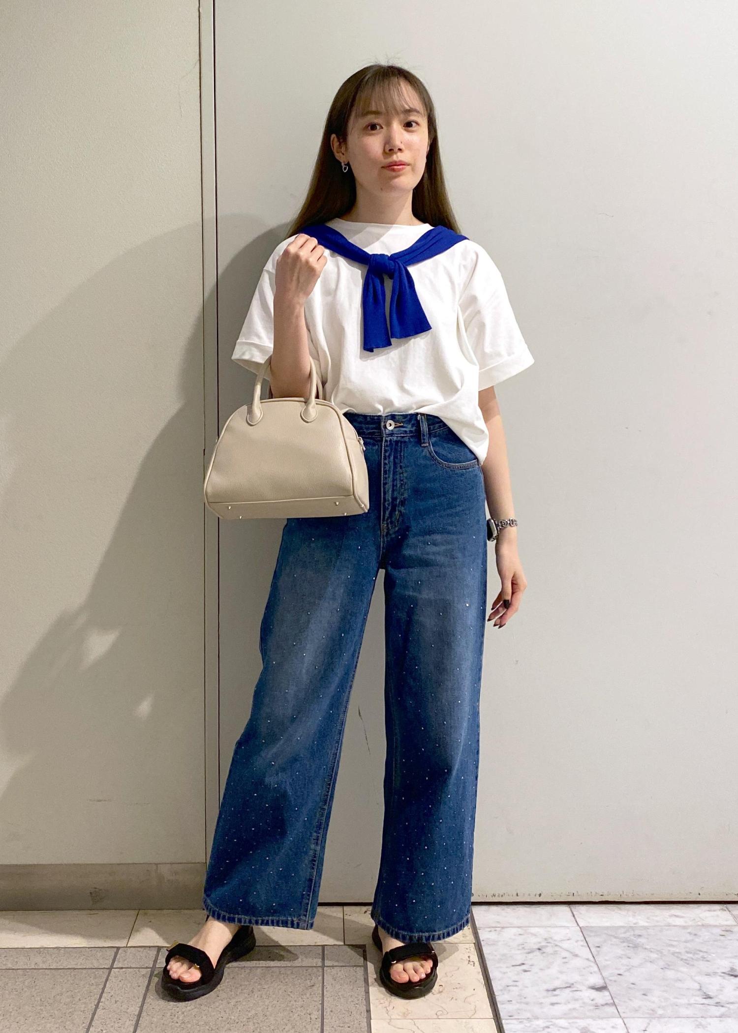 ワイドめのシルエットなので、トップスはスッキリまとめるのがおすすめです。 -