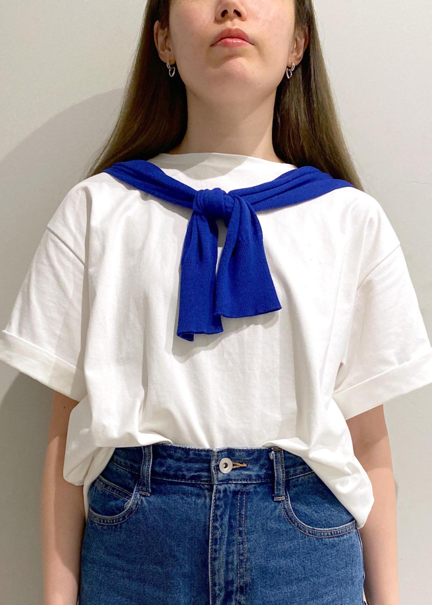 パンツのカラーがブルー系なので、カーディガンのカラーもブルーにして涼しげに揃えました。