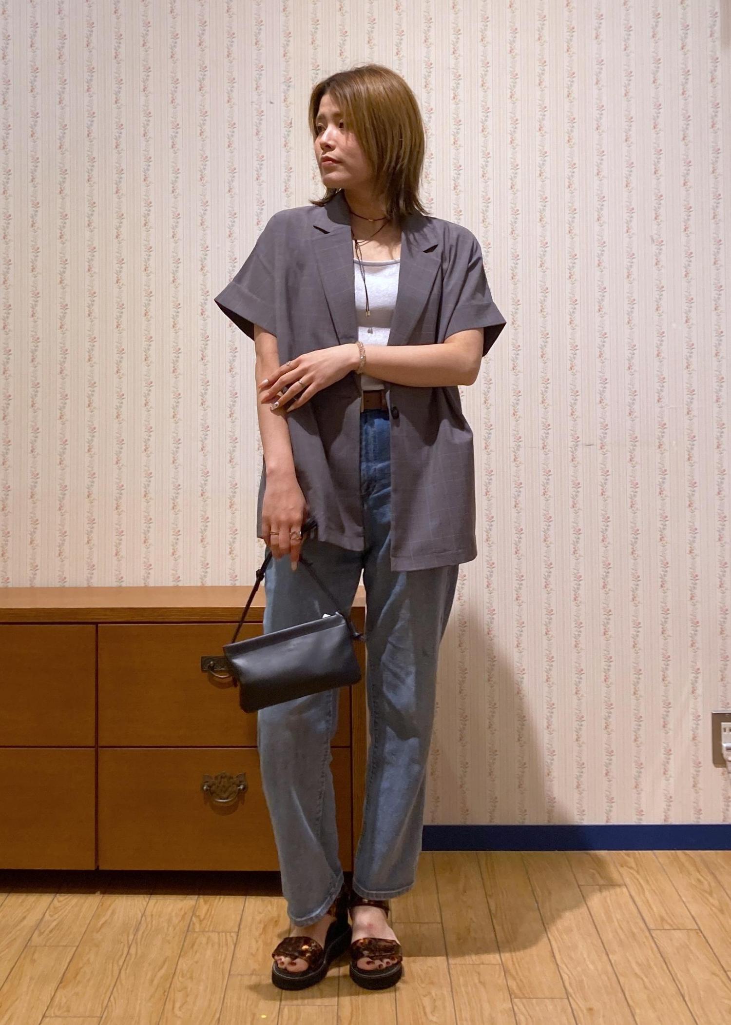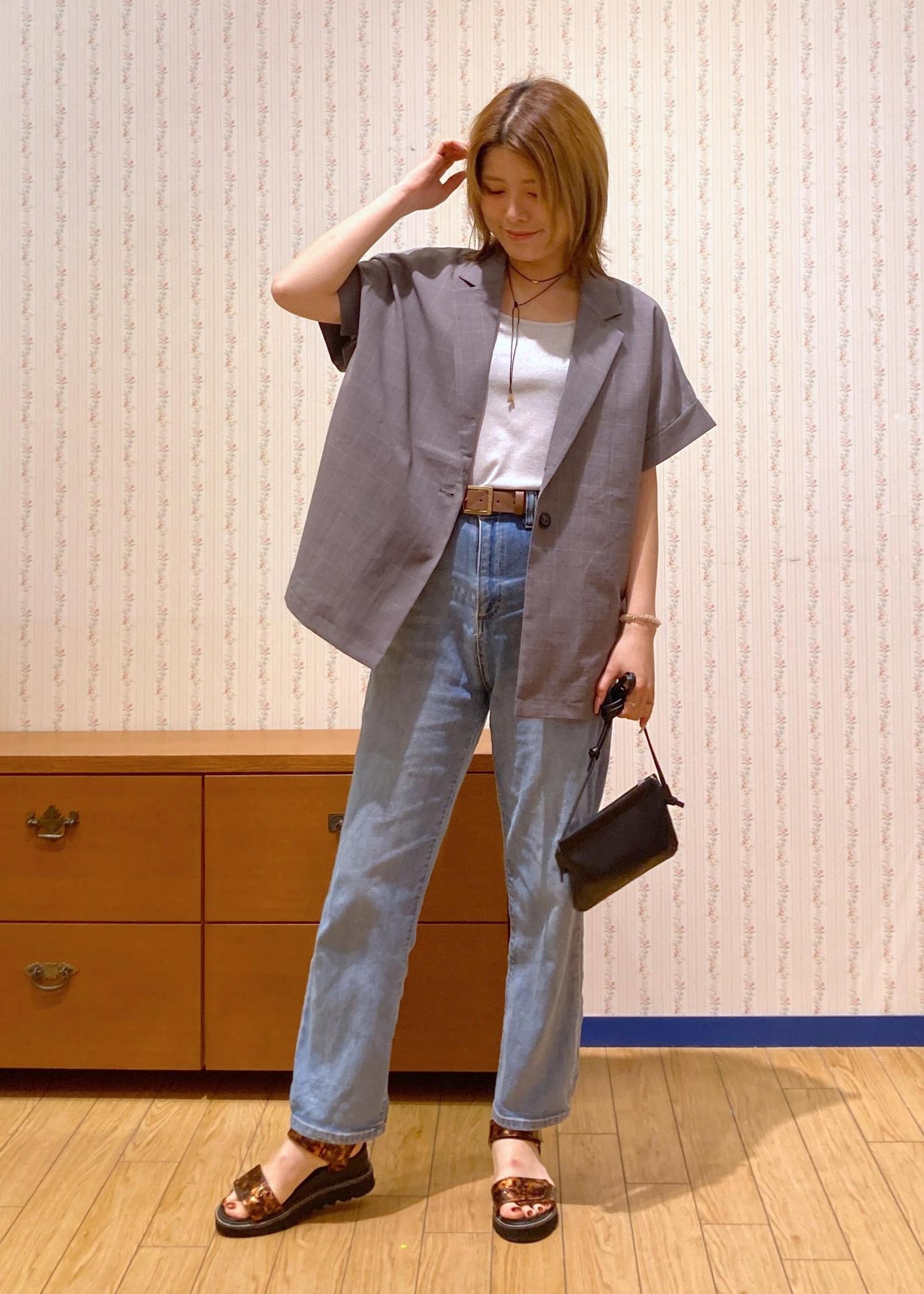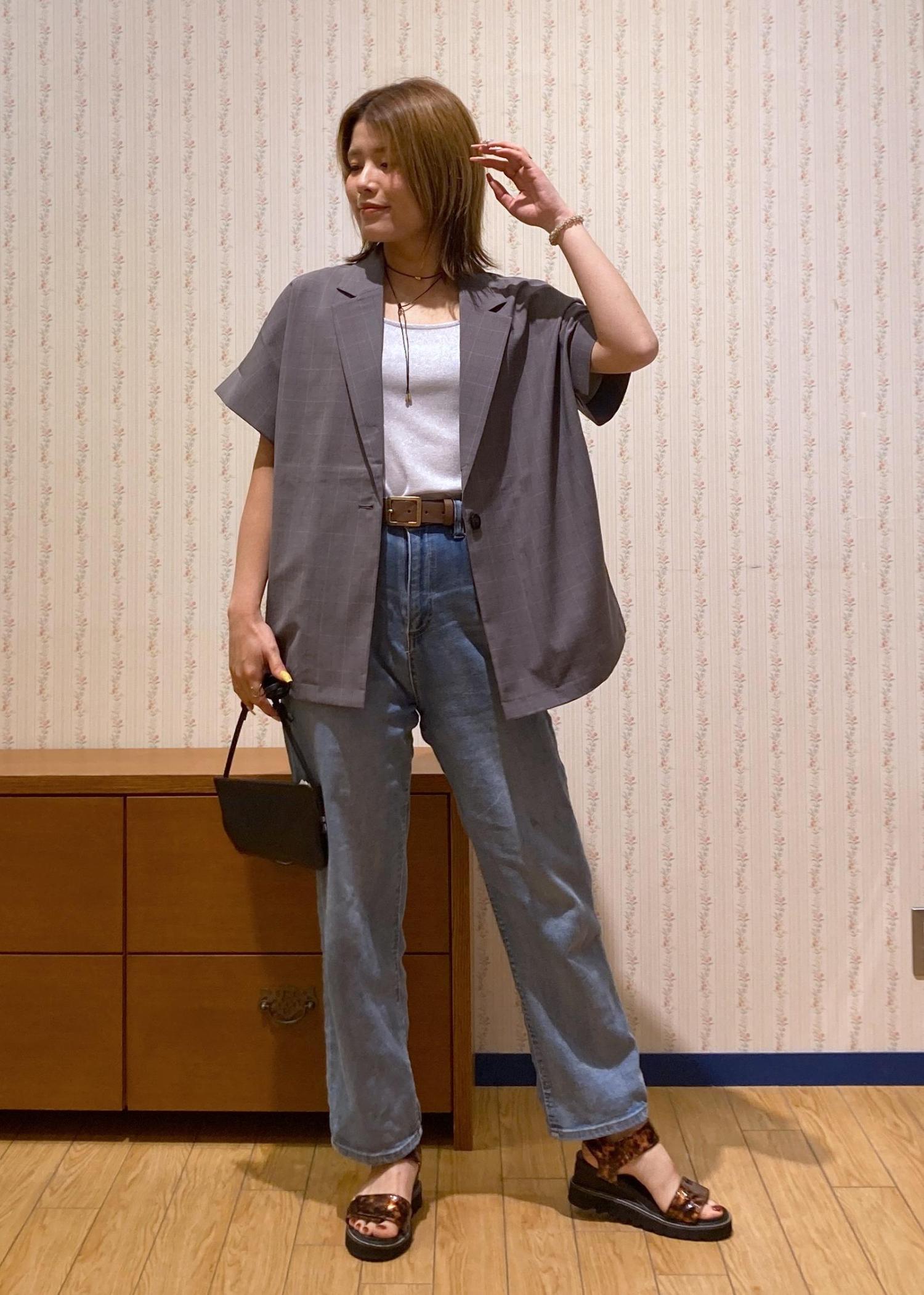 ゆるっとオーバーサイズのジャケットにスッキリシルエットのマムデニムを合わせたメンズライクなカジュアルコーディネートです。