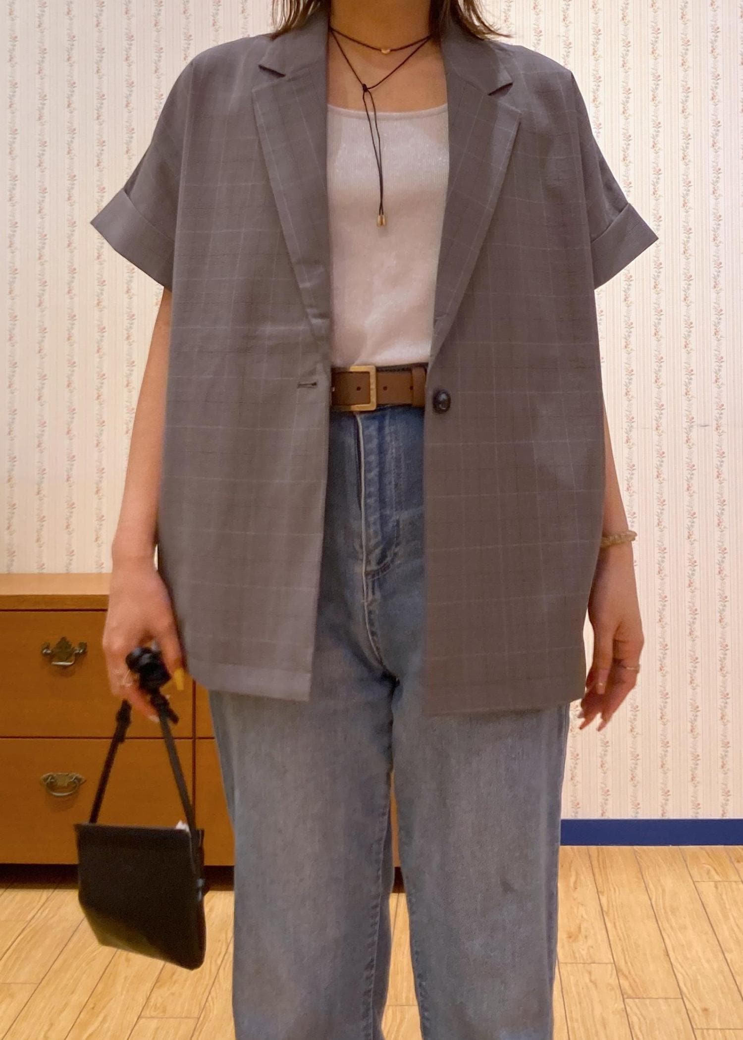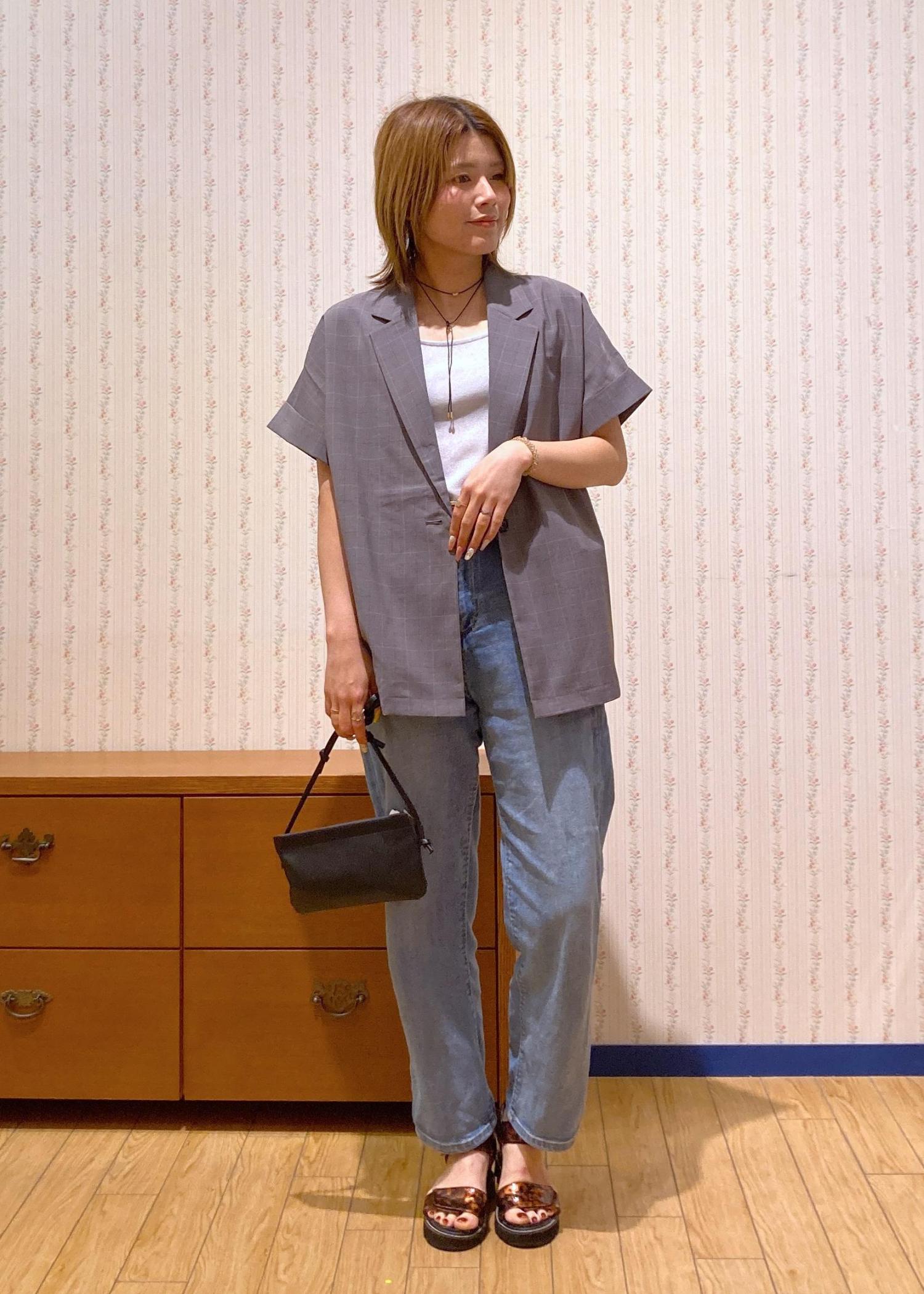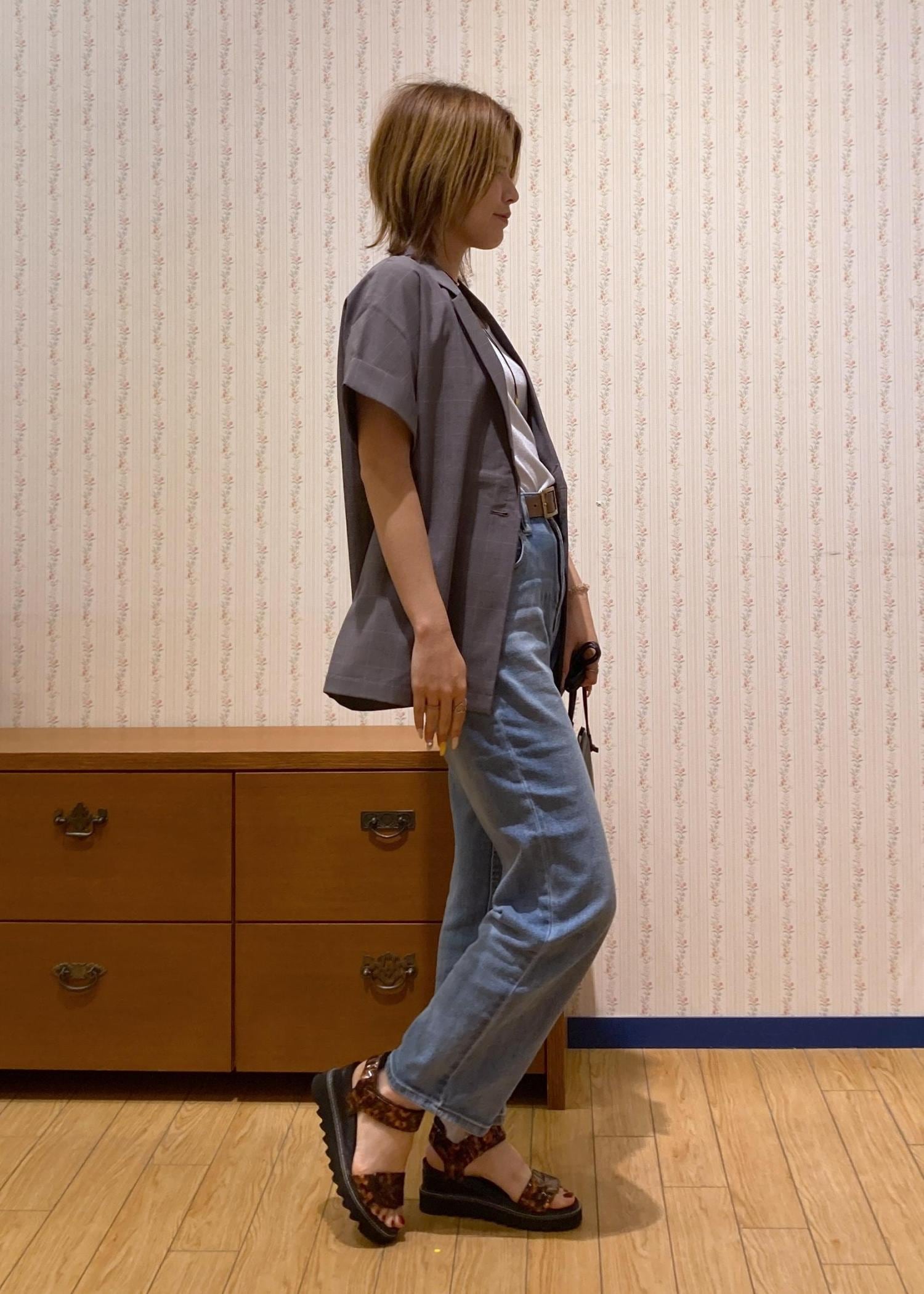 ゆるっとオーバーサイズのジャケットにスッキリシルエットのマムデニムを合わせたメンズライクなカジュアルコーディネートです。