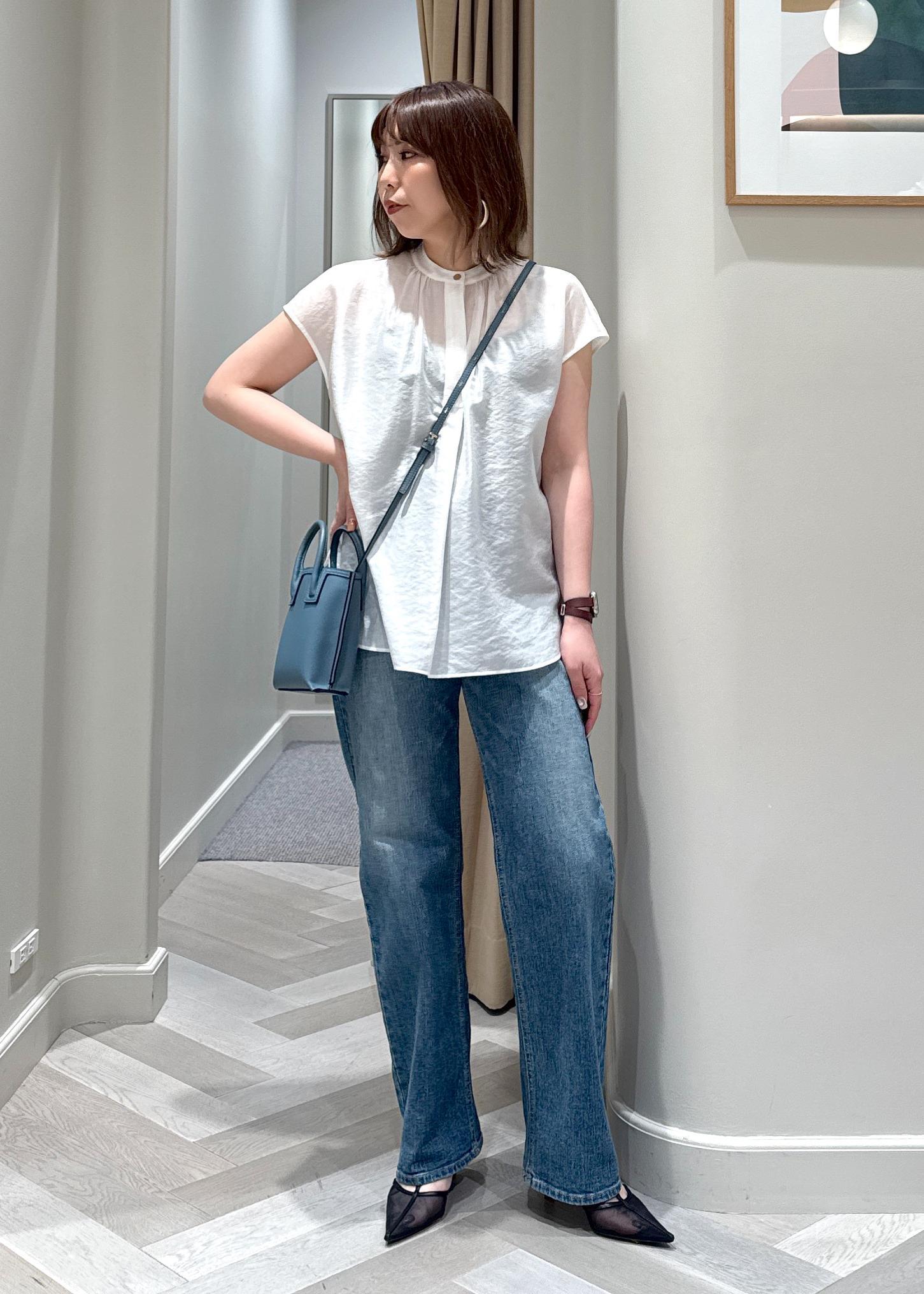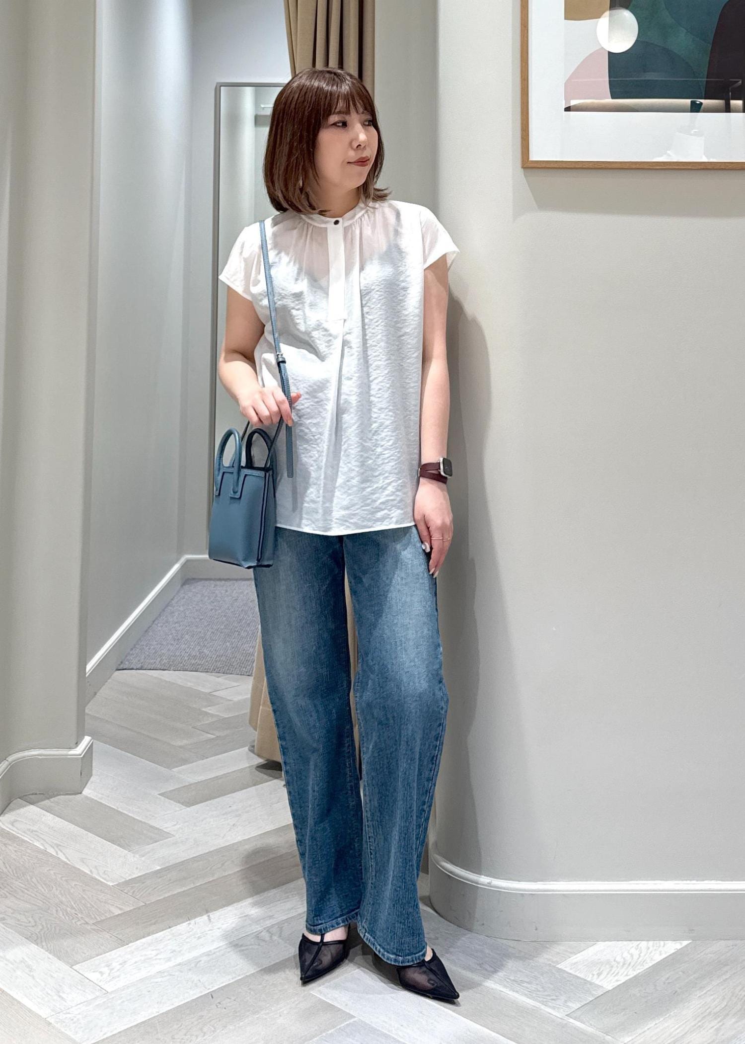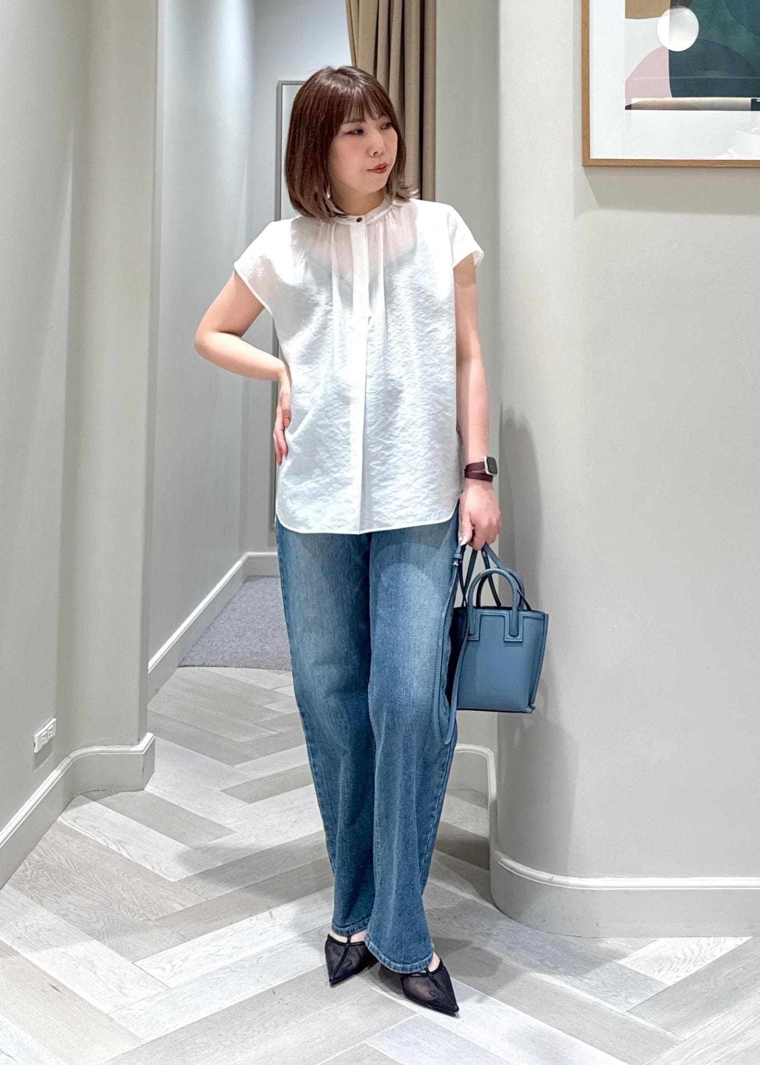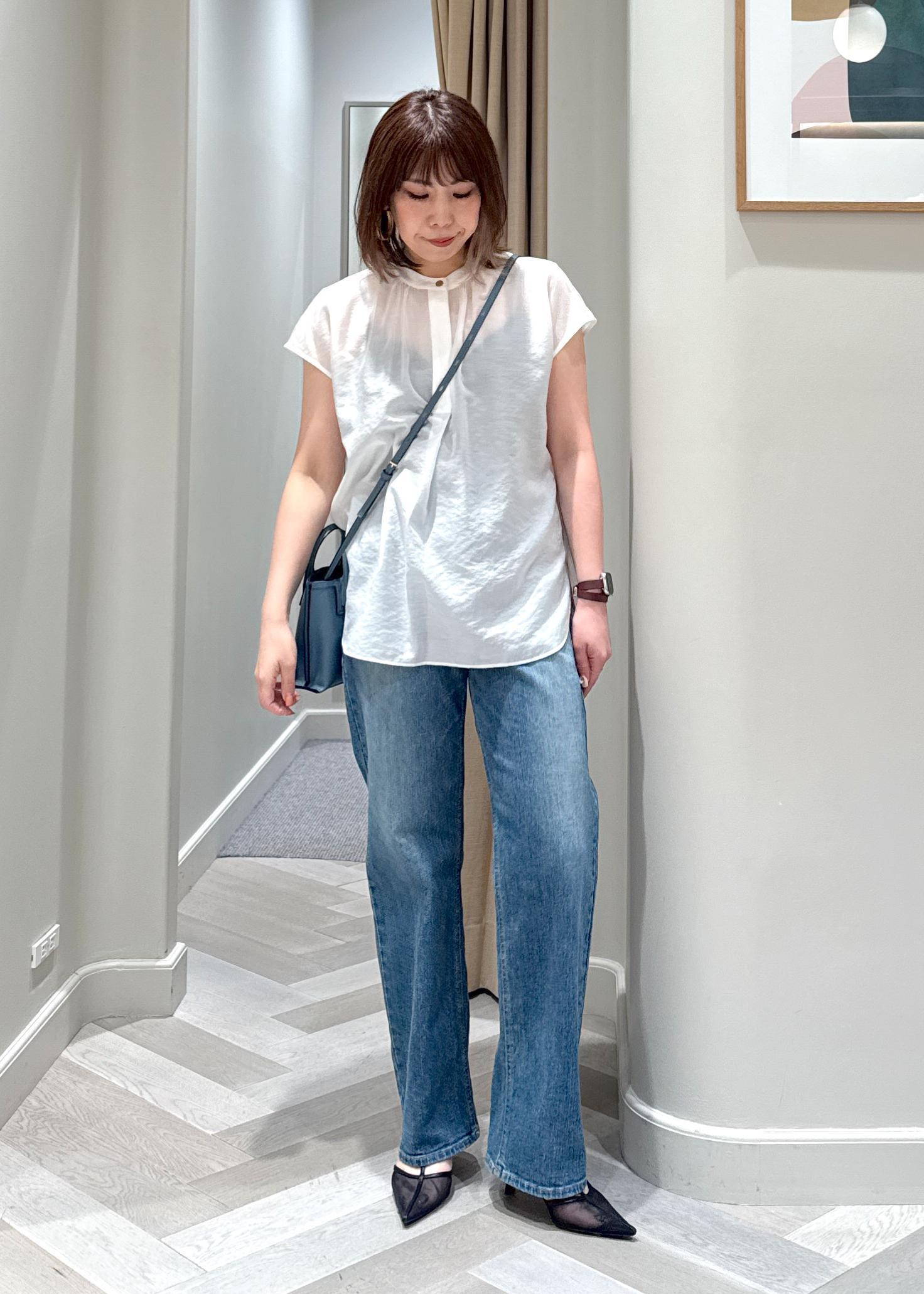 ブラウスとデニムのきれいめカジュアルコーデ。