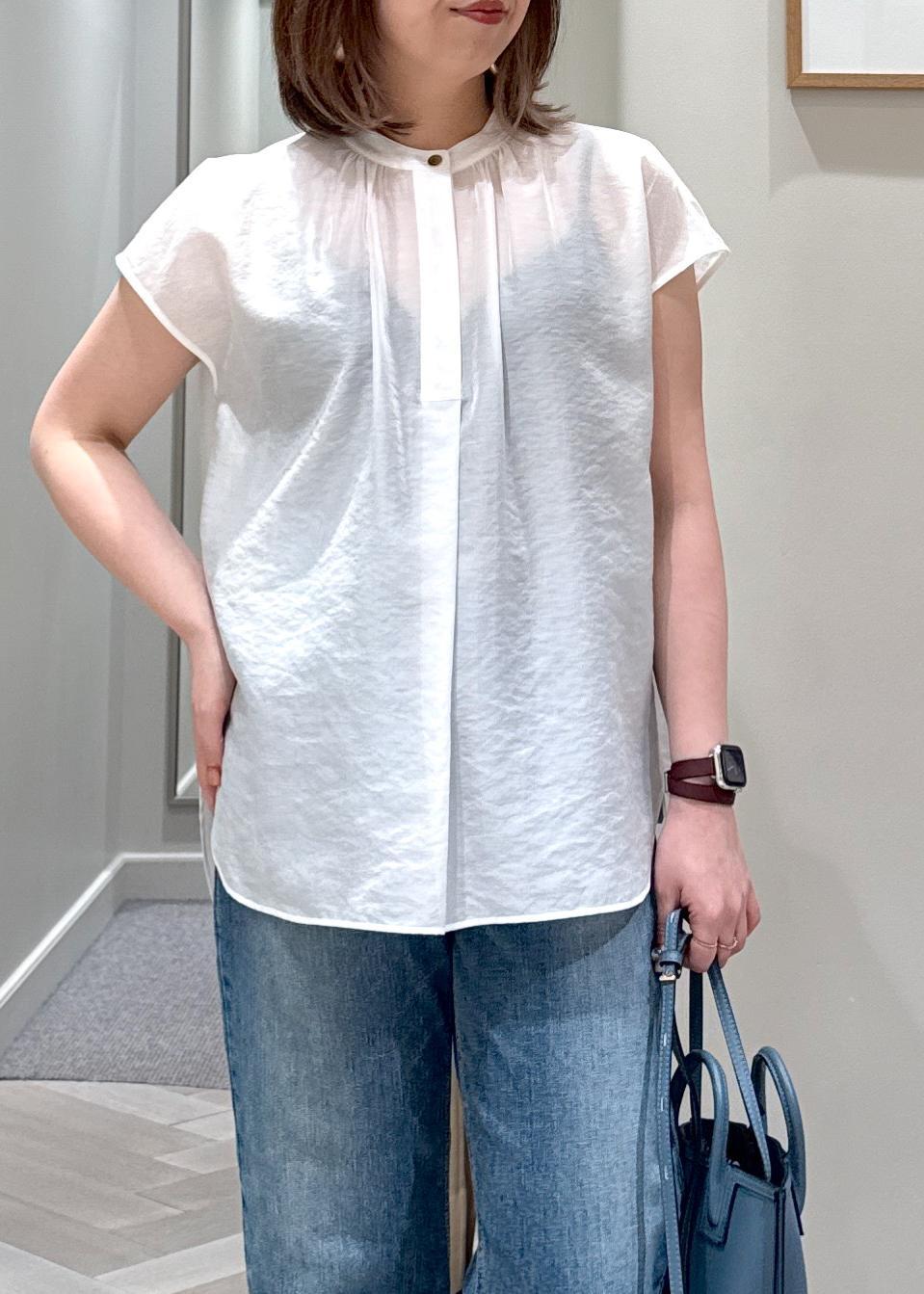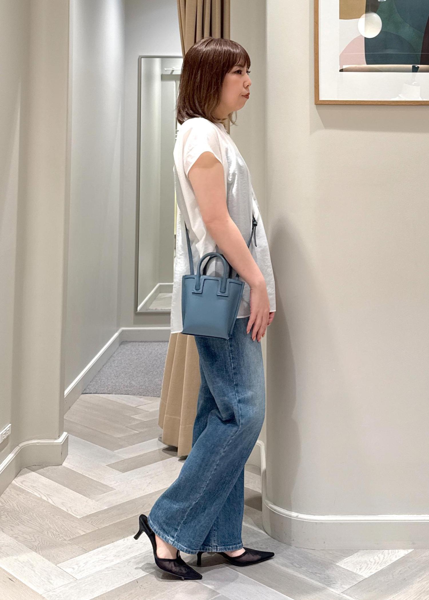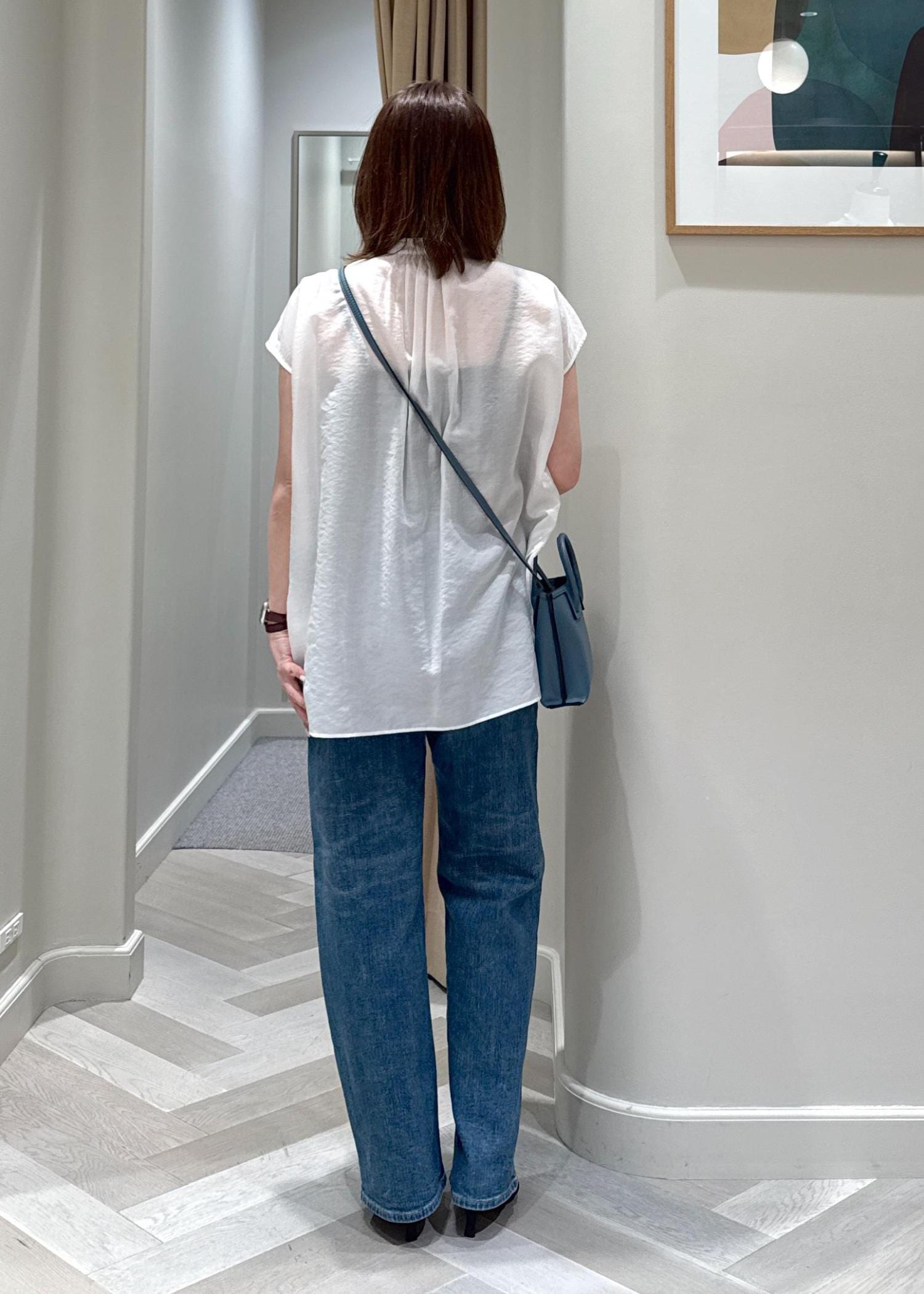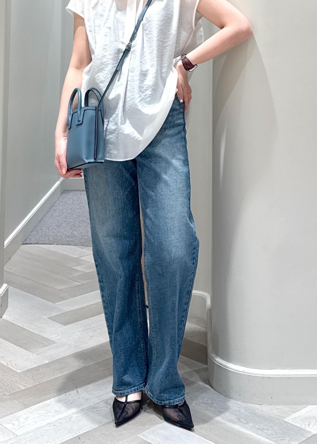 ブラウスとデニムのきれいめカジュアルコーデ。