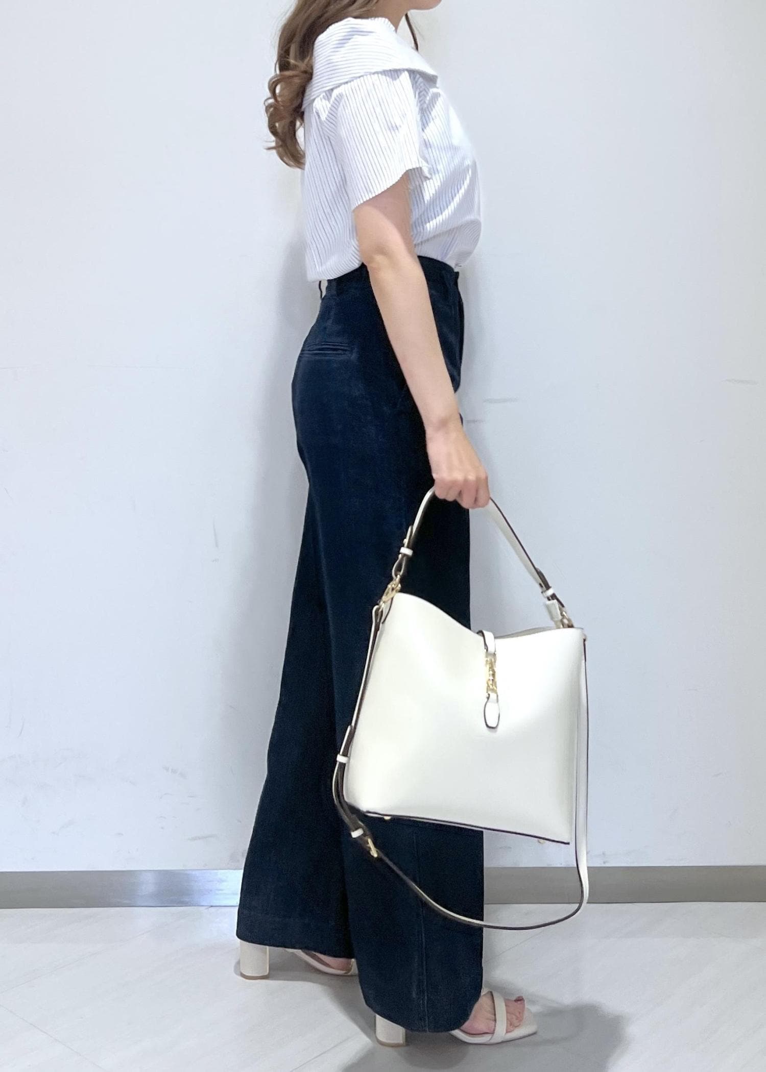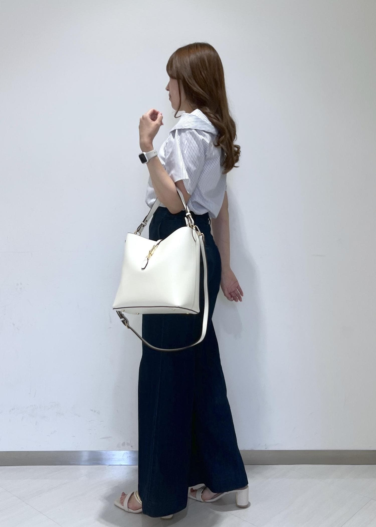 VIS【新色追加】【防シワ】ラメミックスオフショルダー風ストライプシャツホワイト系 / F¥5,489レビュー被るだけでお洒落に着用頂けます!インをしなくても着回せます。インナーの肩紐は隠れるので気になりません◎