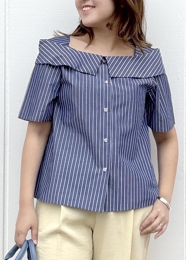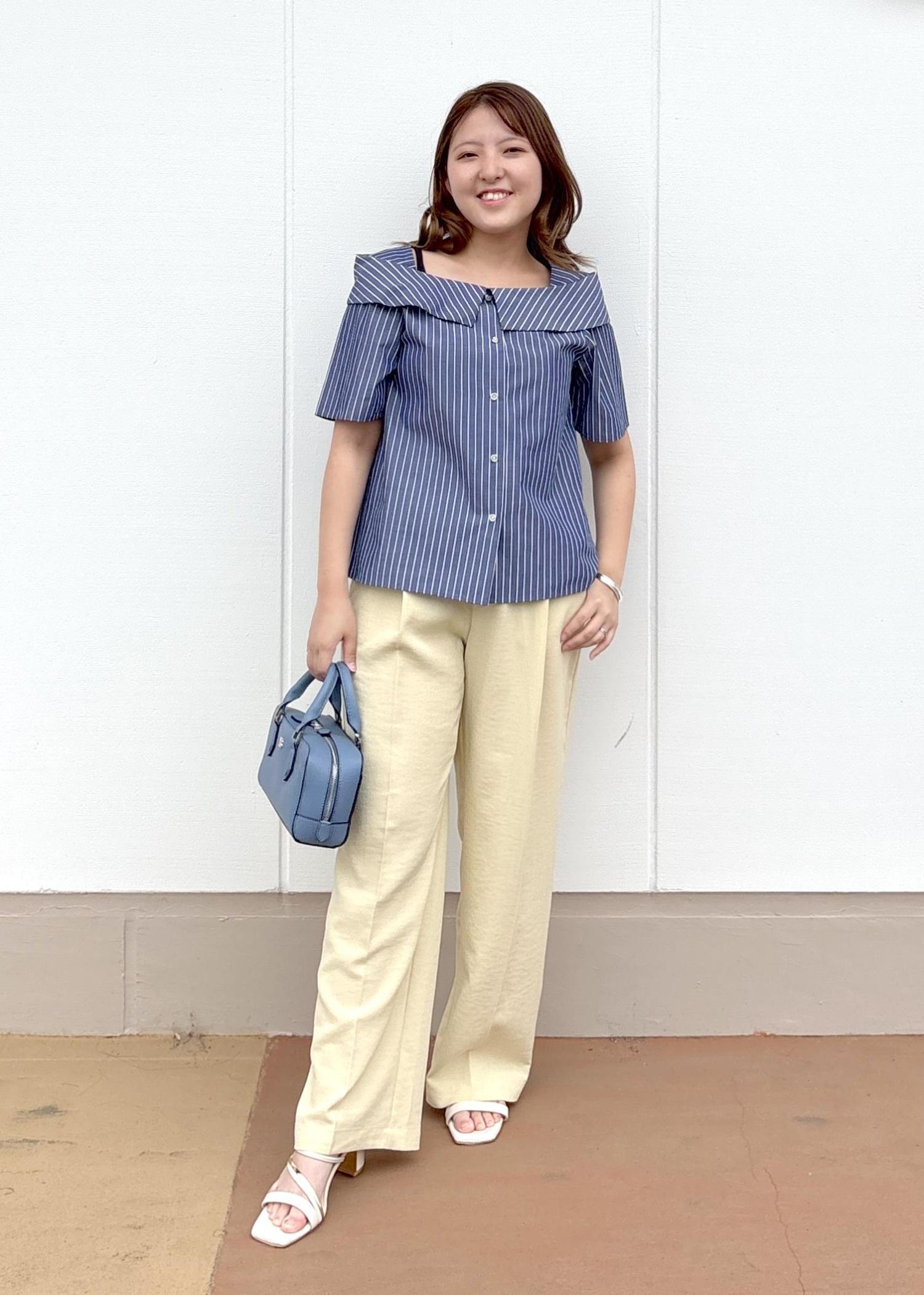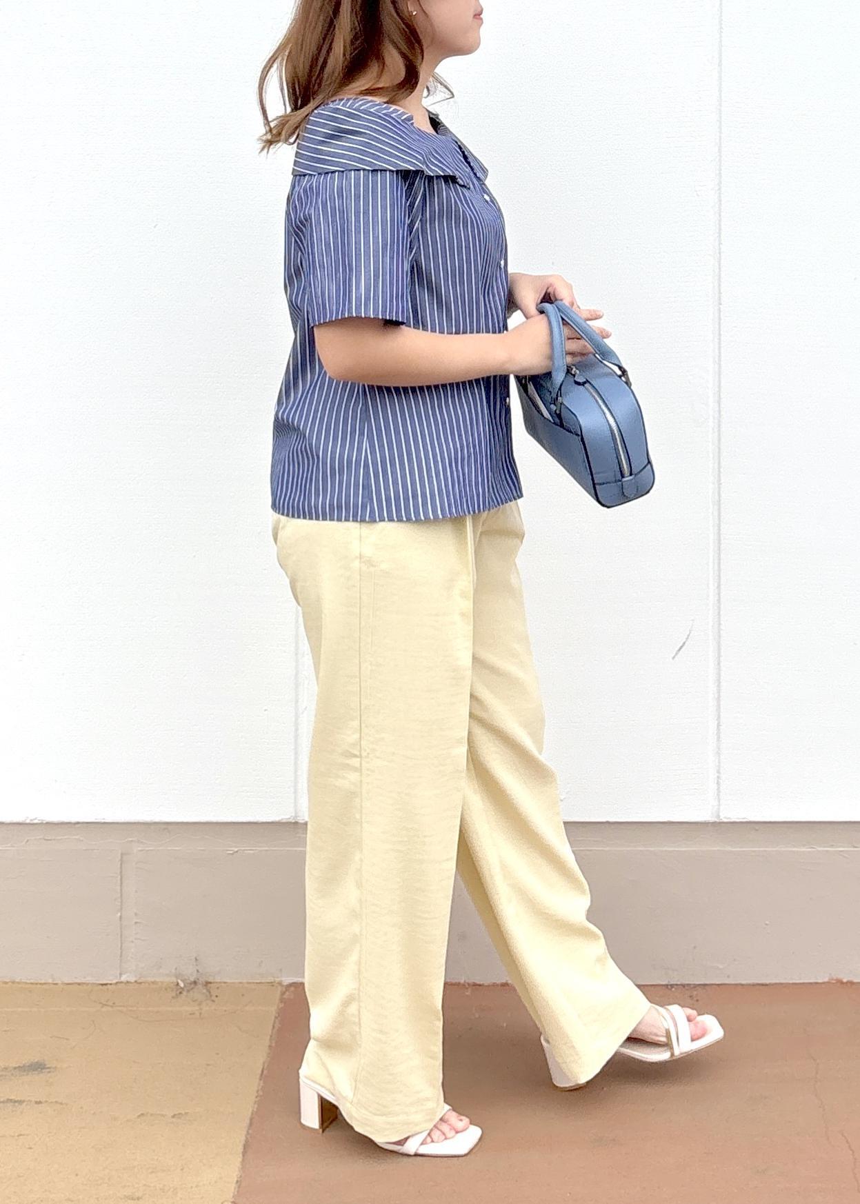 VIS【新色追加】【防シワ】ラメミックスオフショルダー風ストライプシャツブルー系 / F¥5,489レビューオフショル風なので安心して着られます!
