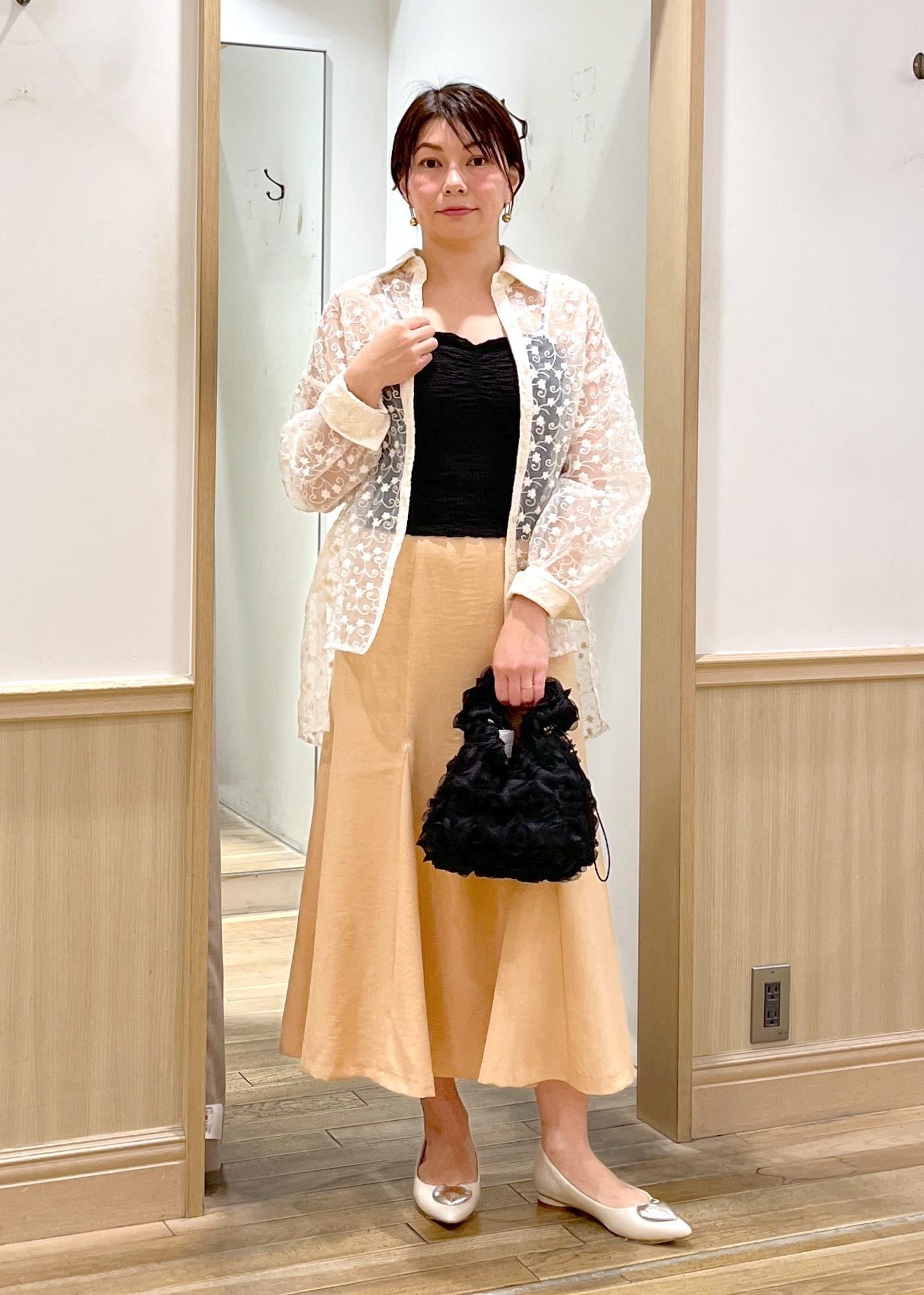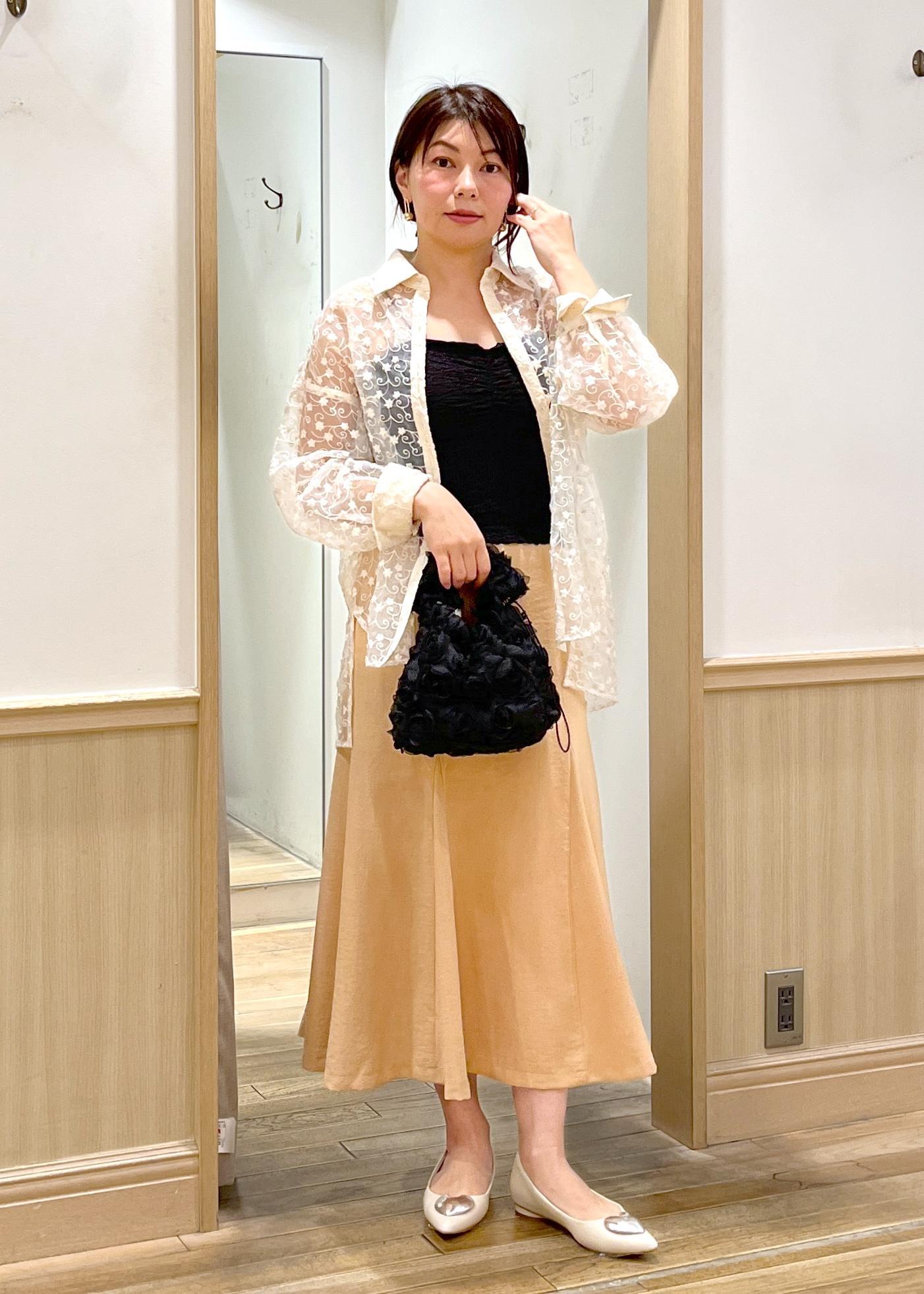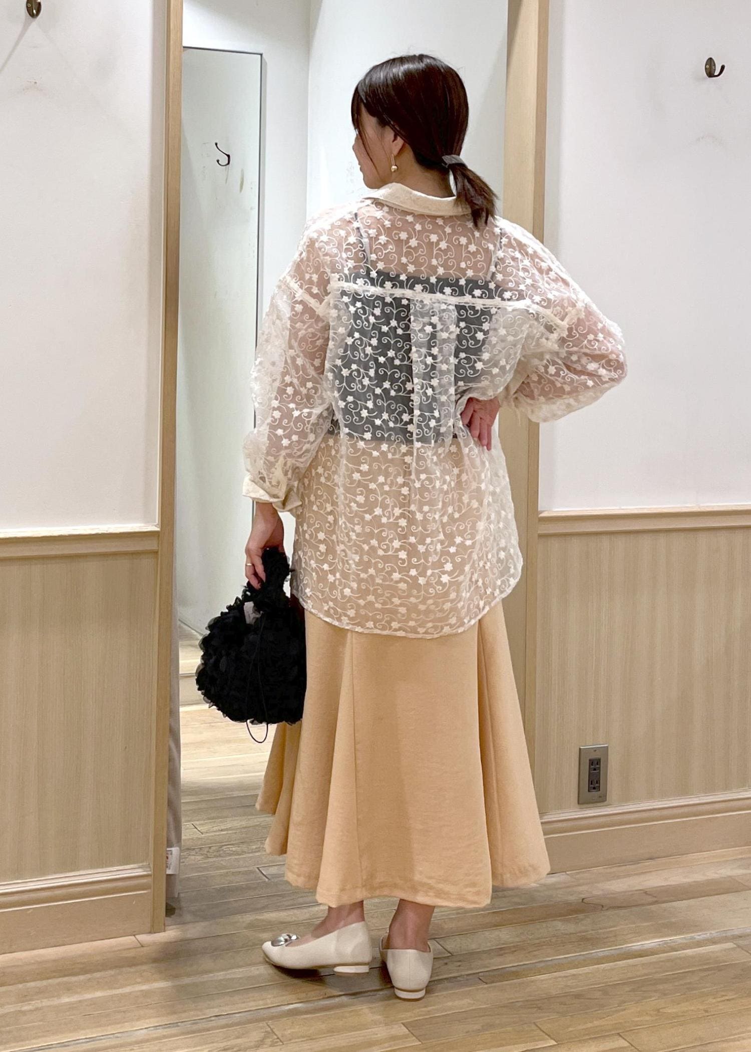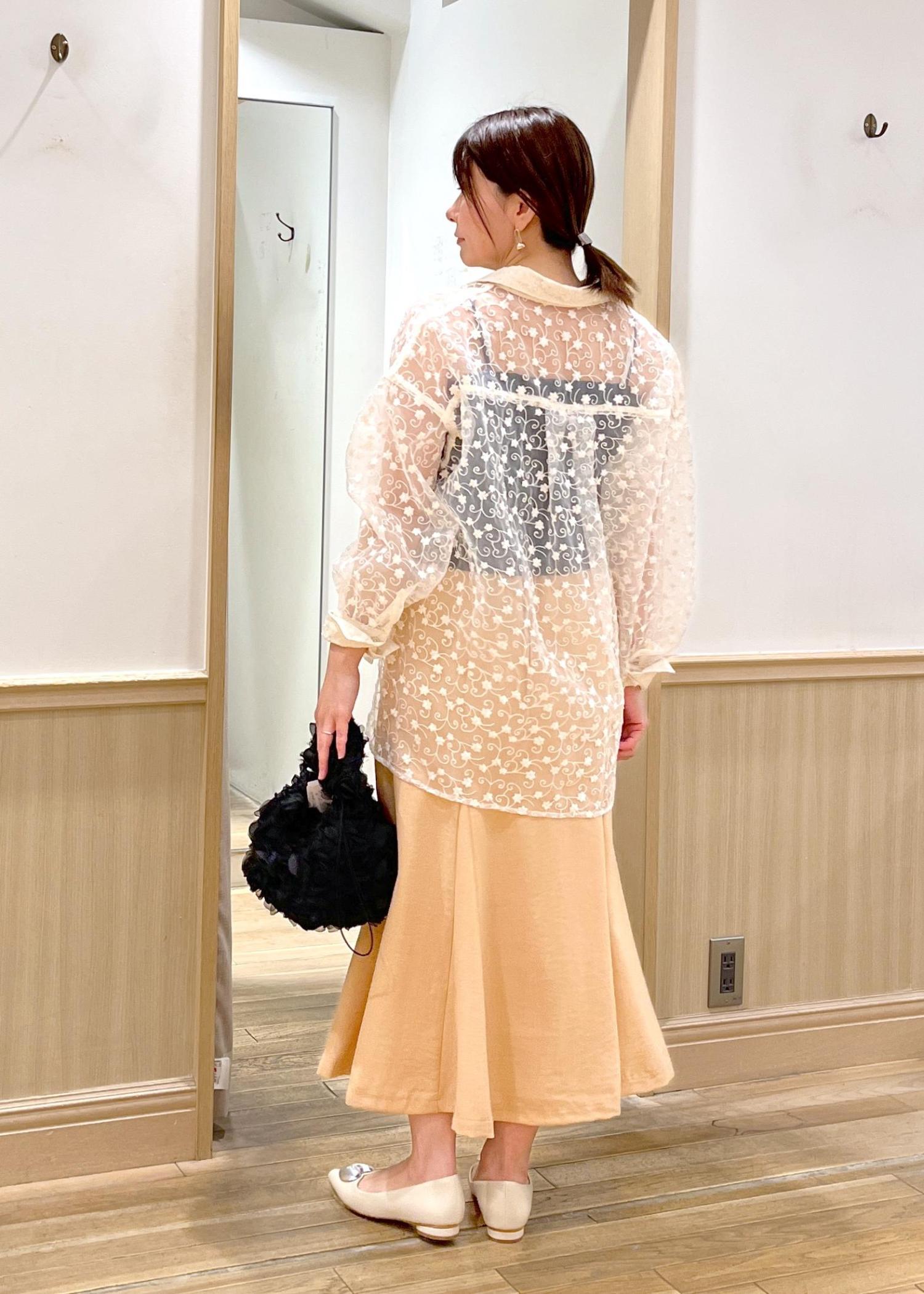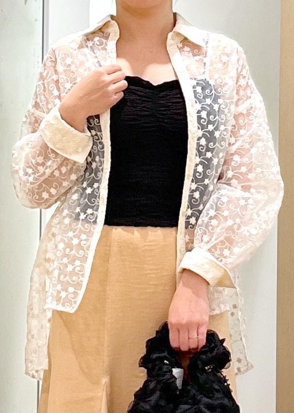 全体に花柄の刺繍が施されてとても可愛らしいブラウスです。シアーのおかげで快適に夏でも着られそうです! -
