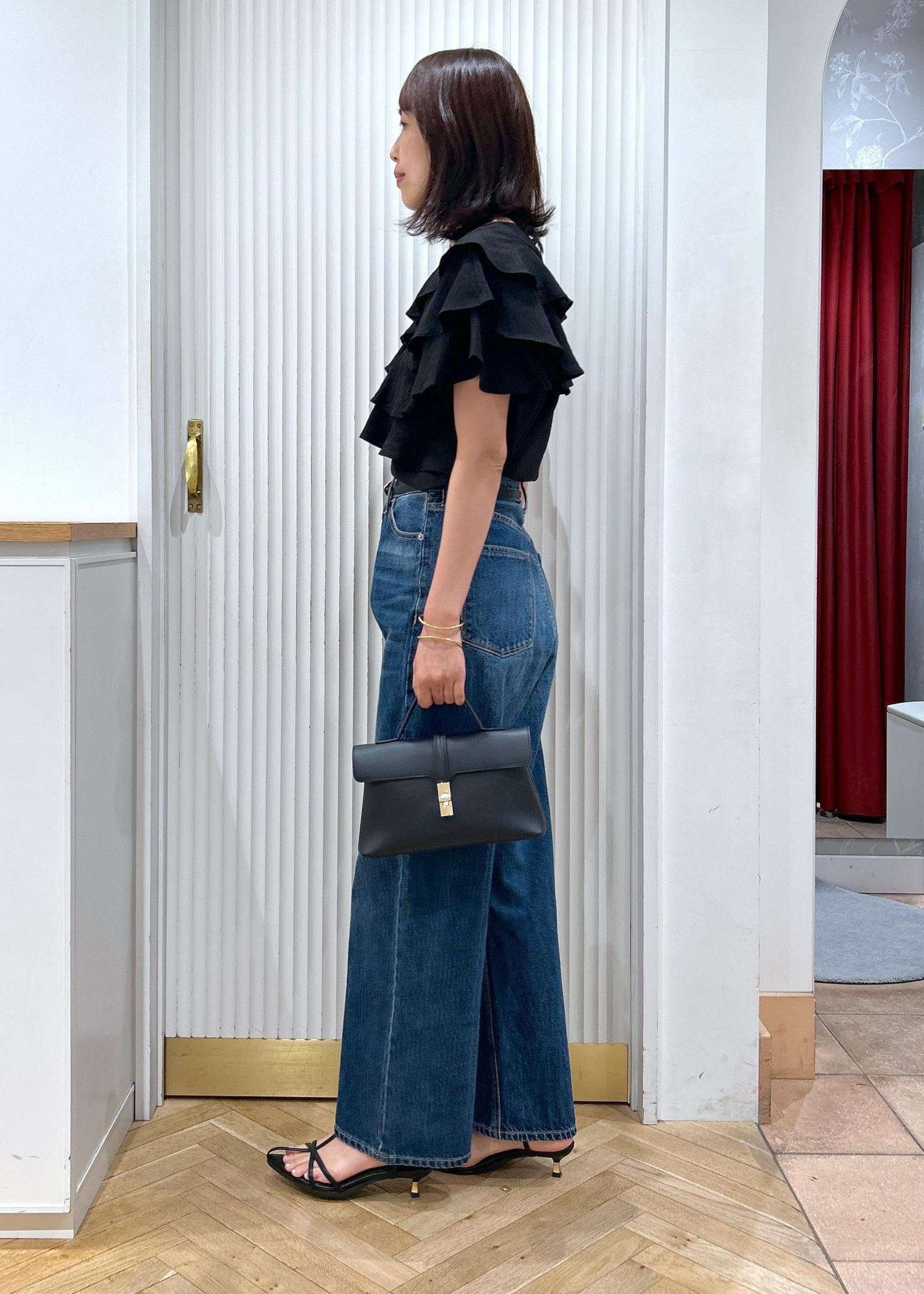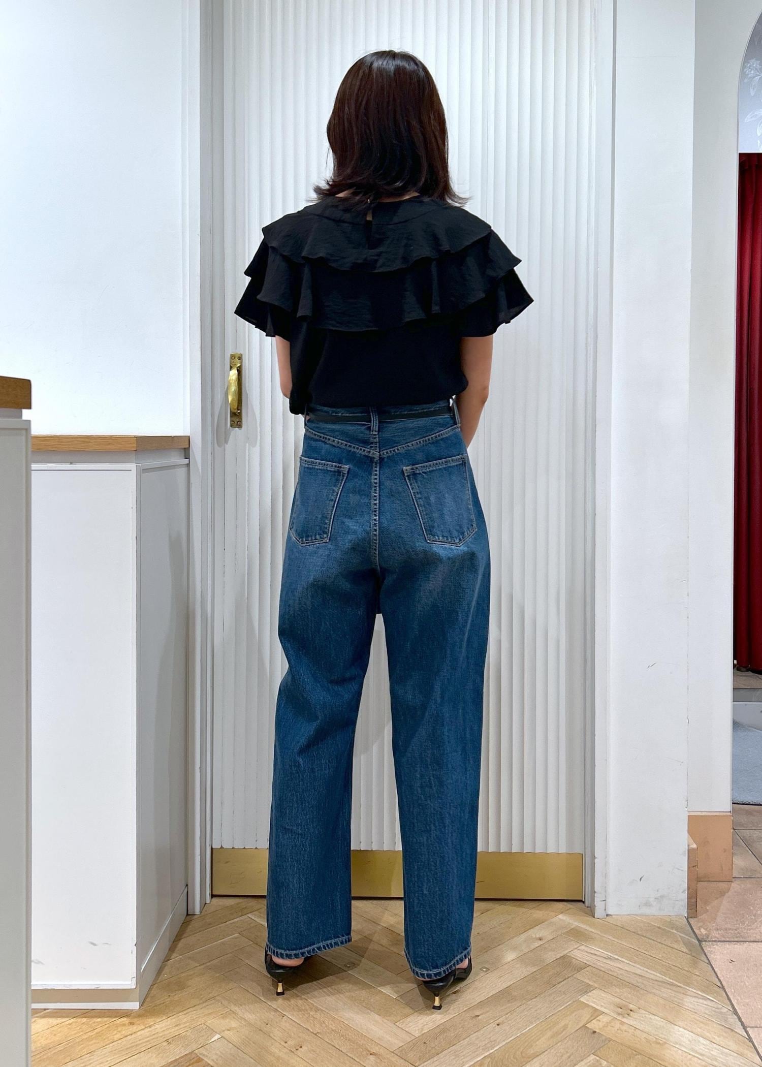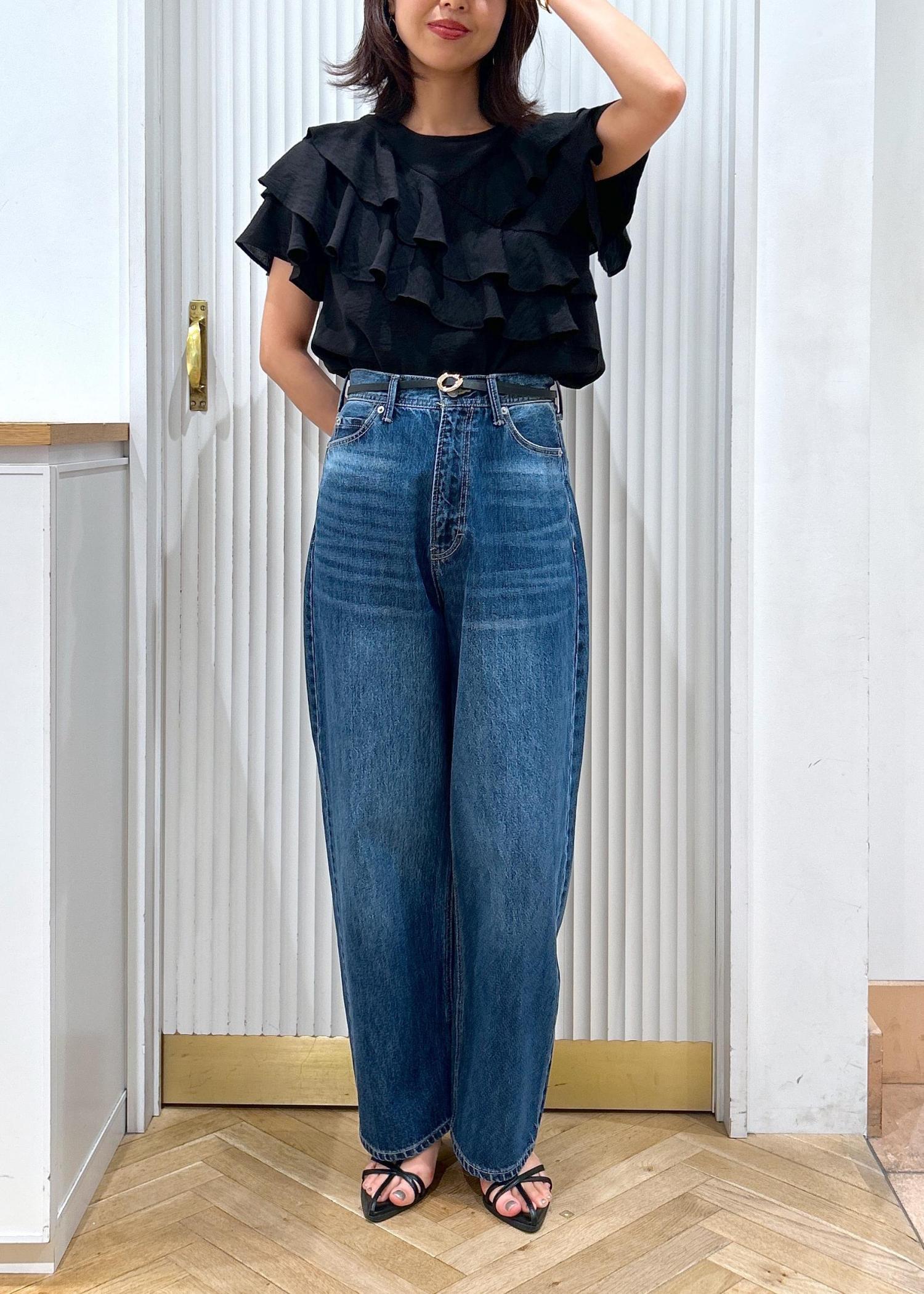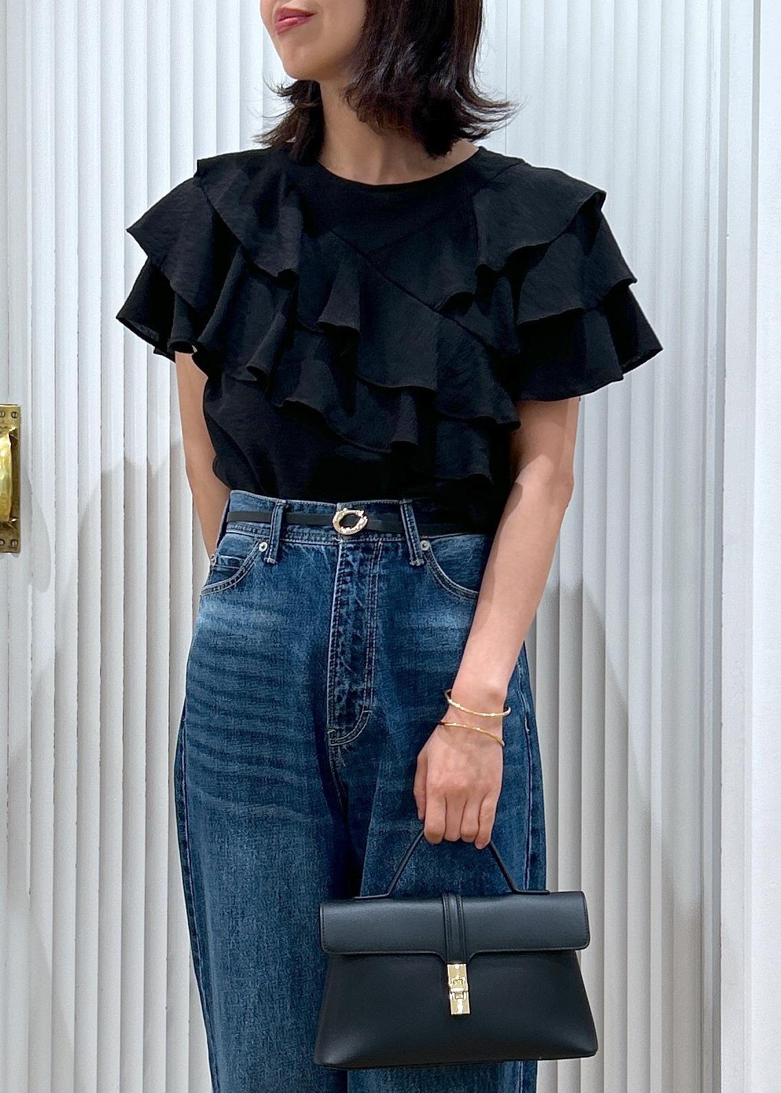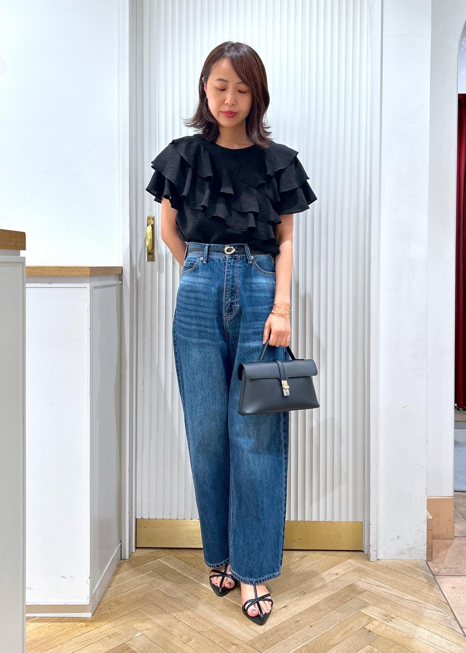 フリルが可愛いブラウスをデニムと合わせたコーディネートです。
