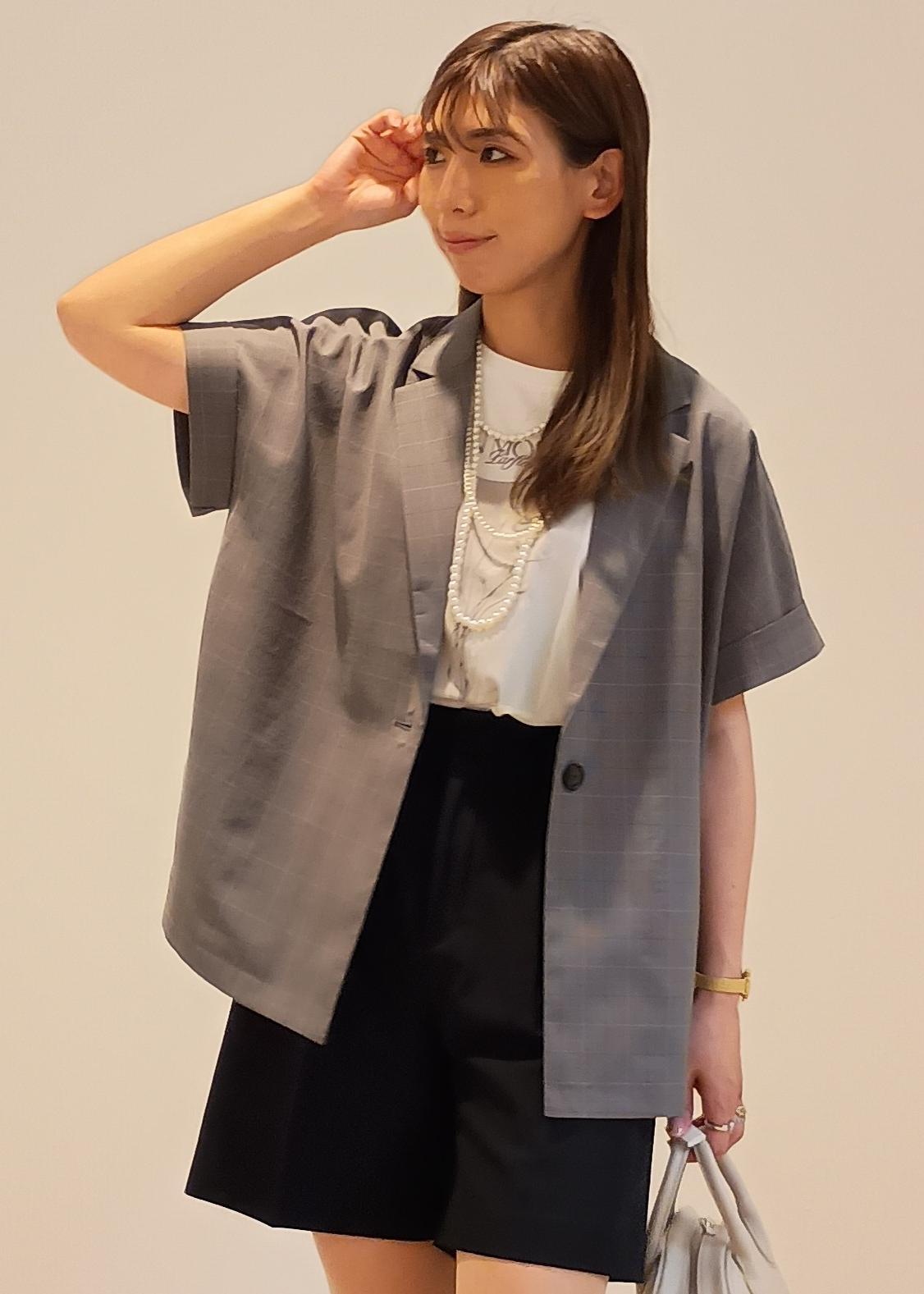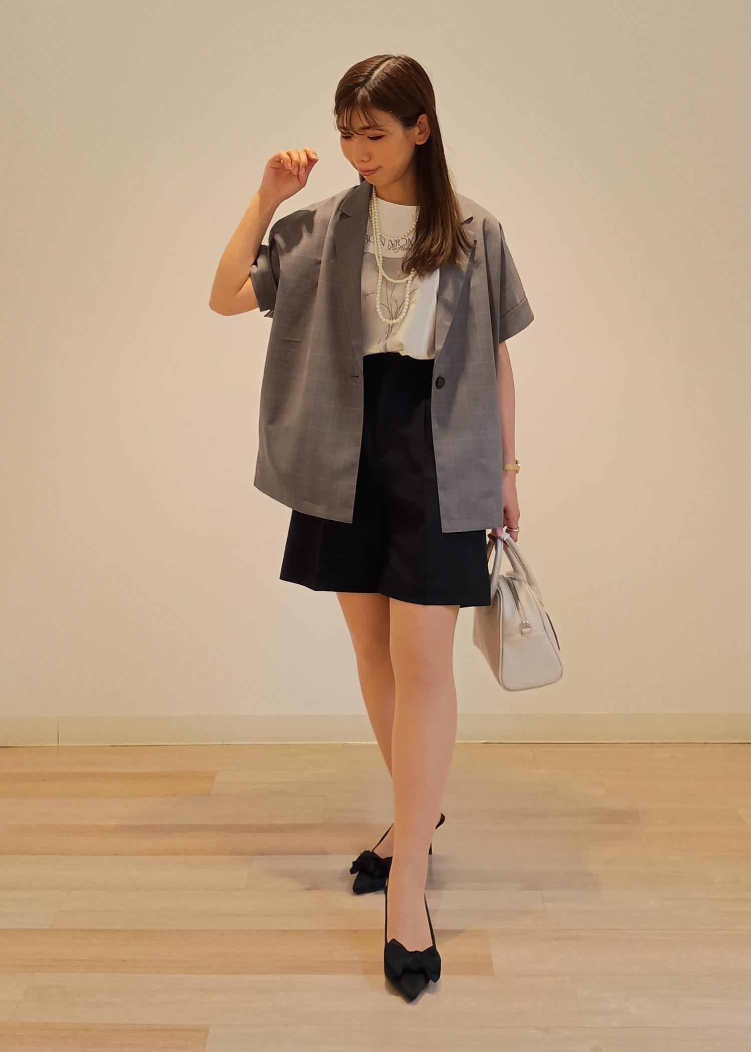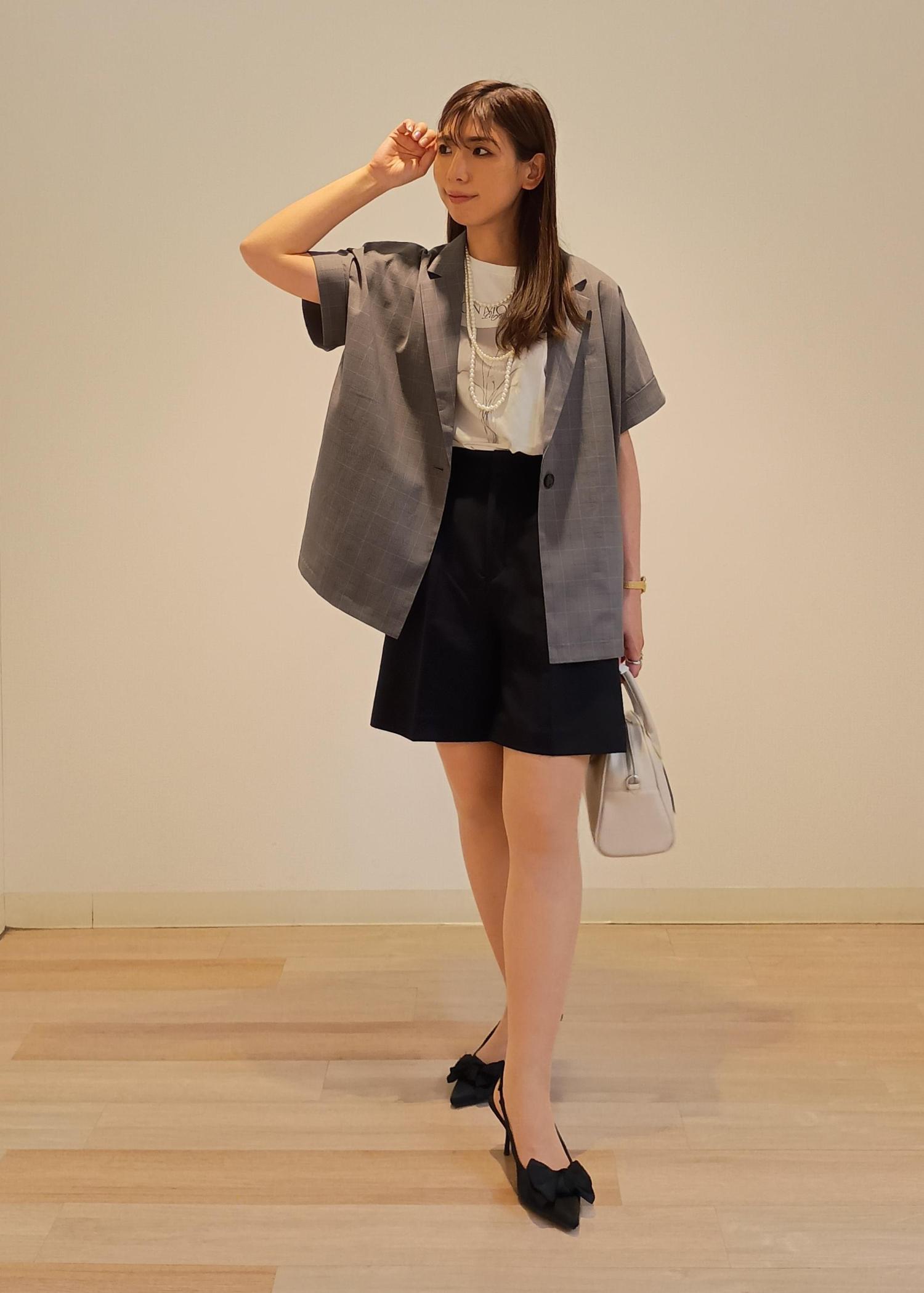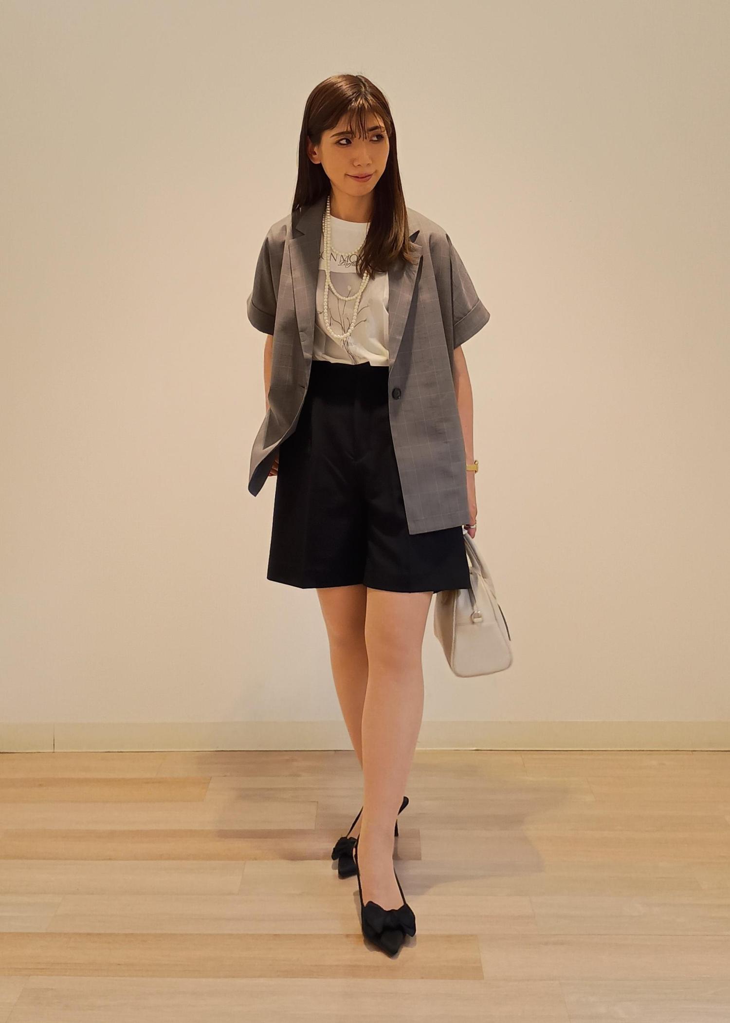 シンプルなプリントTシャツに、シンプルなハーフパンツを合わせ、一見カジュアルな装いになりそうな組み合わせでも、フレンチスリーブのジャケットをプラスすれば一気にこなれ感のある大人っぽさのあるキレイめカジュアルコーデが簡単に作れます!色味を抑えつつも、パールやお花、リボンなどフェミニンな要素をプラスしてマニッシュになり過ぎない合わせ方がポイントです!
