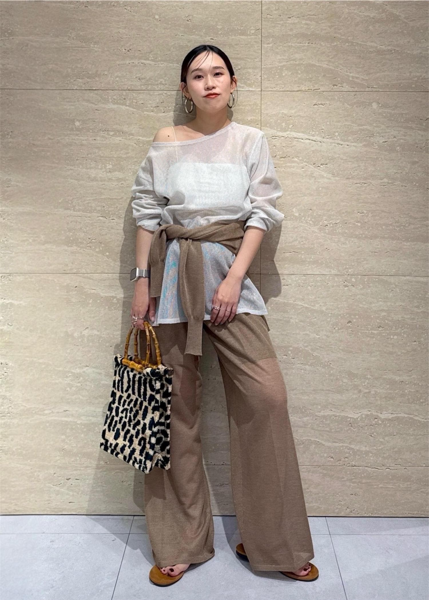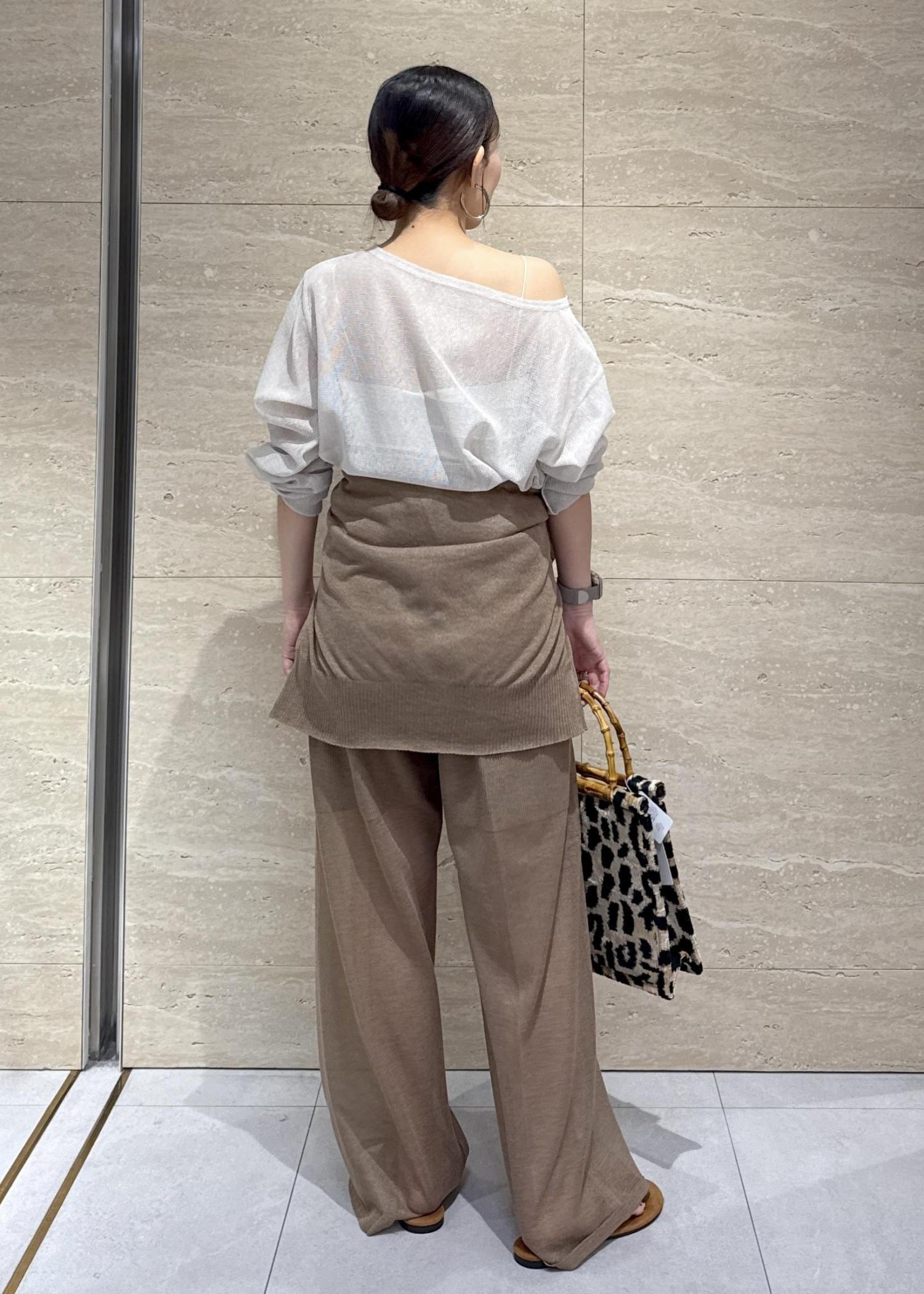 パンツと同素材のカーディガンを腰巻きし、カラーを統一させた、リラックスながらも大人っぽいコーディネート。