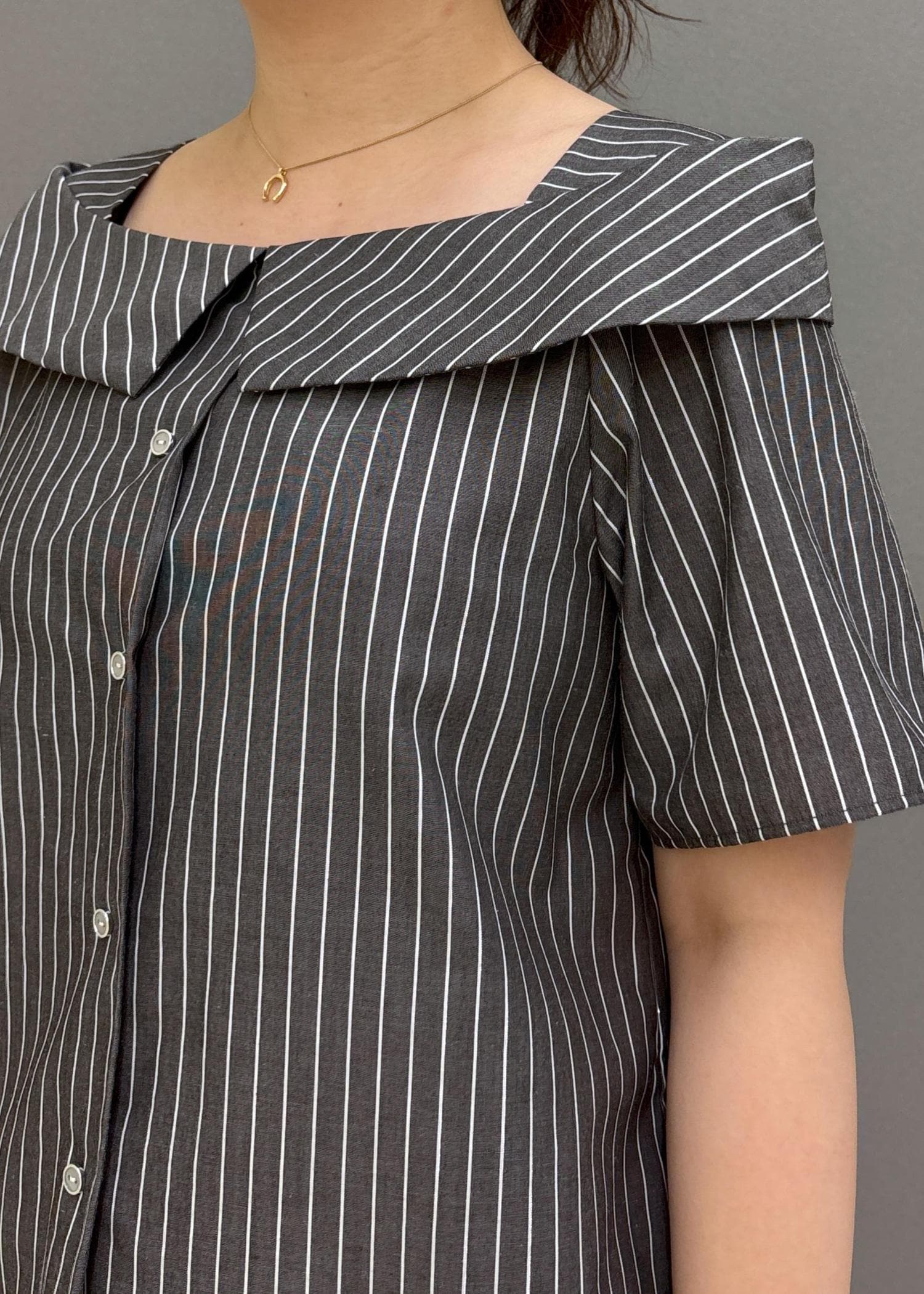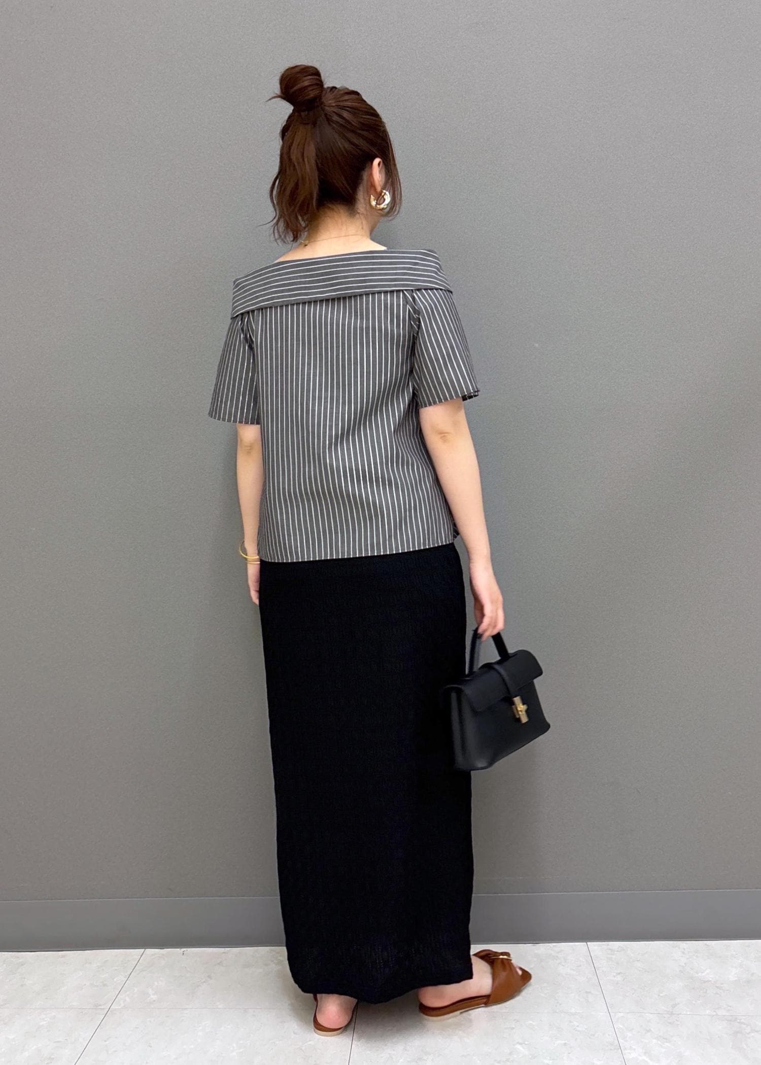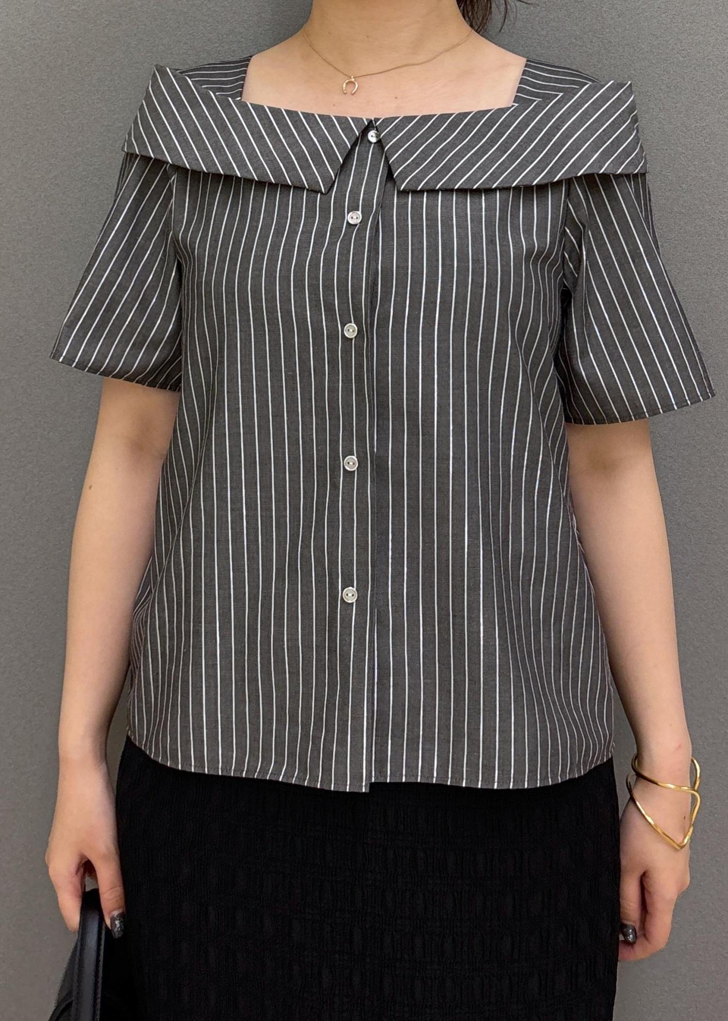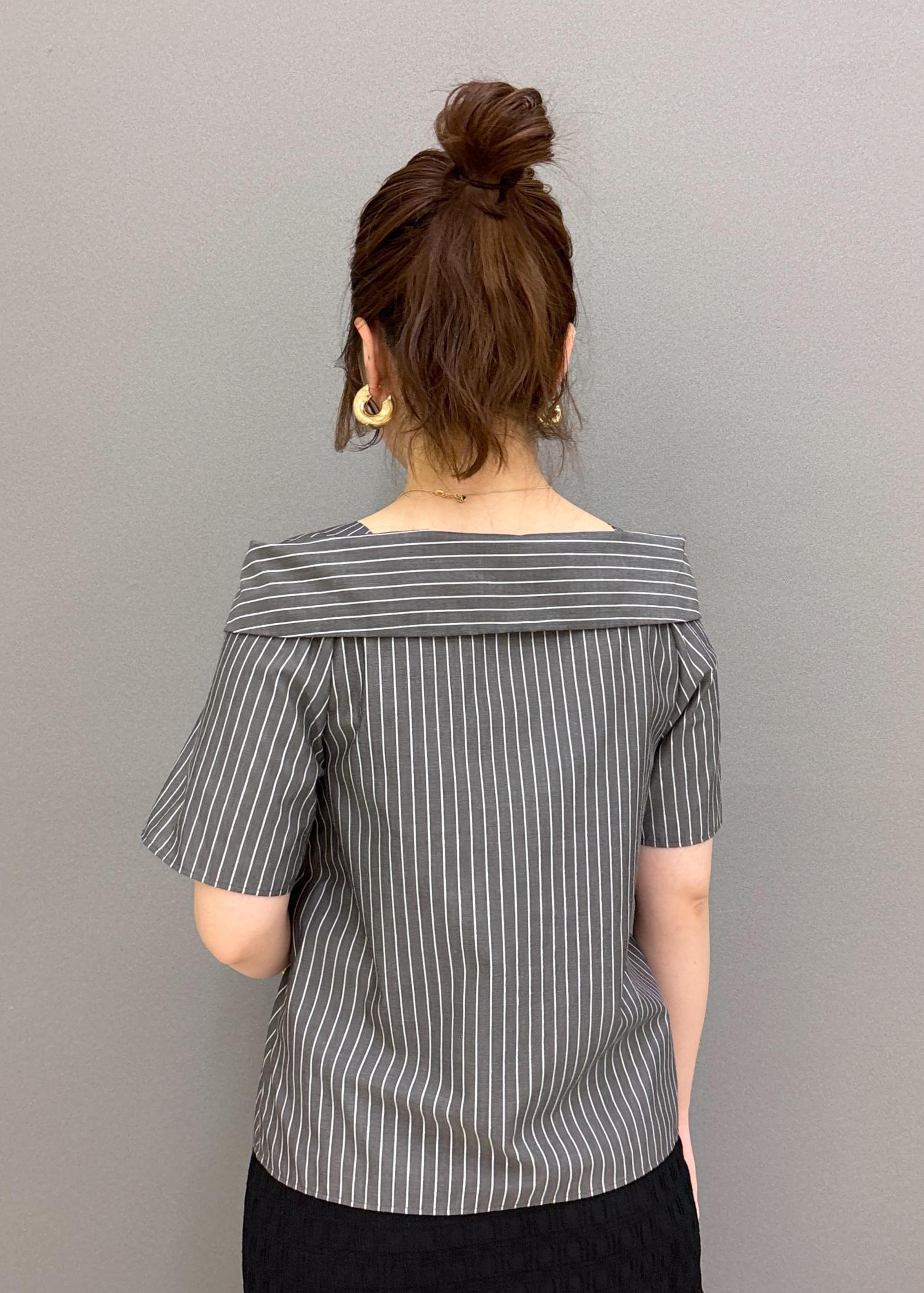 VIS【新色追加】【防シワ】ラメミックスオフショルダー風ストライプシャツダークブラウン系 / F¥5,489レビューインナーのストラップが見えにくいオフショル風シャツ♩細かいラメが入っているので上品な印象に!160㎝だと腰は隠れる着丈でアウトスタイルでもバランスがとりやすい長さです!