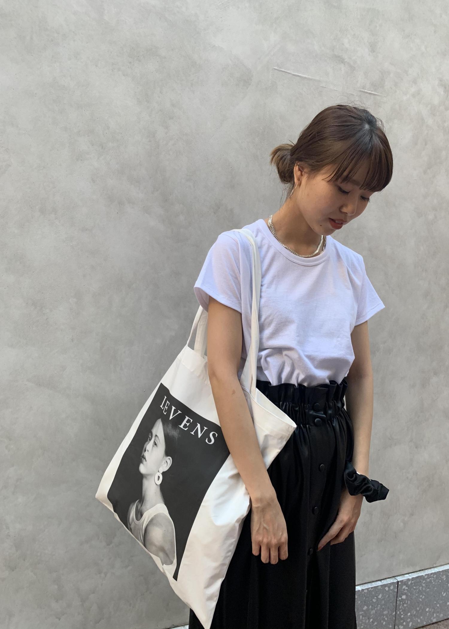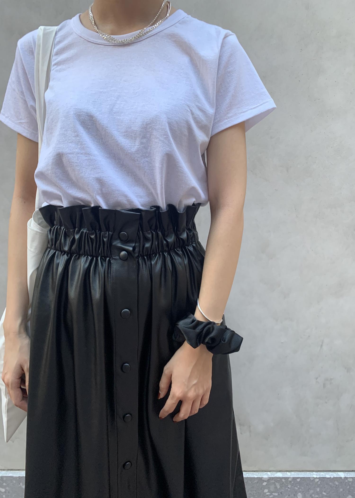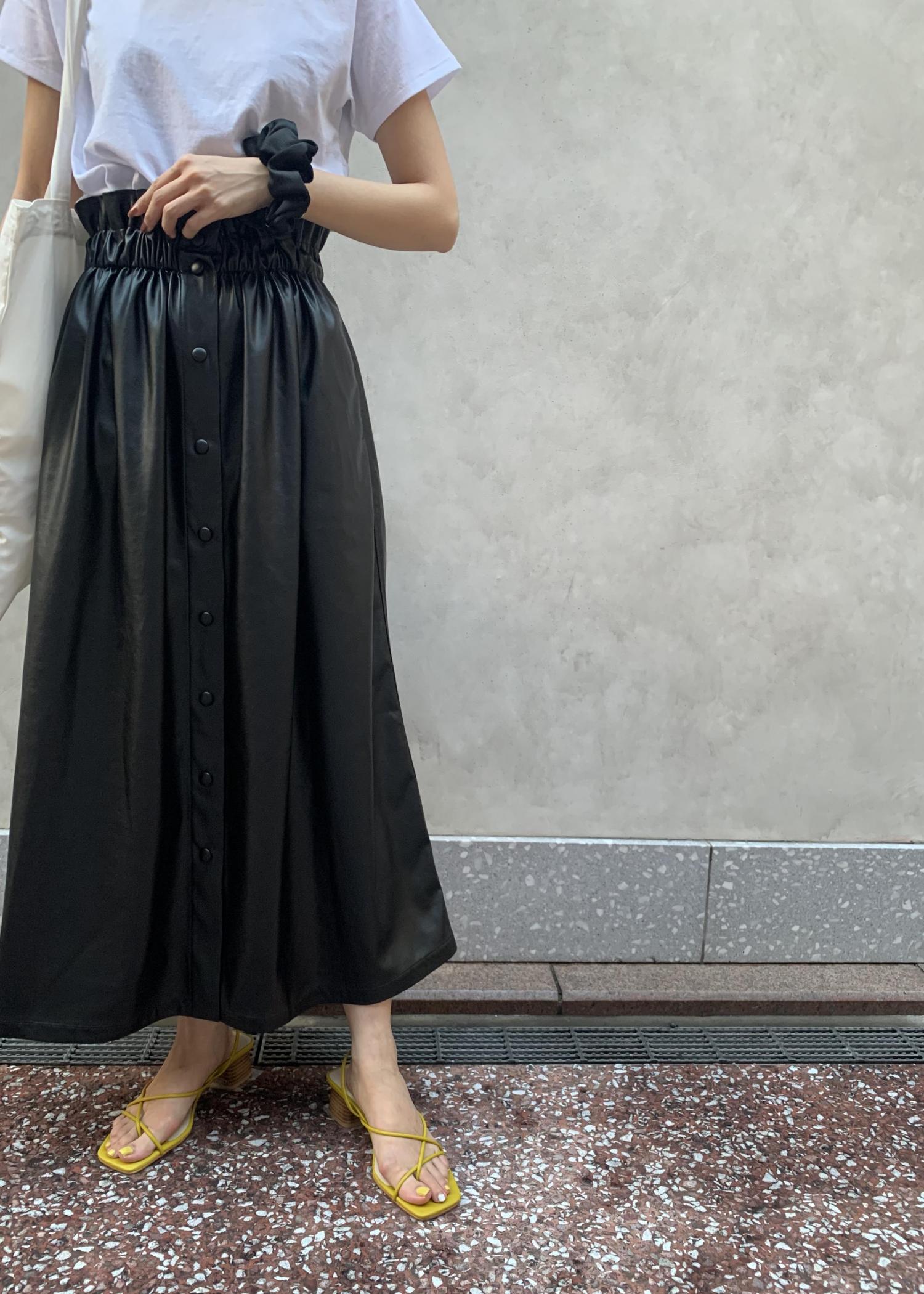 モノトーンなスタイリングでも、ウエストのフリルがポイントになり、フレアシルエットのスカートなのでハードになりすぎず履いて頂けますよ。