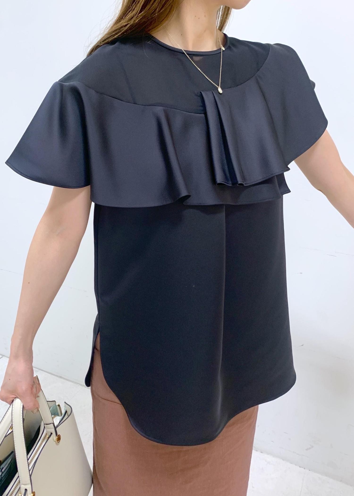 アウトレットROPÉサテンラッフルブラウス/洗えるブラック / F¥12,650レビューデコルテ部分は透け感の有る生地で、ラッフル部分と身頃は適度に張りの有るサテン素材のブラウスです。