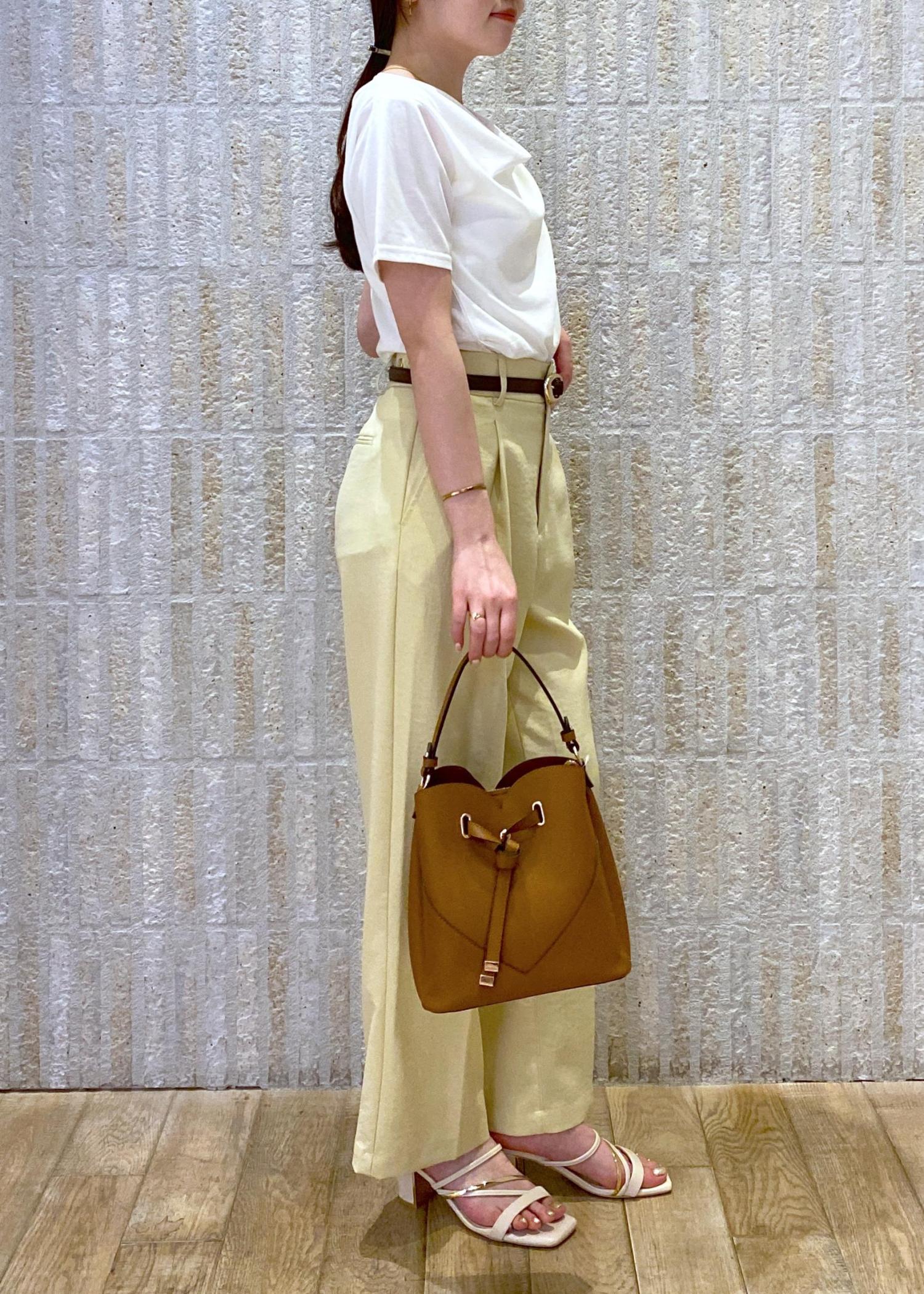 トレンドのドレープデザインのトップスに、華やかなイエローカラーのパンツを合わせて、お出かけにもぴったりな大人きれいめなスタイリングに!