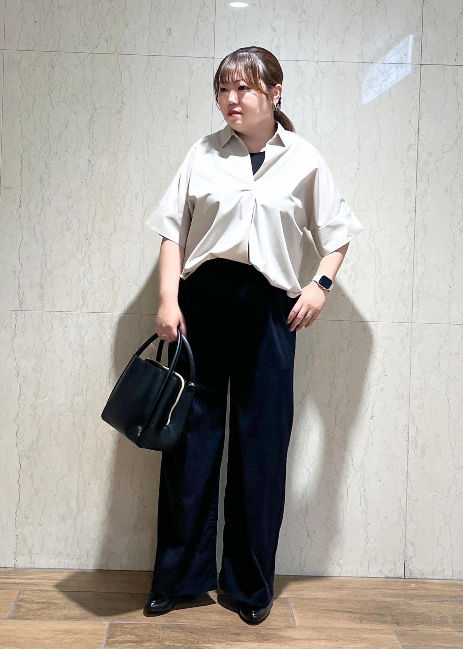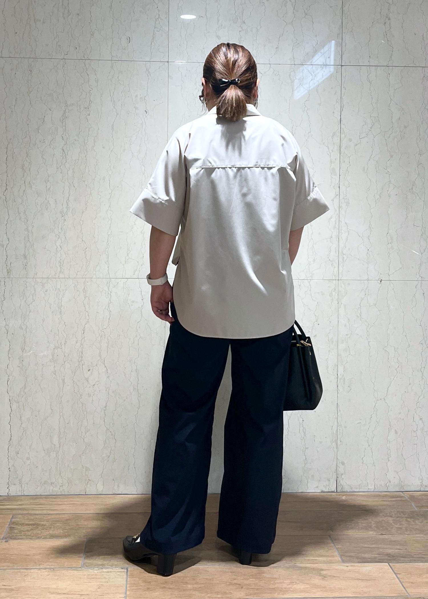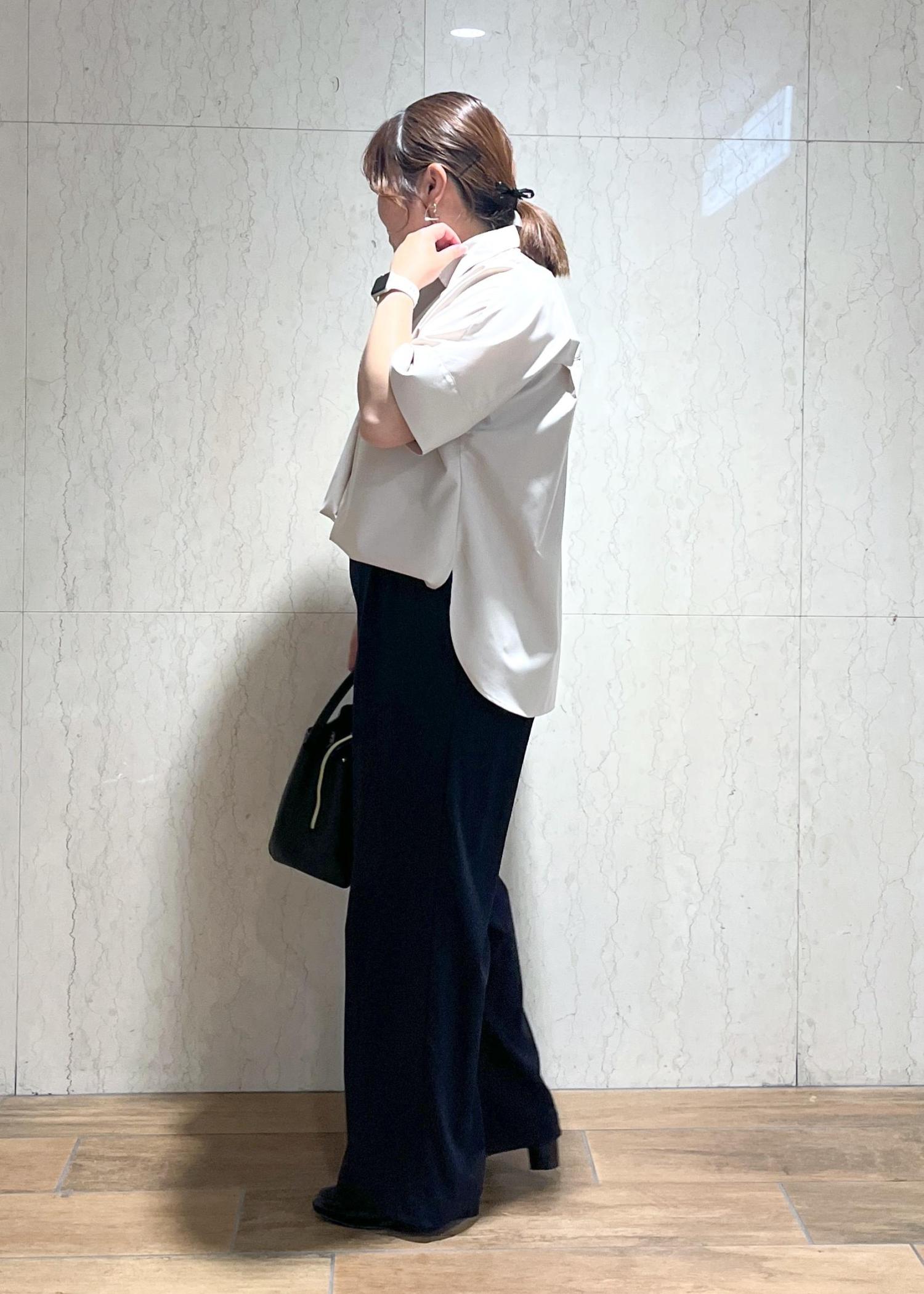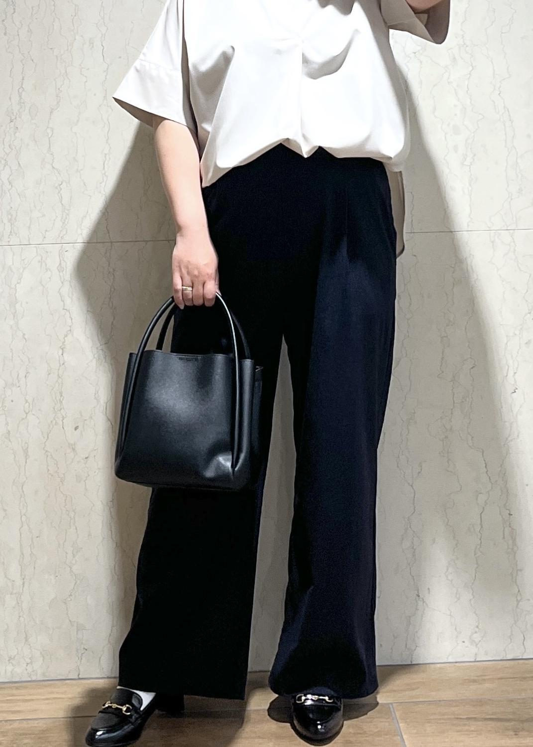 ゆったりとしたサイズ感のスキッパーシャツにワイドパンツを合わせたシンプルな通勤コーデです。