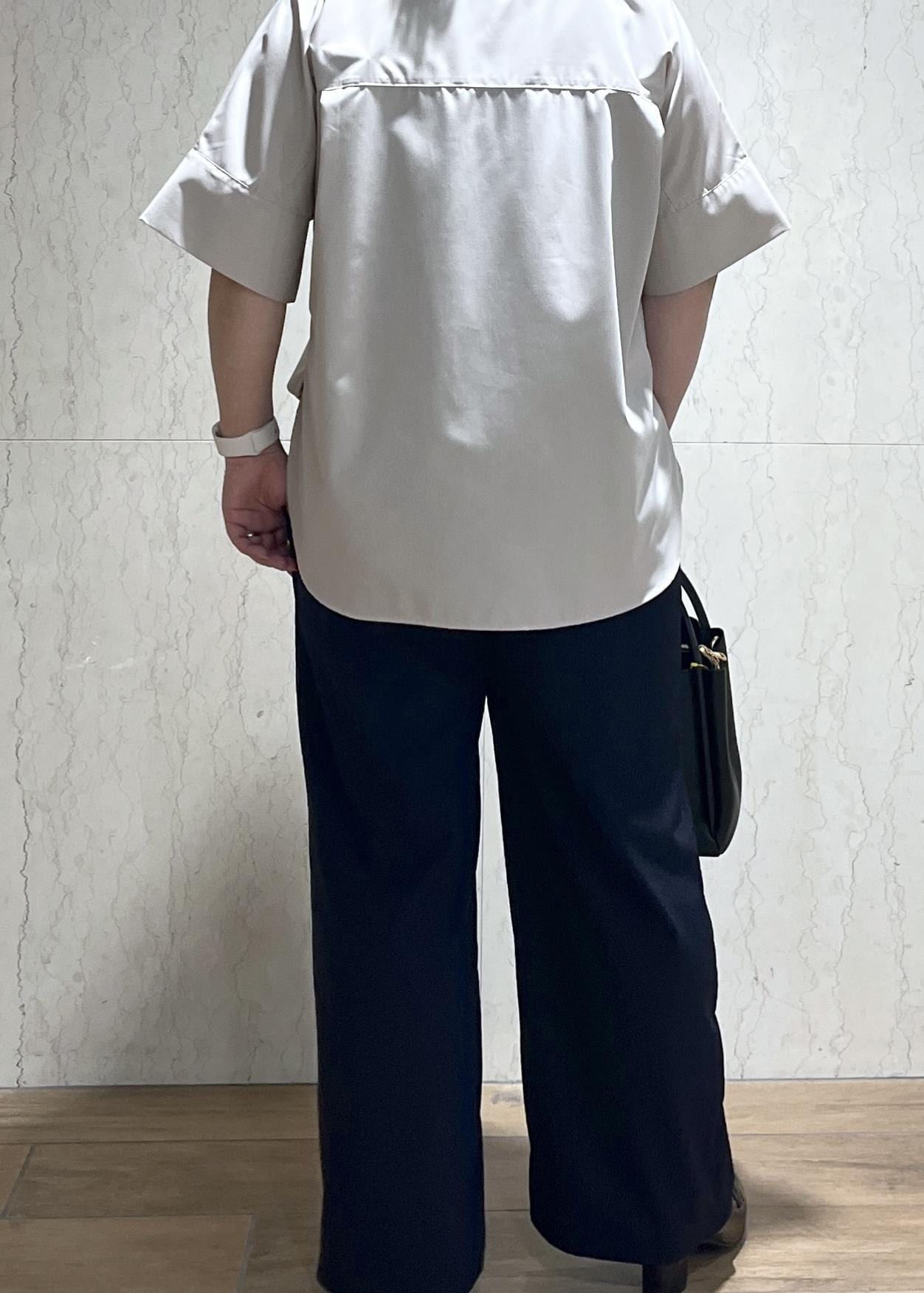 スキッパーシャツはインでもインしなくても着れるデザインで、体型カバーになりおすすめです☺︎
