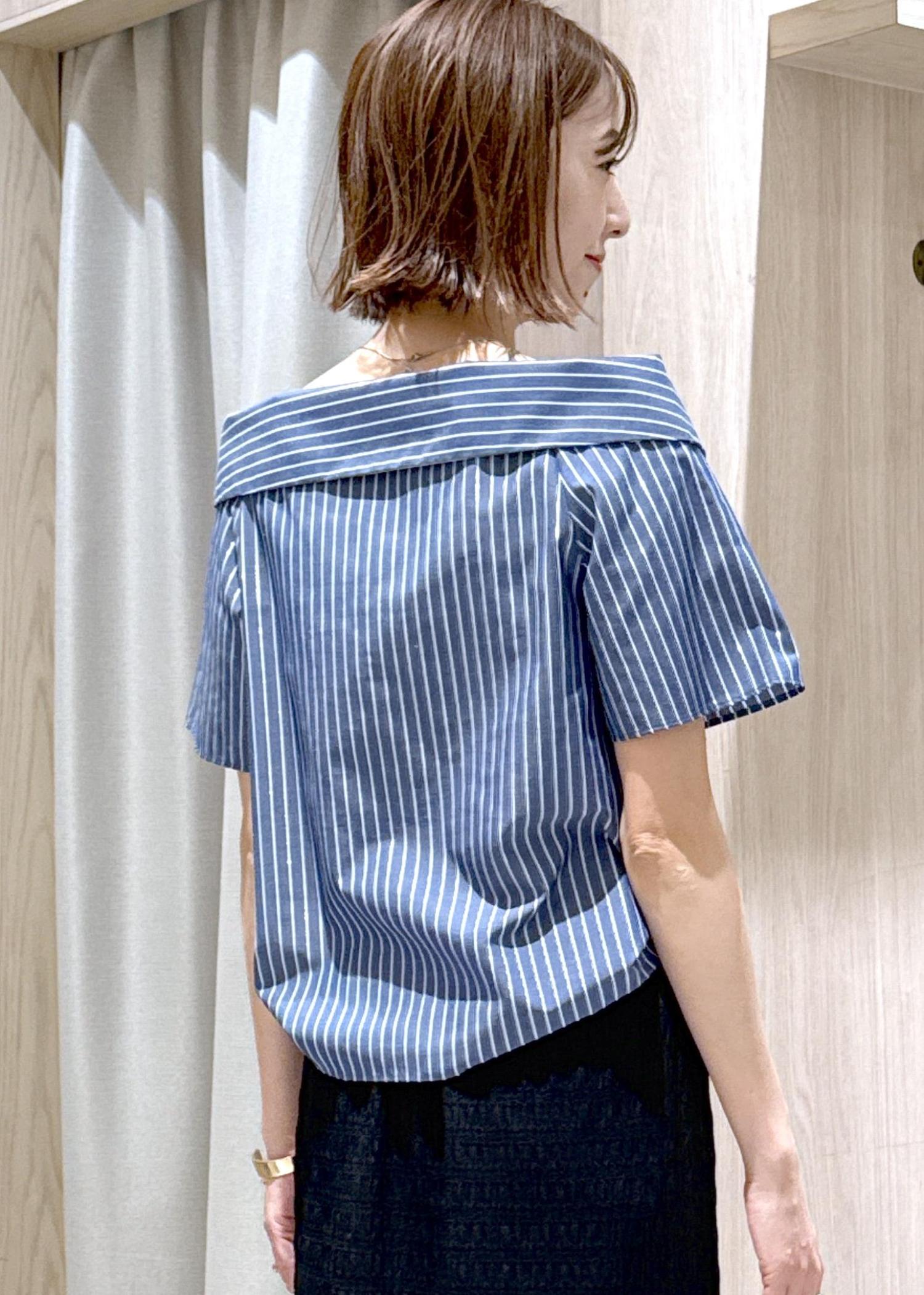 オフショルダー風のデザインで一枚でオシャレ感のあるブラウス。