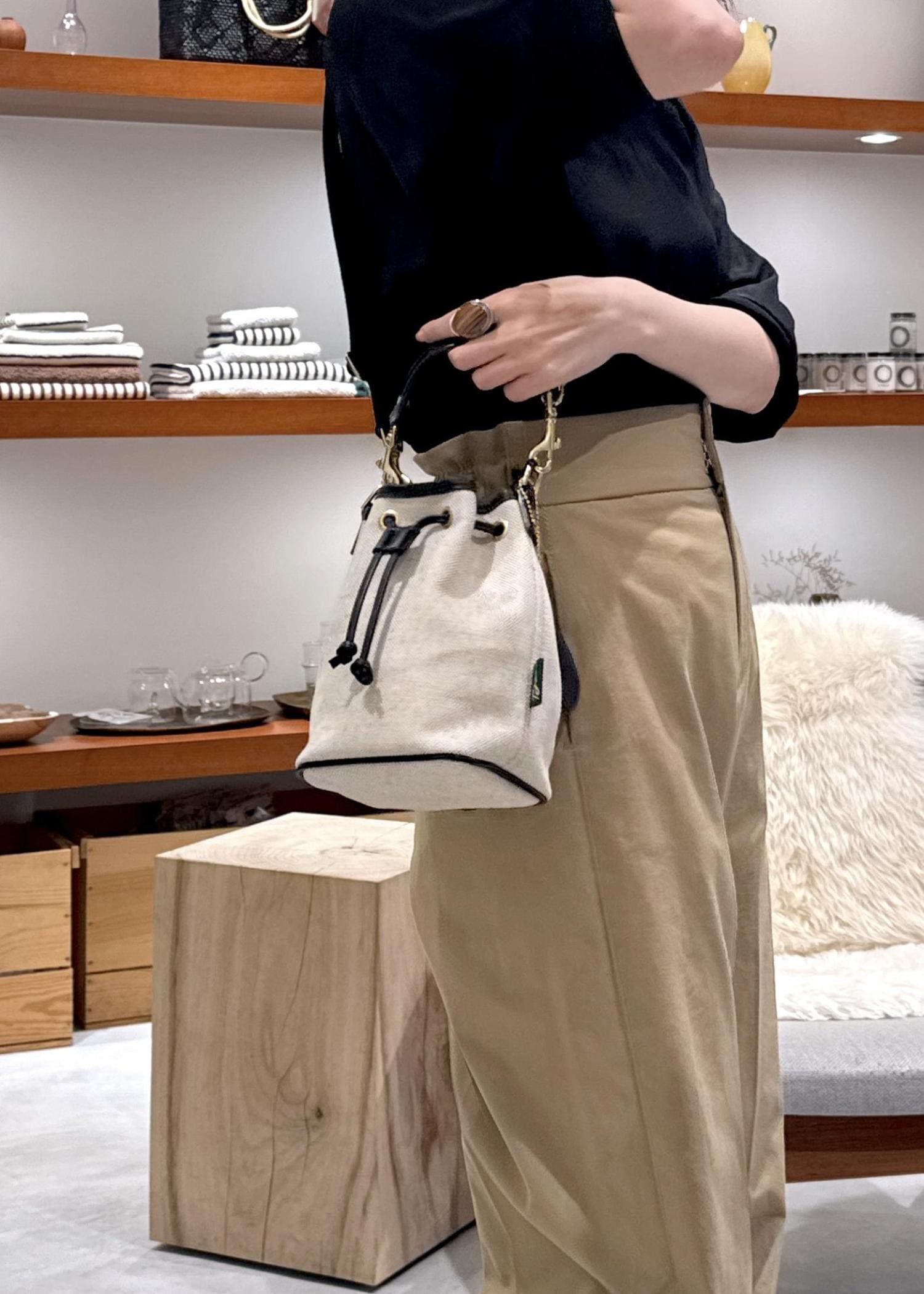 スマホ、ハンカチ、ポーチ、ミニ財布が余裕を持って入るサイズ感。