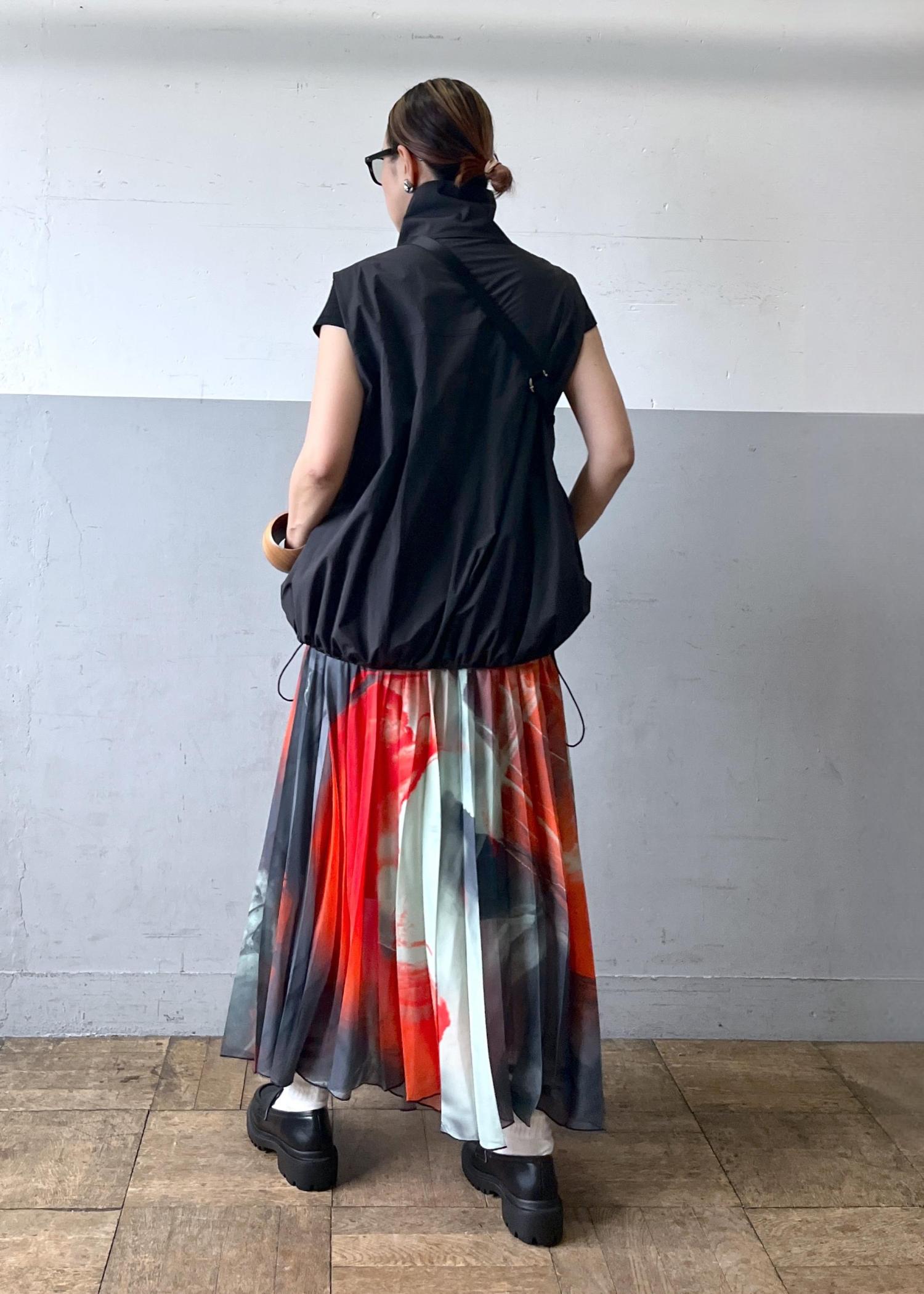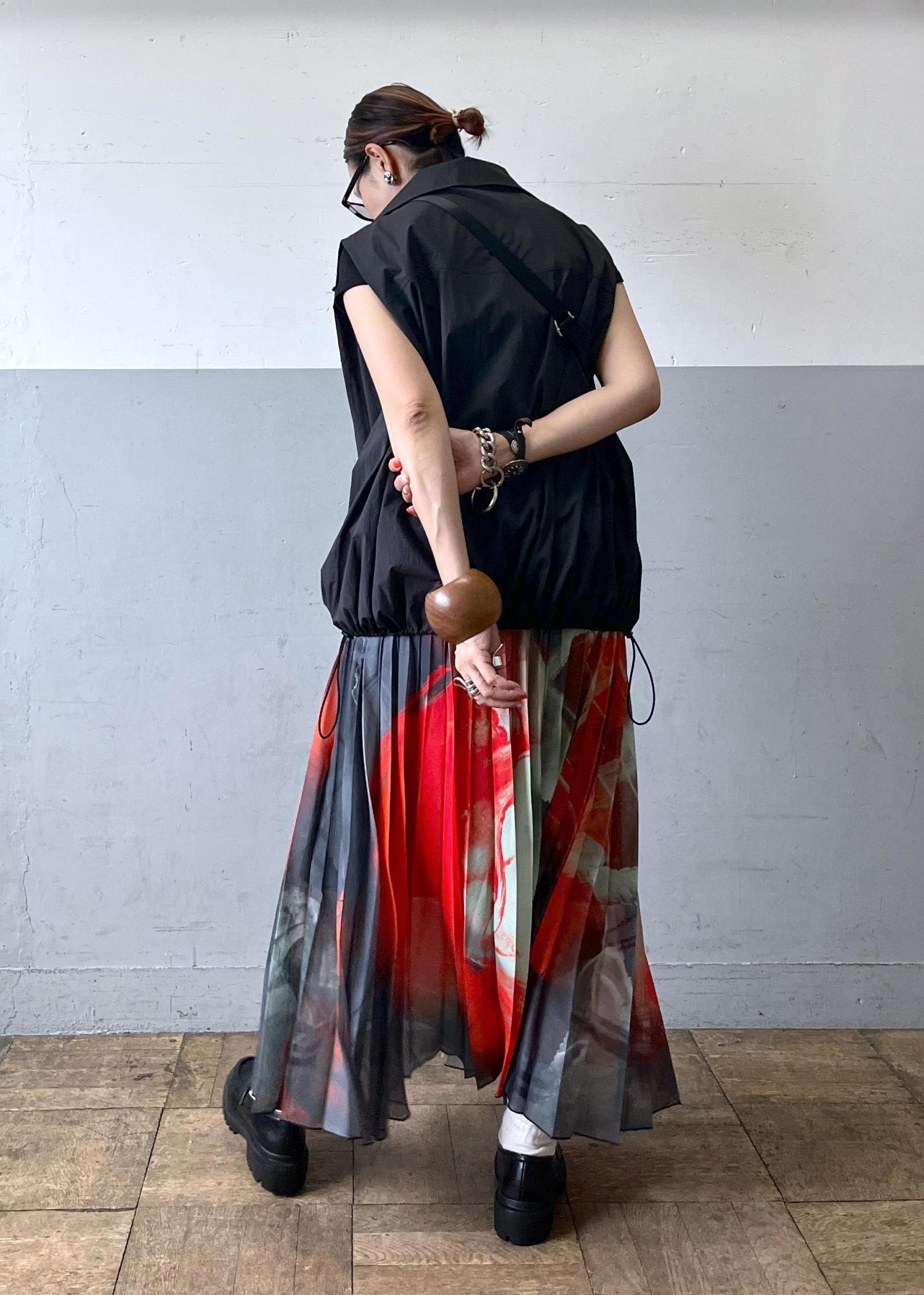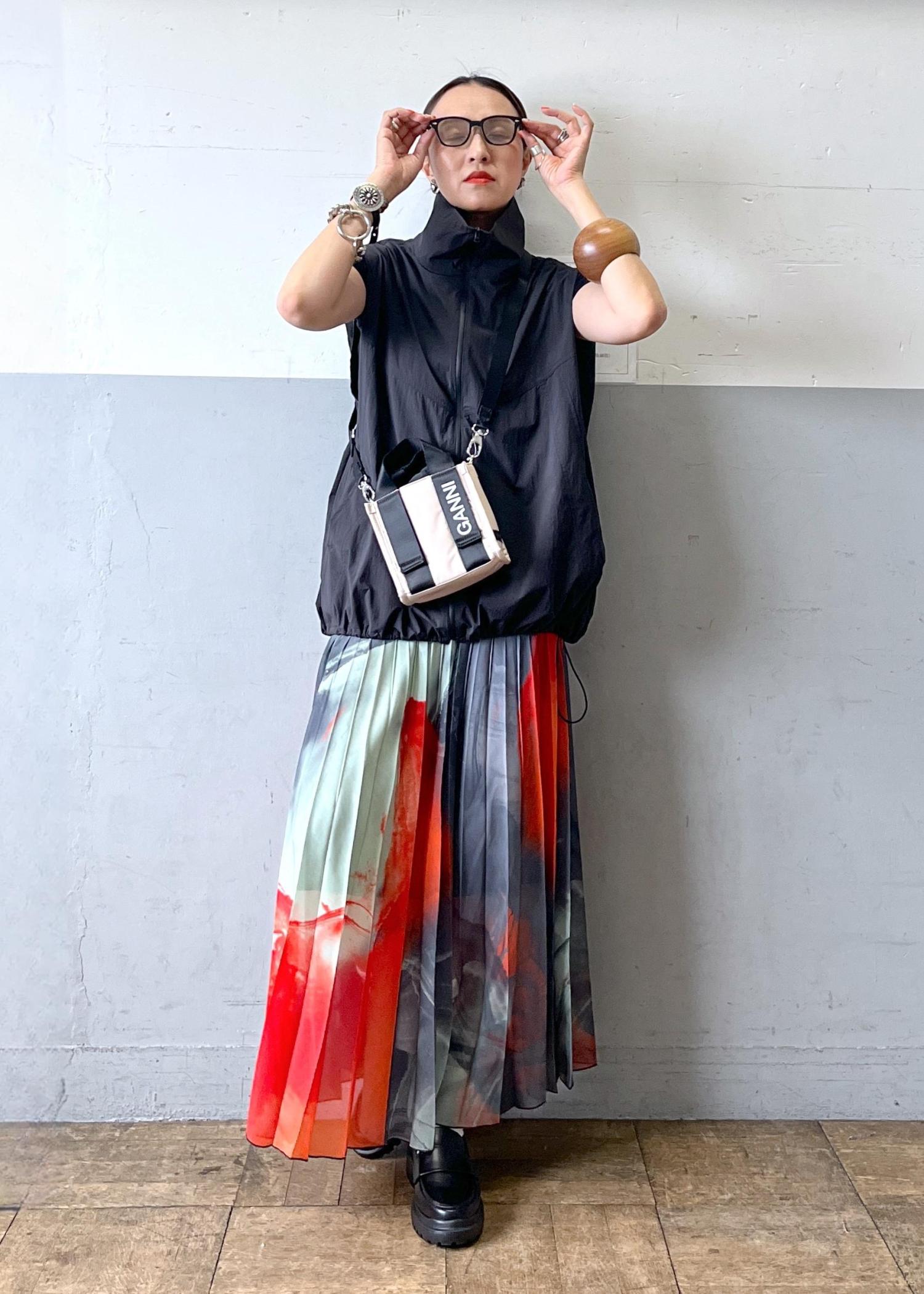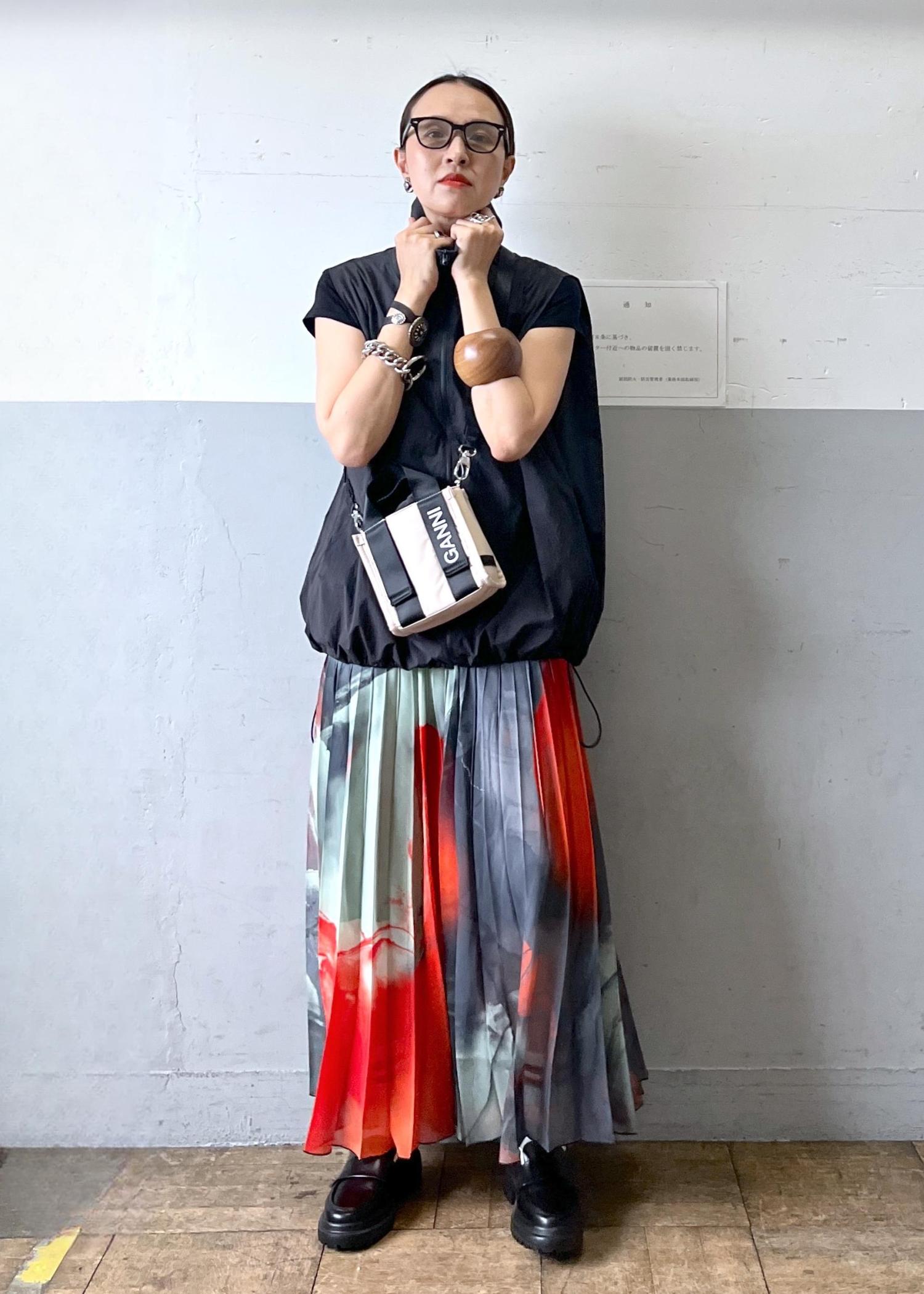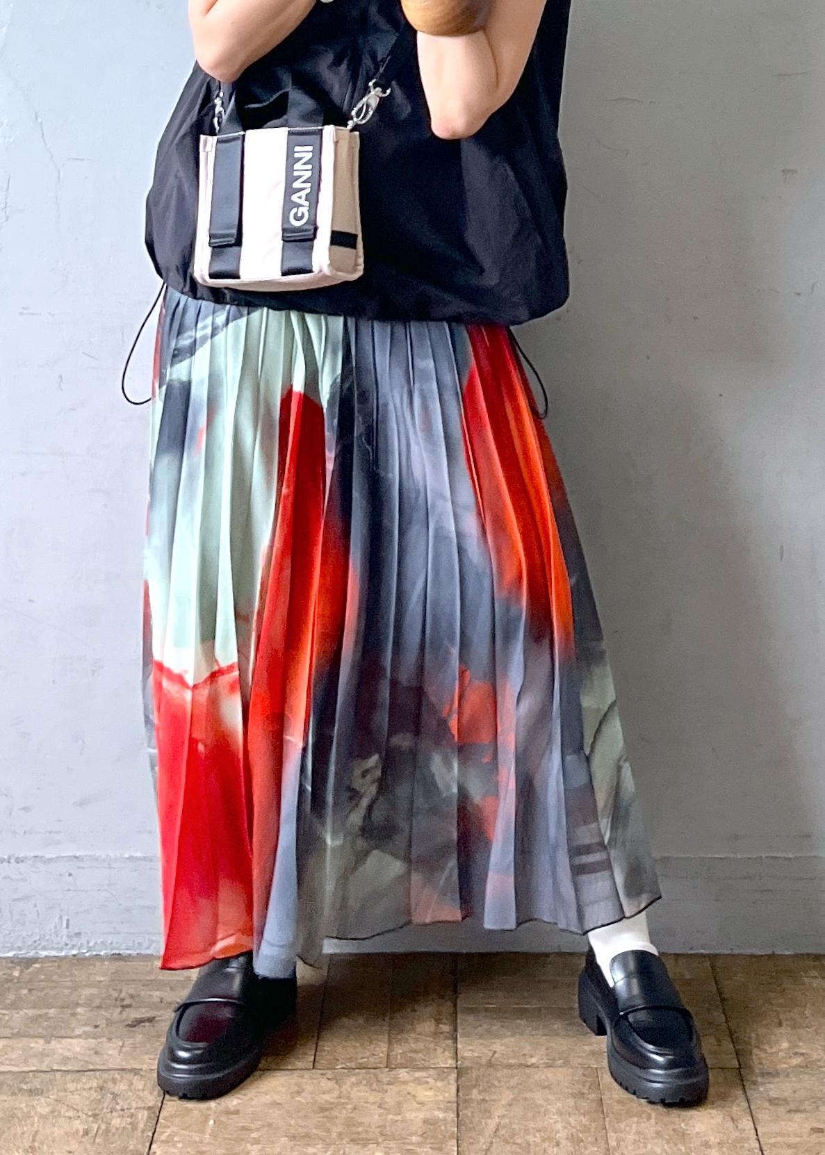 今日は大胆な柄が入ったプリーツスカートが主役のスタイリングです。少しカジュアルに着たかったのて、シンプルに白のTシャツで。でも、シンプルすぎて物足りない時は