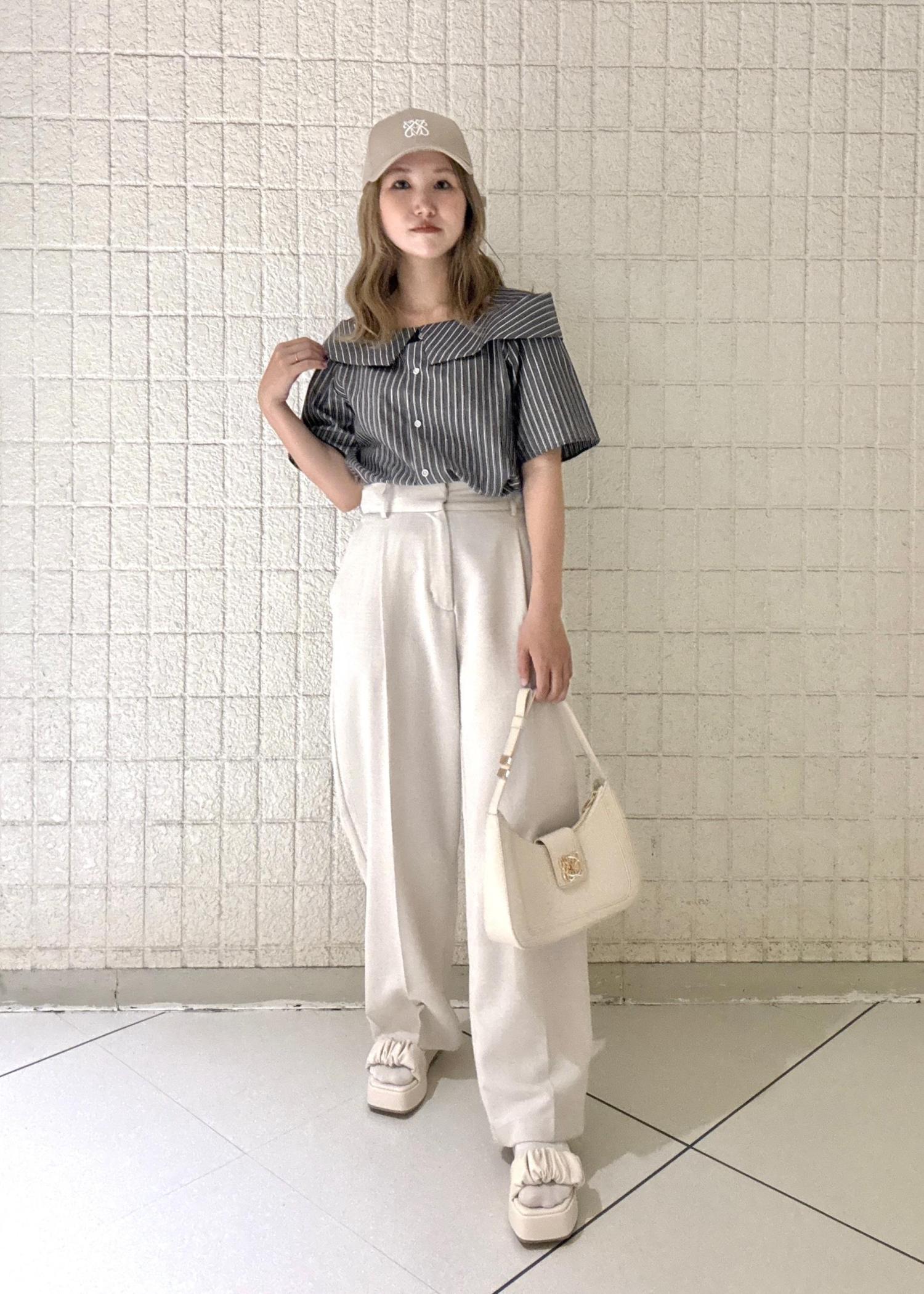 オフショル風のトップスがフェミニンな印象なので、あえてパンツスタイルで甘すぎない印象の組み合わせにしました。