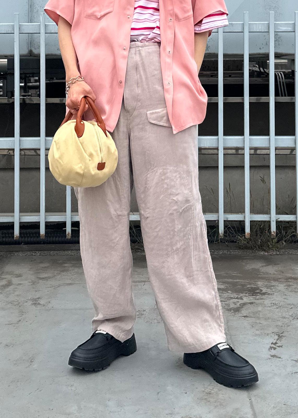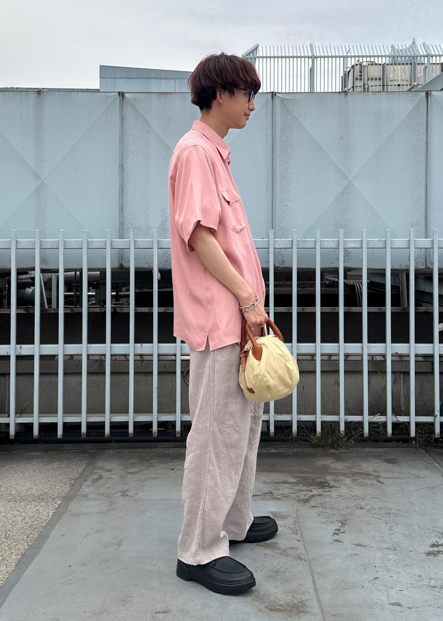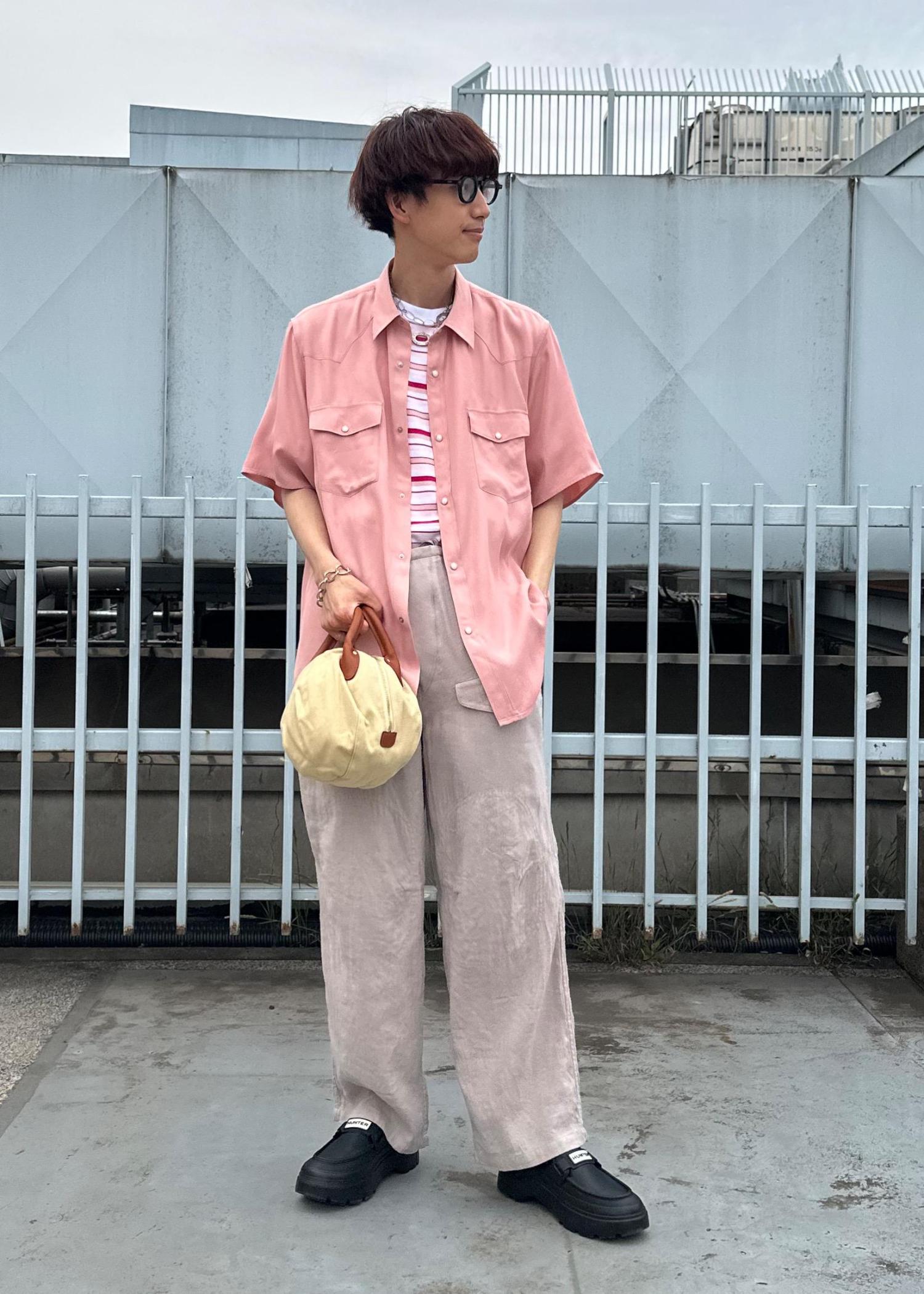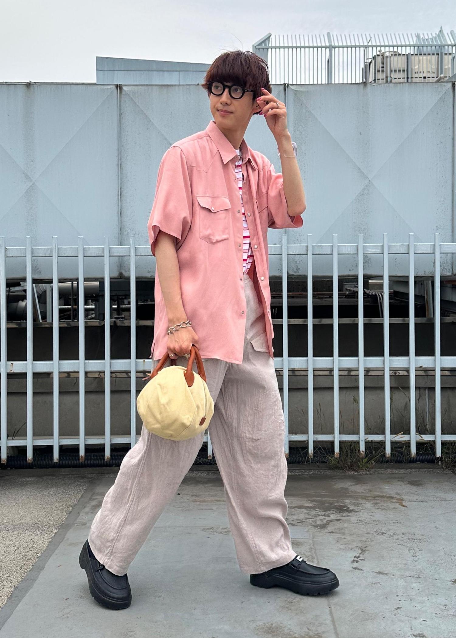 いちごミルクをイメージしたコーデです。可愛らしい色合いながらもキレイに、大人っぽくまとめました。Tシャツはピンクボーダーで統一感を出し、パンツはベージュで落ち着かせながらもコーデに馴染むようにしました。シャツが主役になるよう仕上げました。