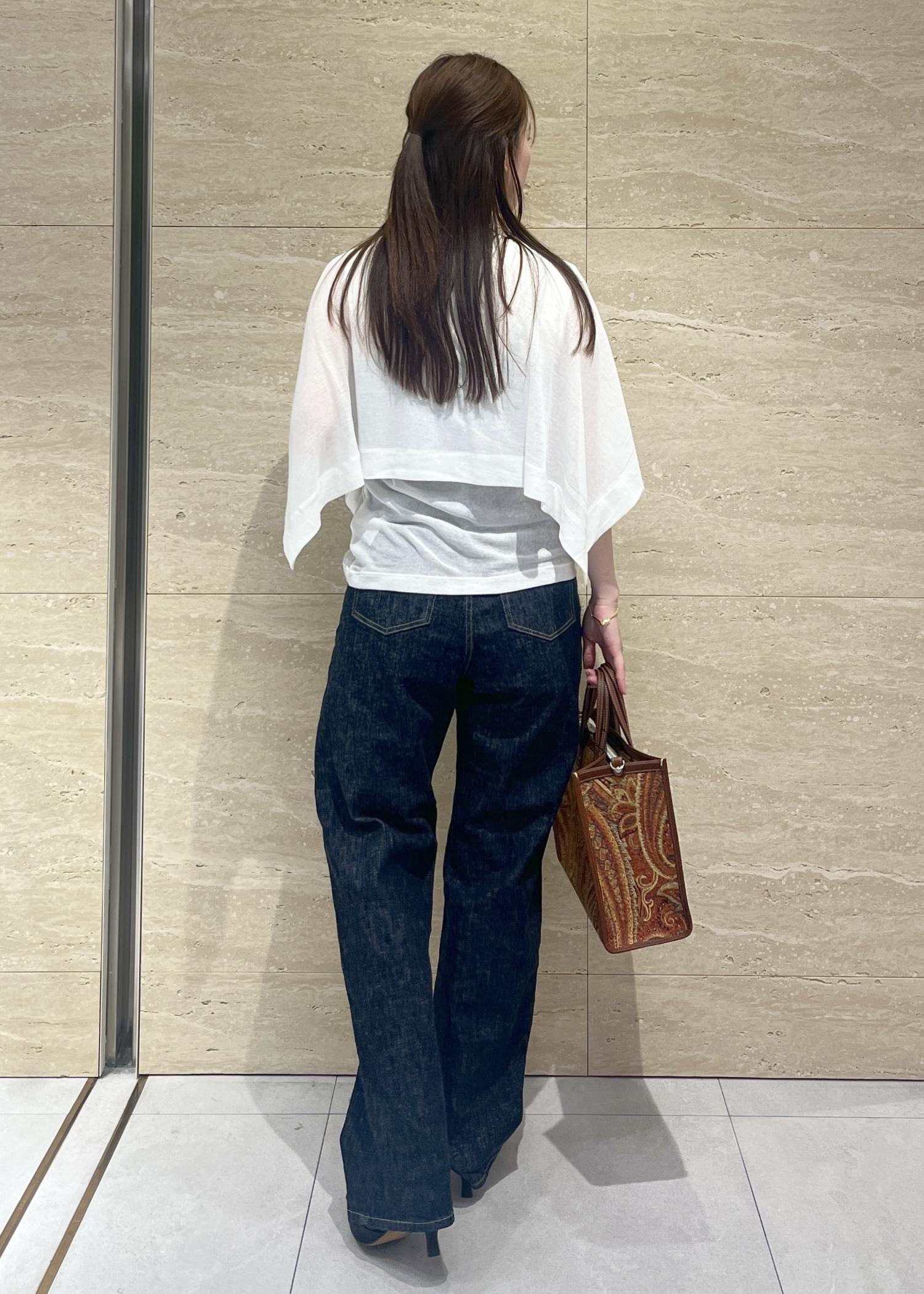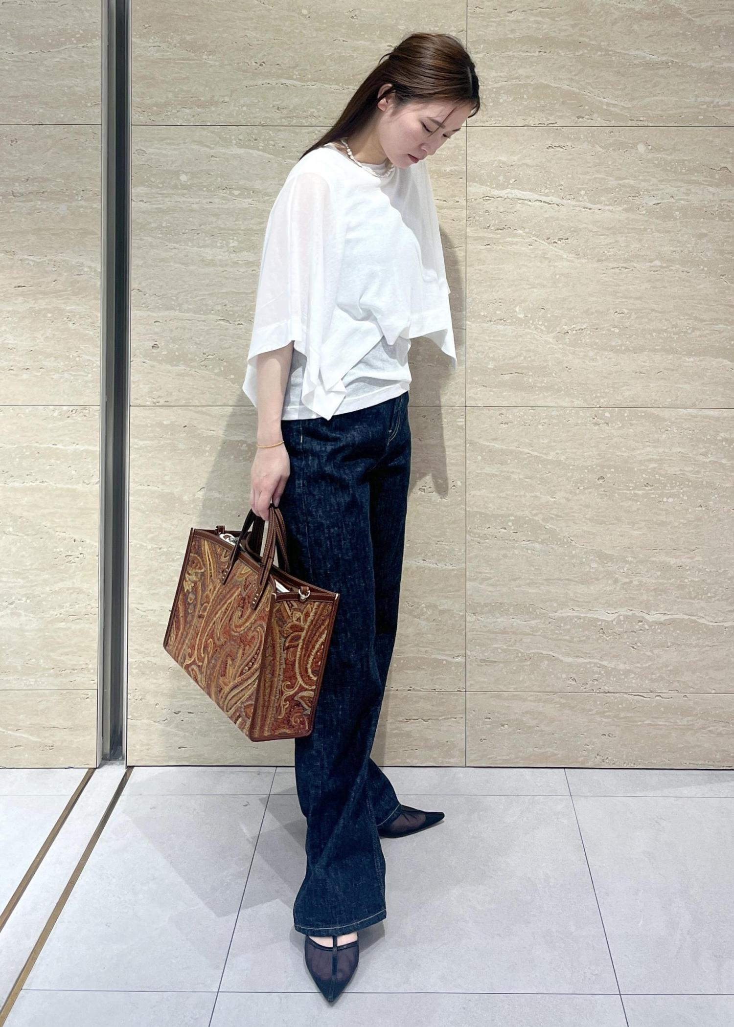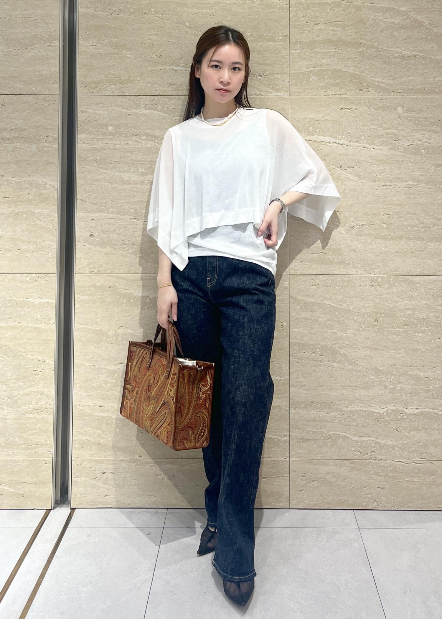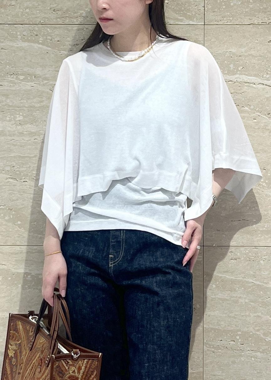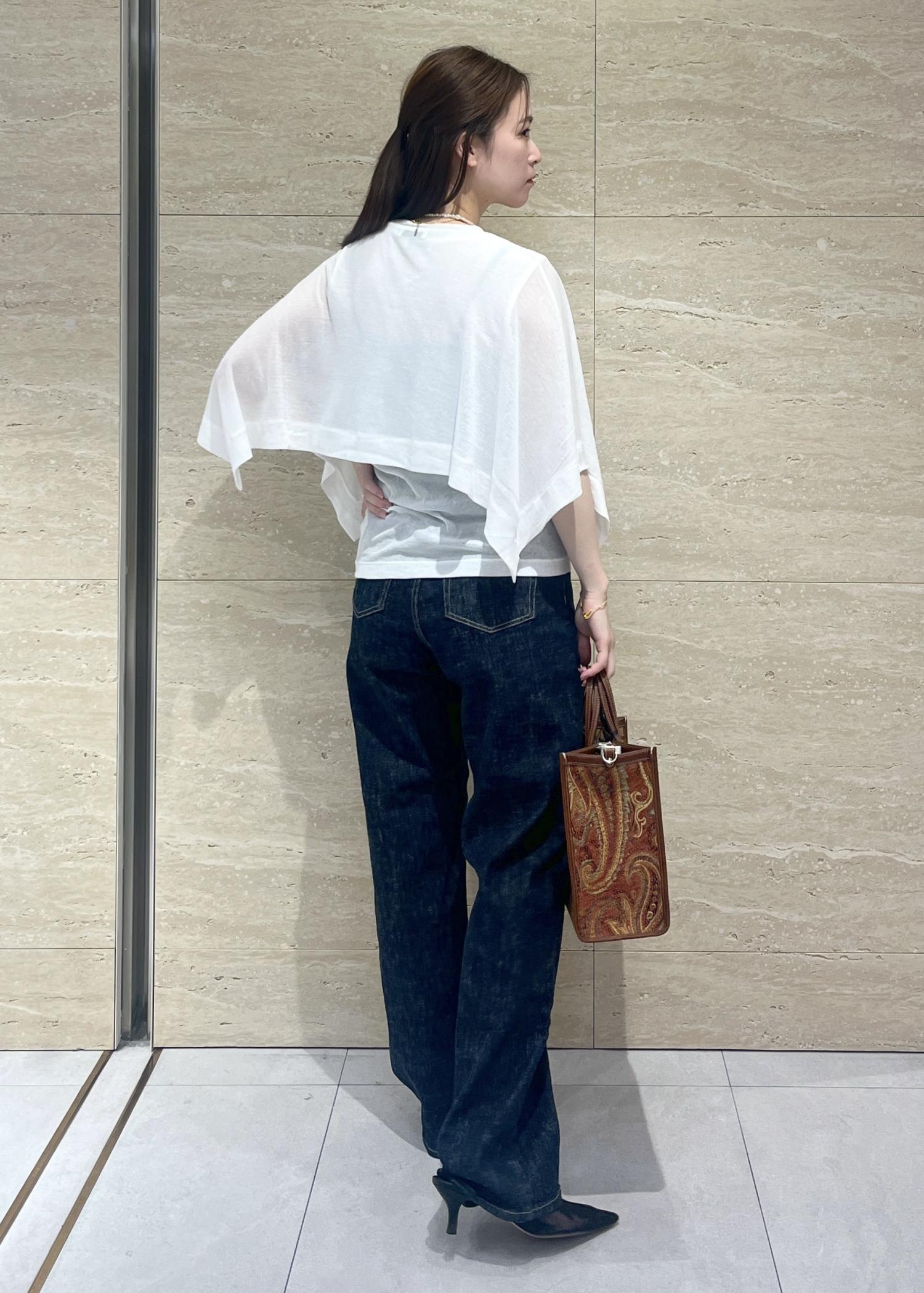 上品なイメージのケープトップスを少し崩したスタイリングです!