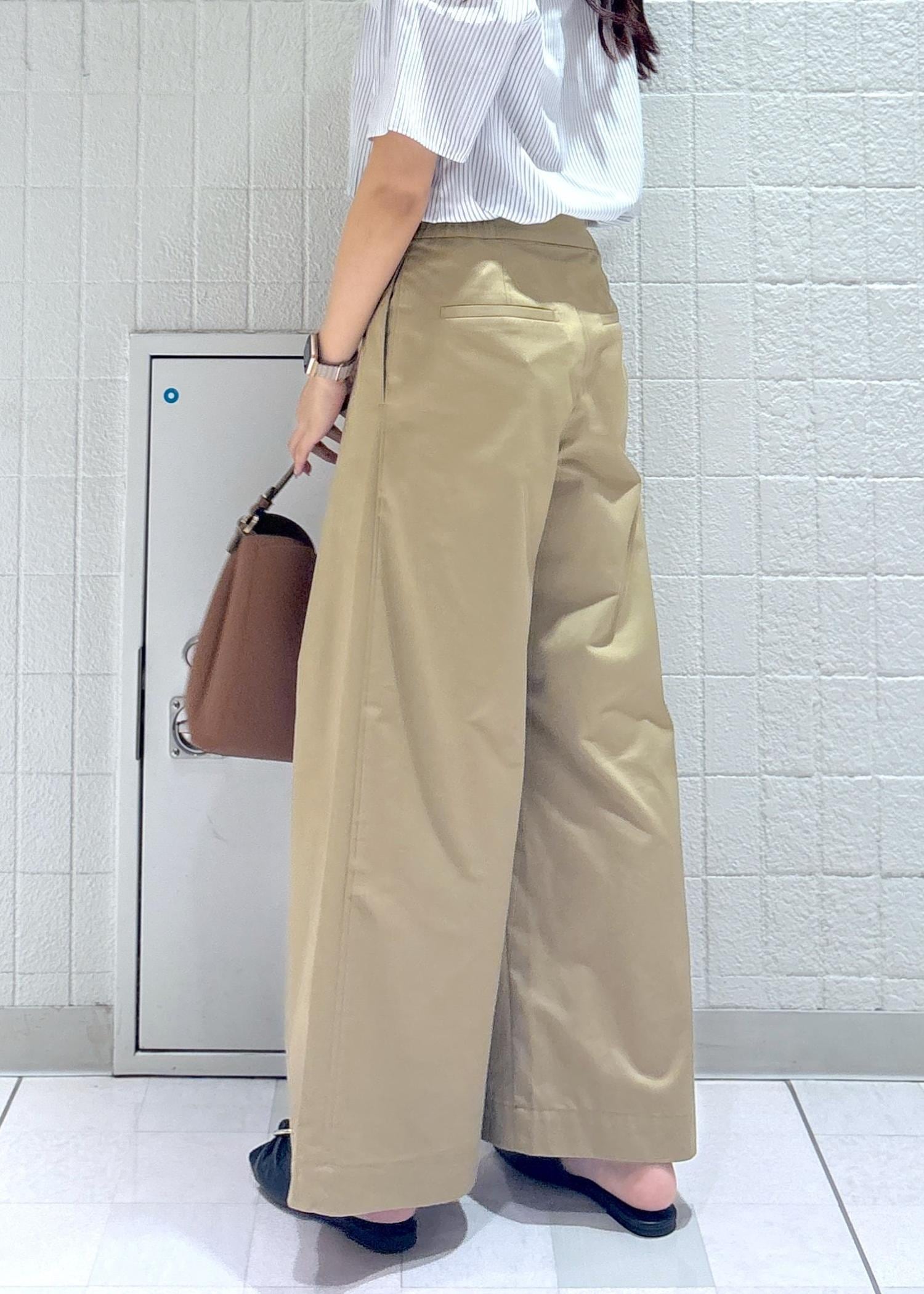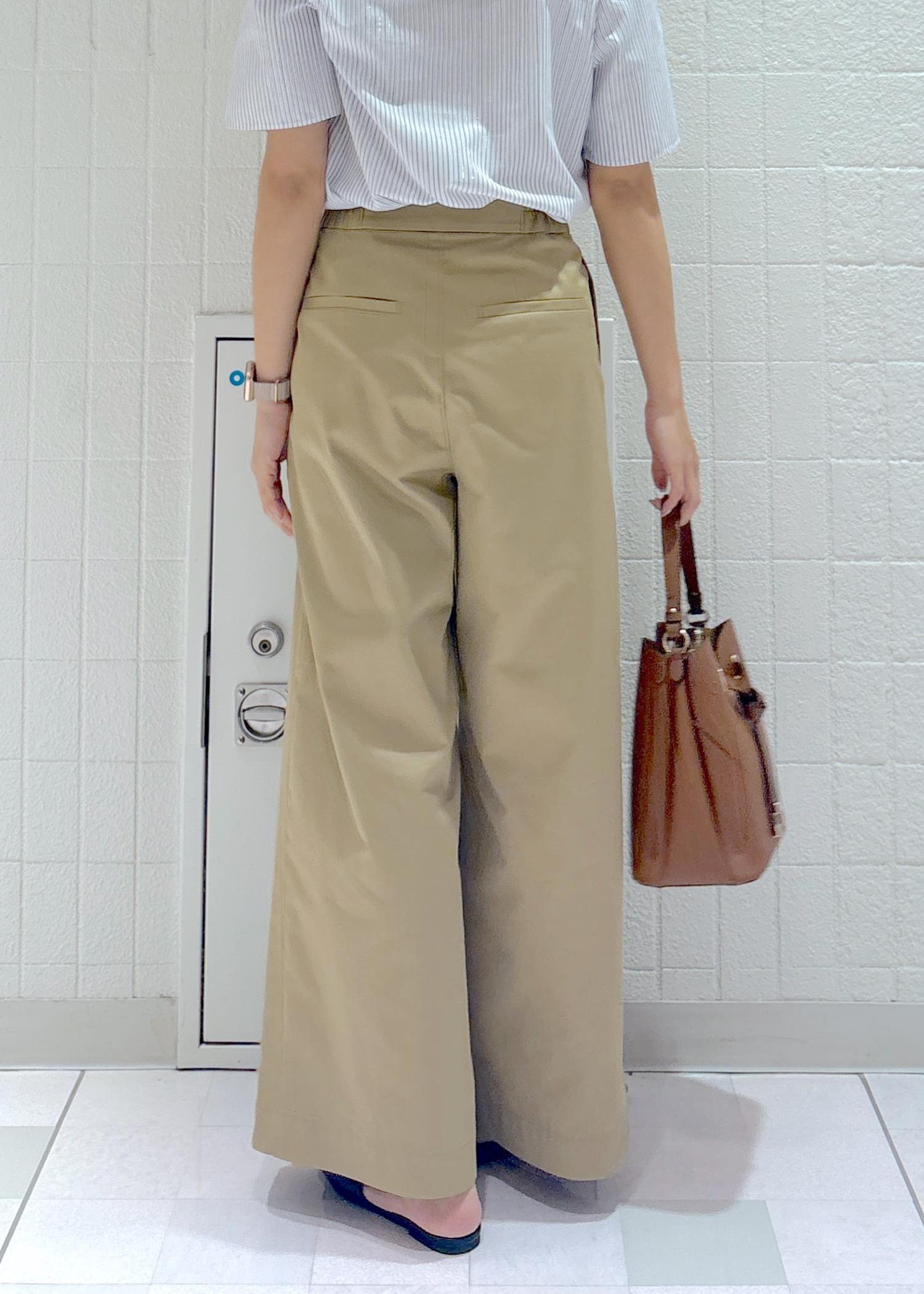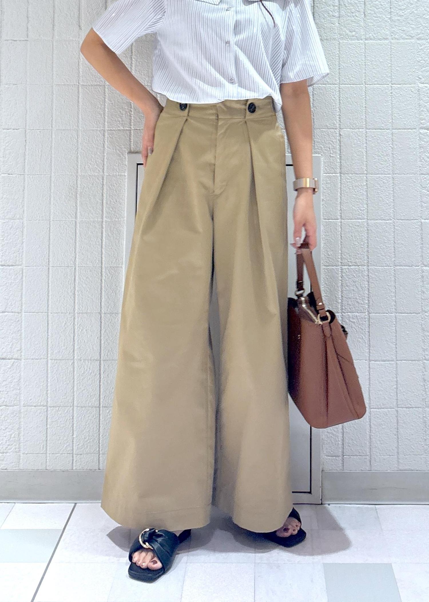 ボタンデザインとタックでウエスト細見え効果もあり、ワイドですがスッキリ見えます◎ -