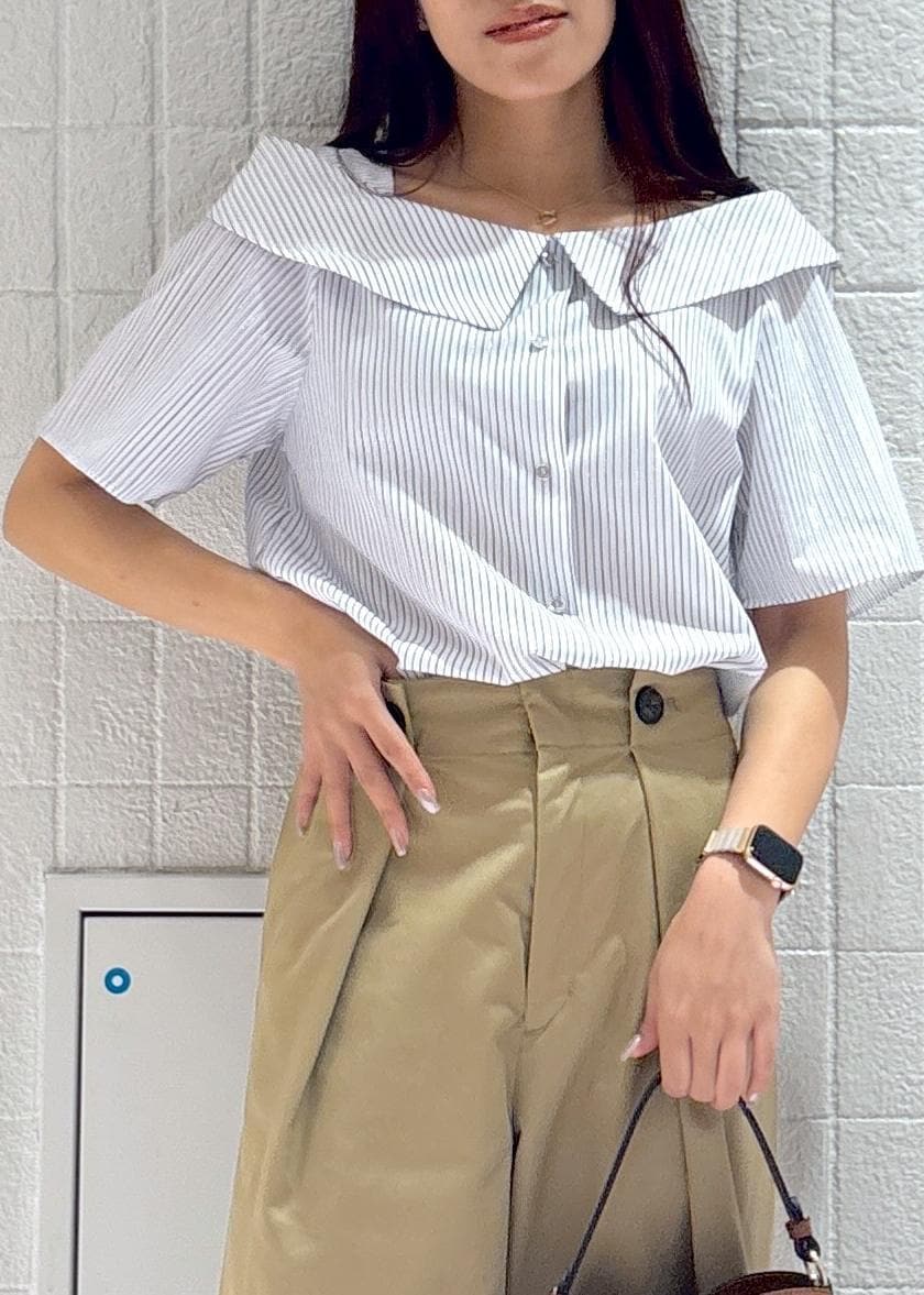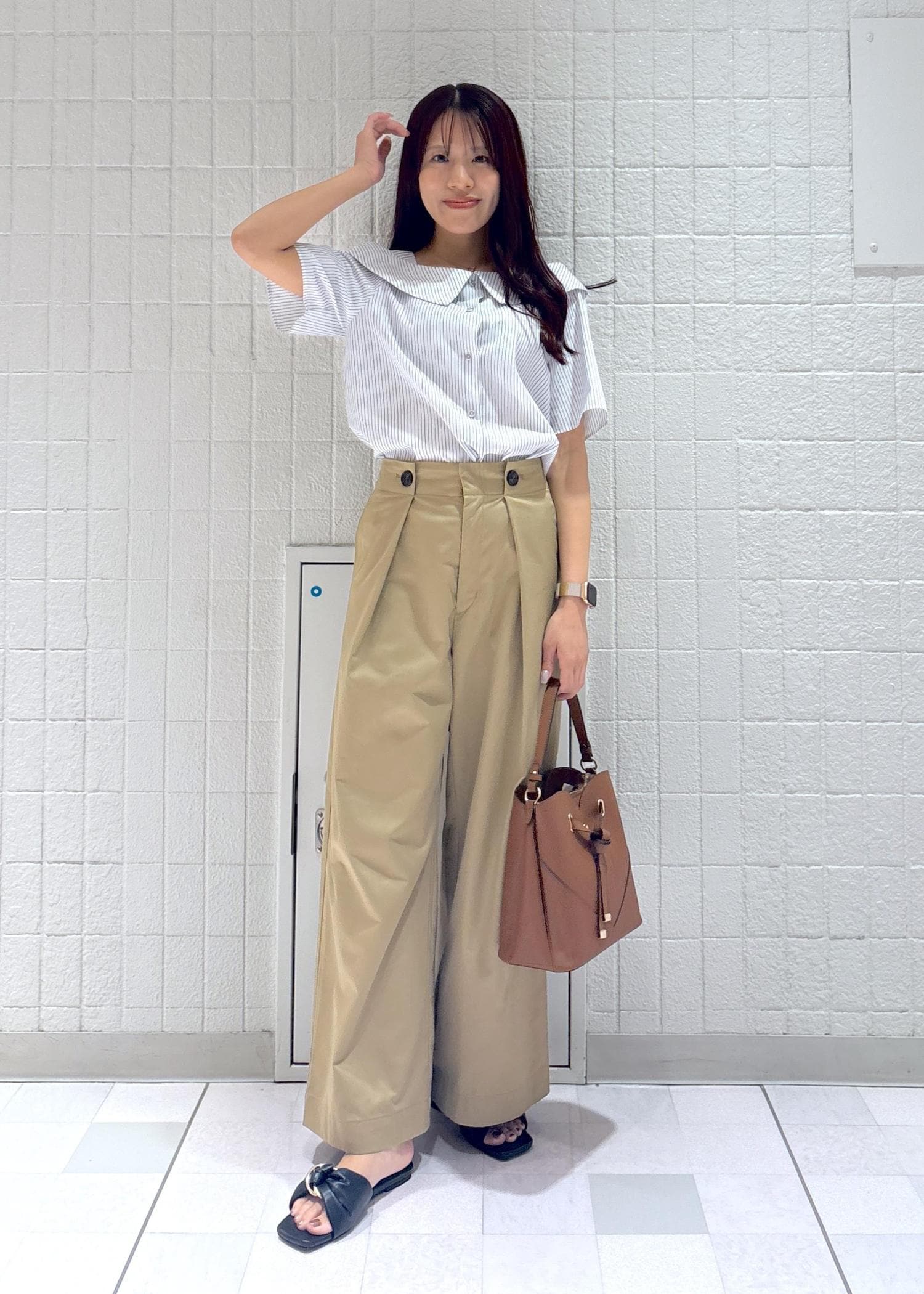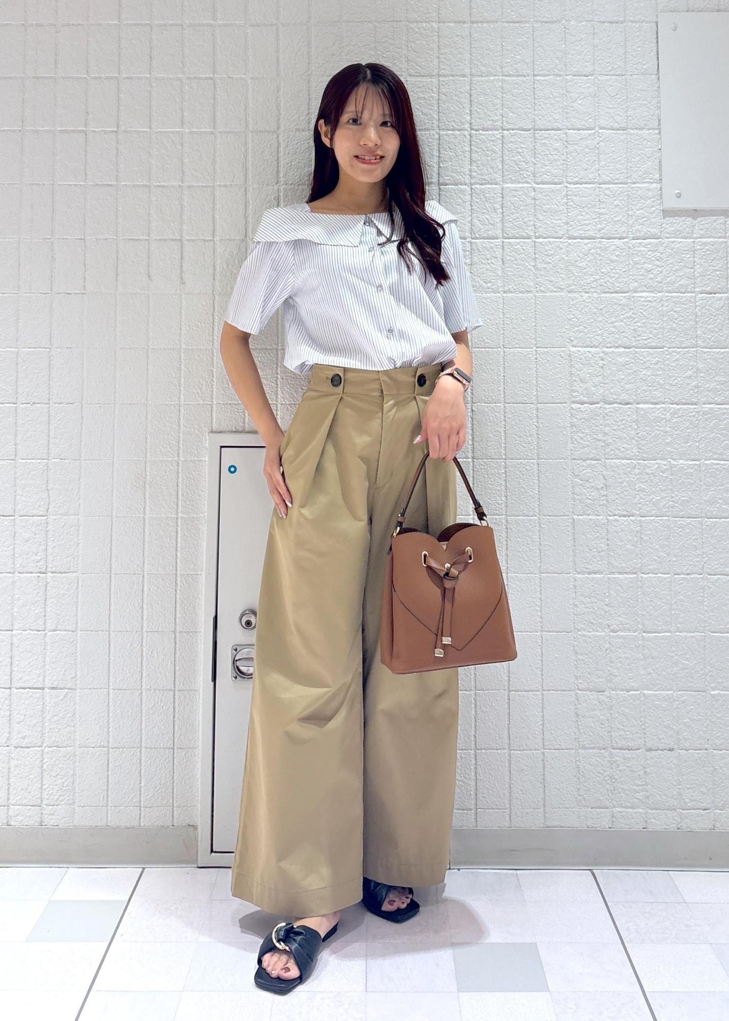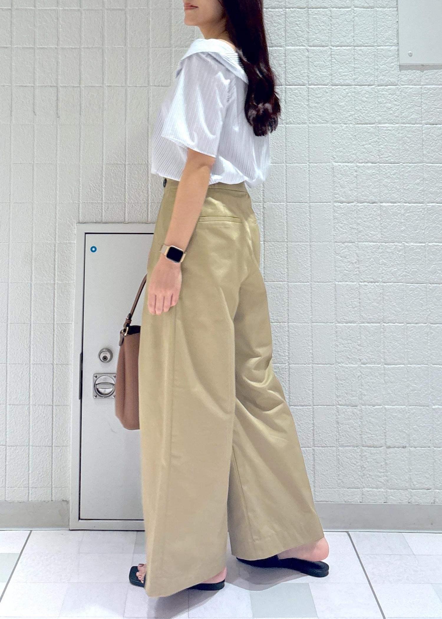 ボタンデザインとタックでウエスト細見え効果もあり、ワイドですがスッキリ見えます◎ -